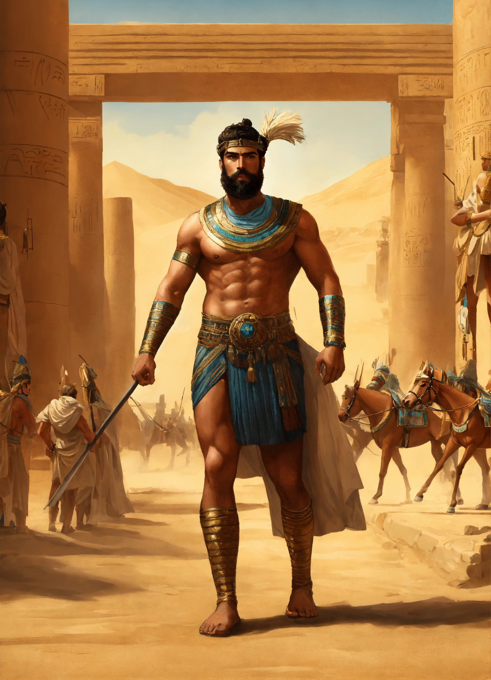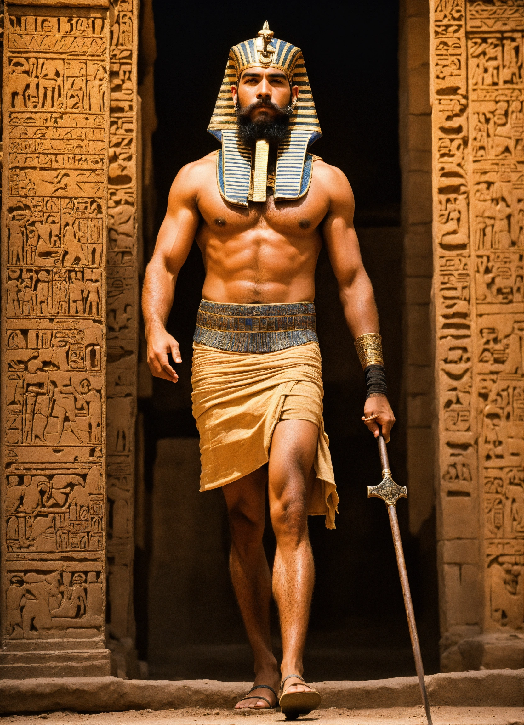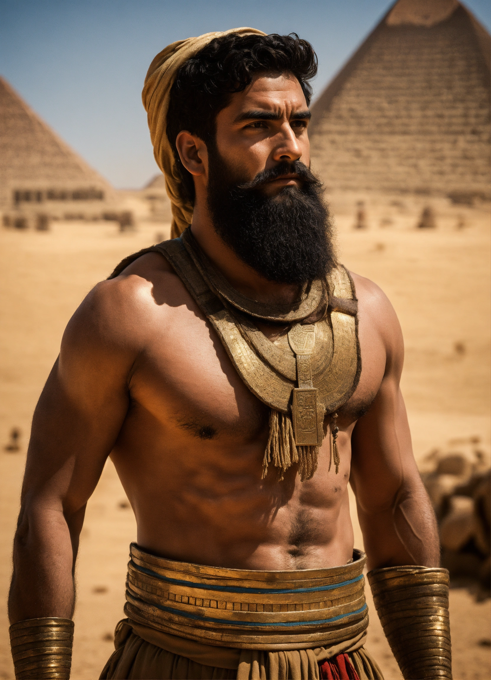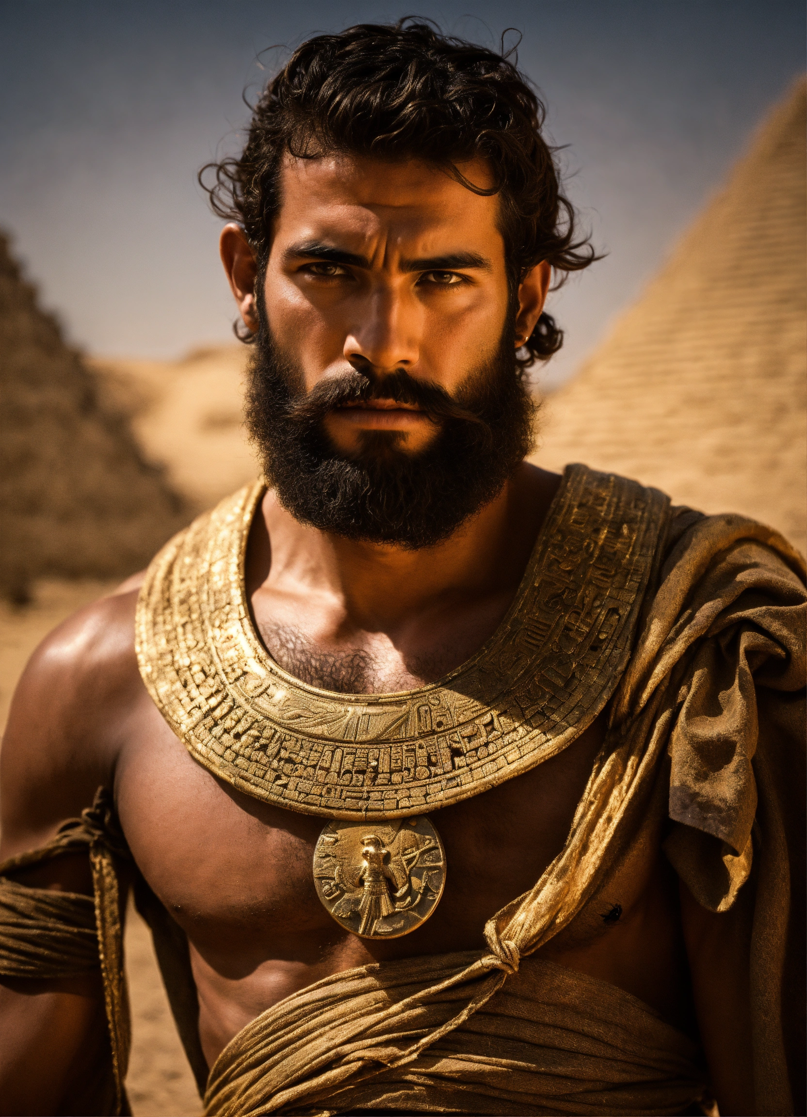 Hombre musculoso en el antiguo egipto caminando por las arenas como un ermitaño, es un faraon, con barba y muy apuesto