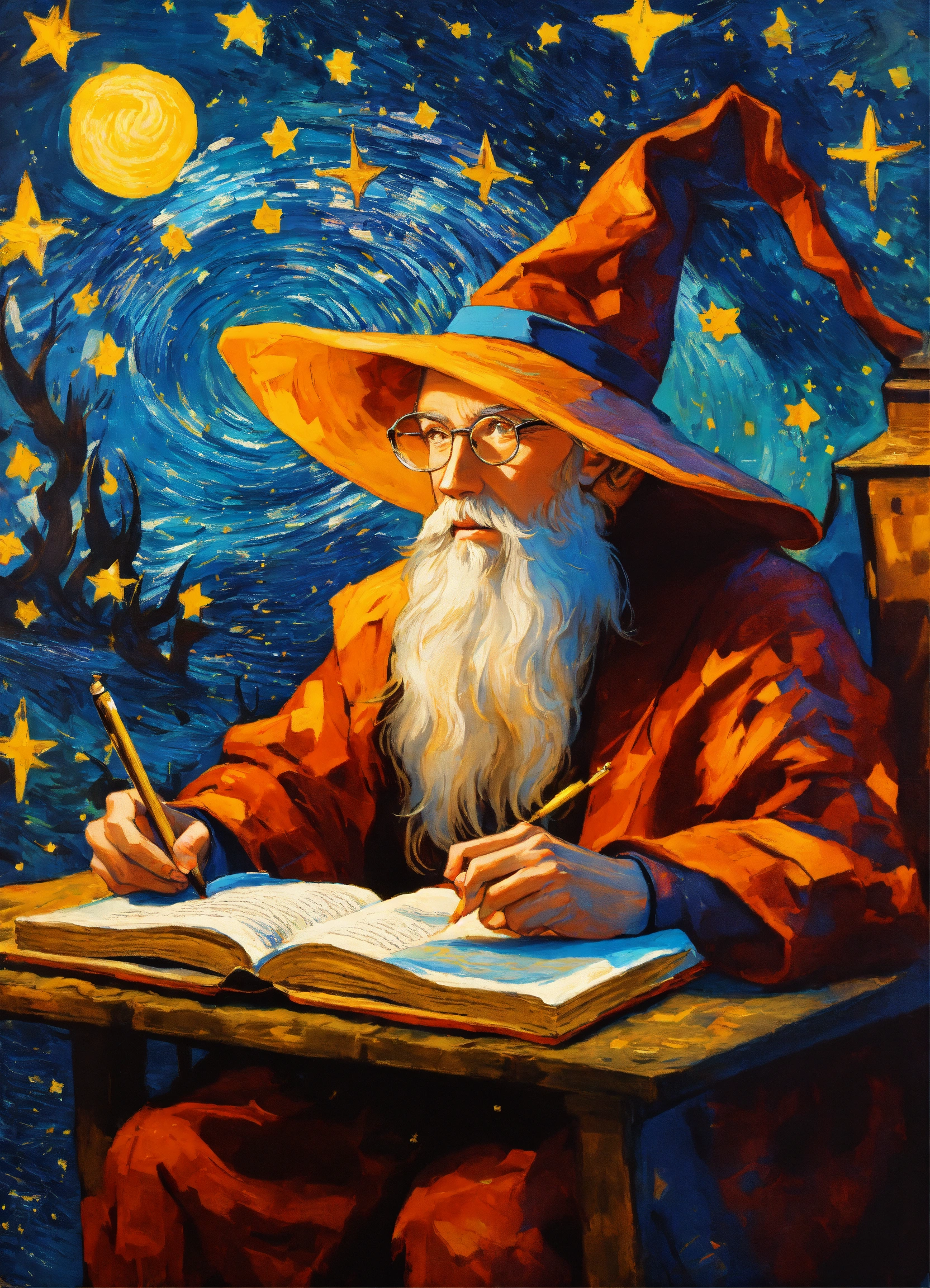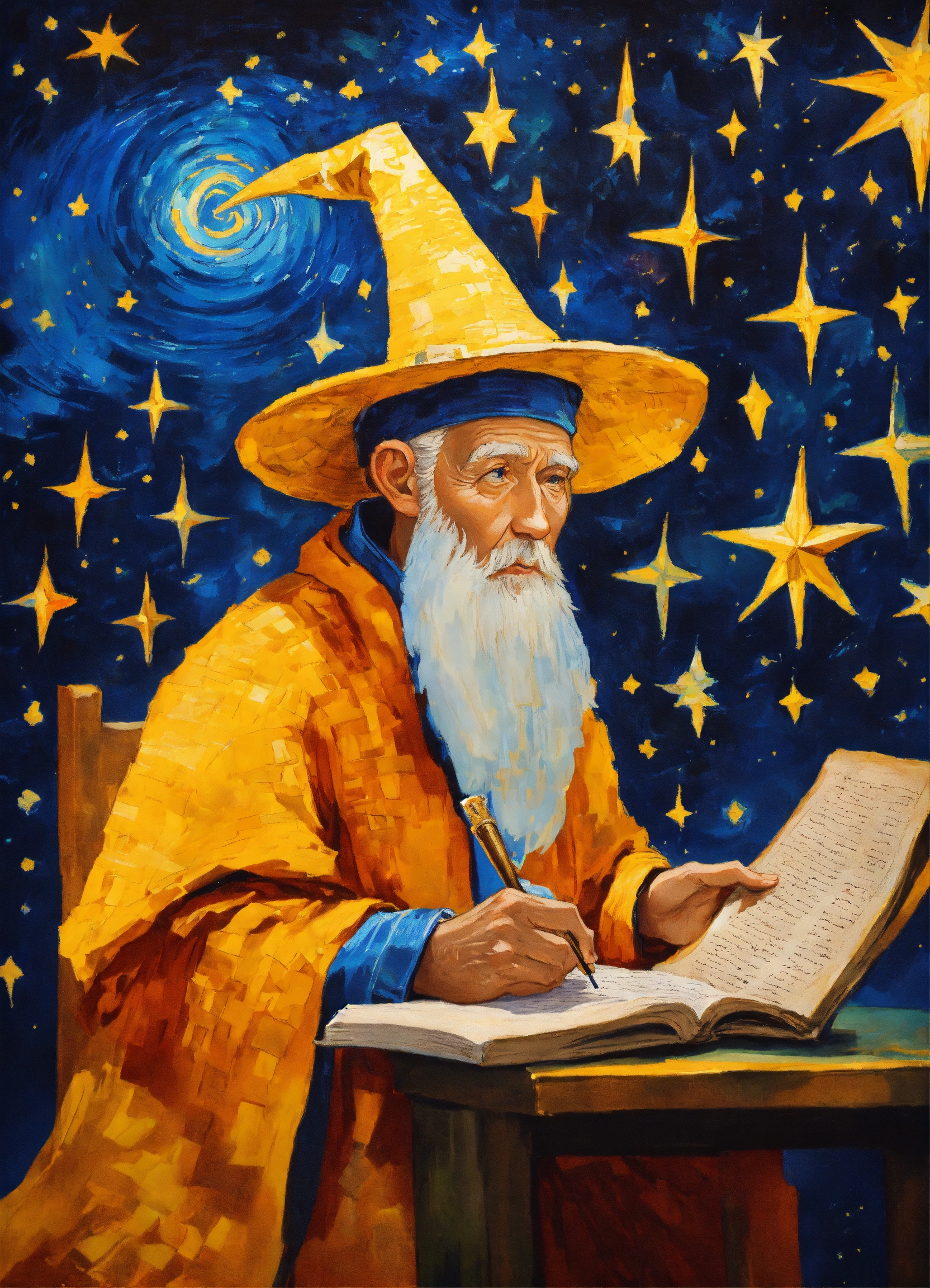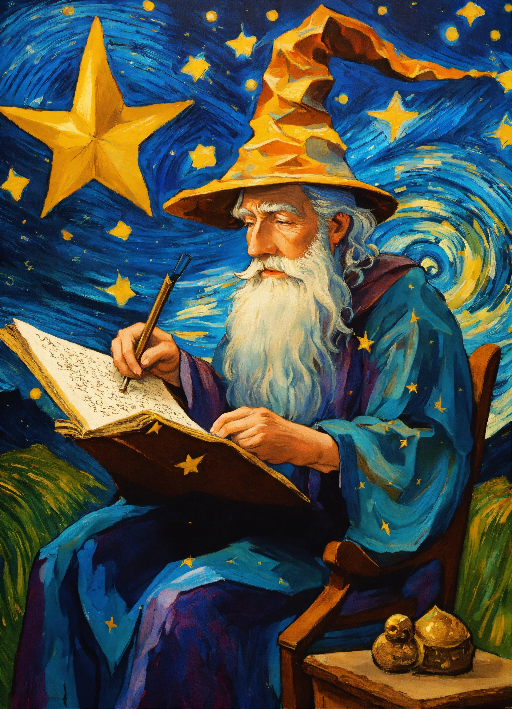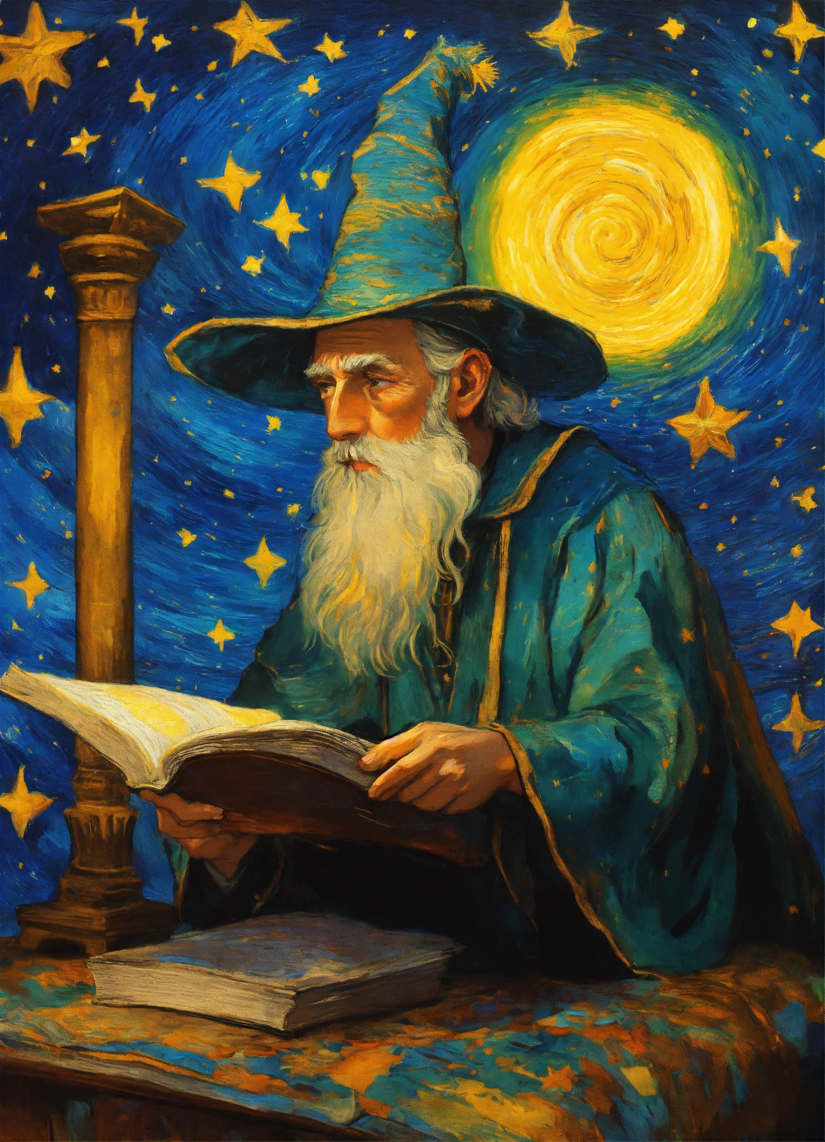 Wise old wizard wearing a wizard hat with stars studying ancient scrolls looking at the stars, van gogh vibrant colors
