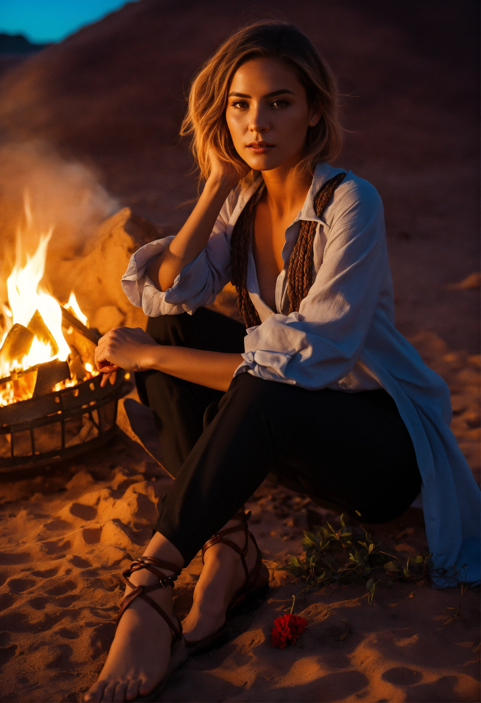 Magazine cover variant, variant night photo on a trip to morocco, high quality 16k night photo, creates full length wide angle color photography, with full length framing, variant 30 year old french woman, with an open cotton voile shirt, black pants, color variations, using the light of the campfire in a brazier, with suspenders, with leather pataugas on the feet, red and braided hair.
