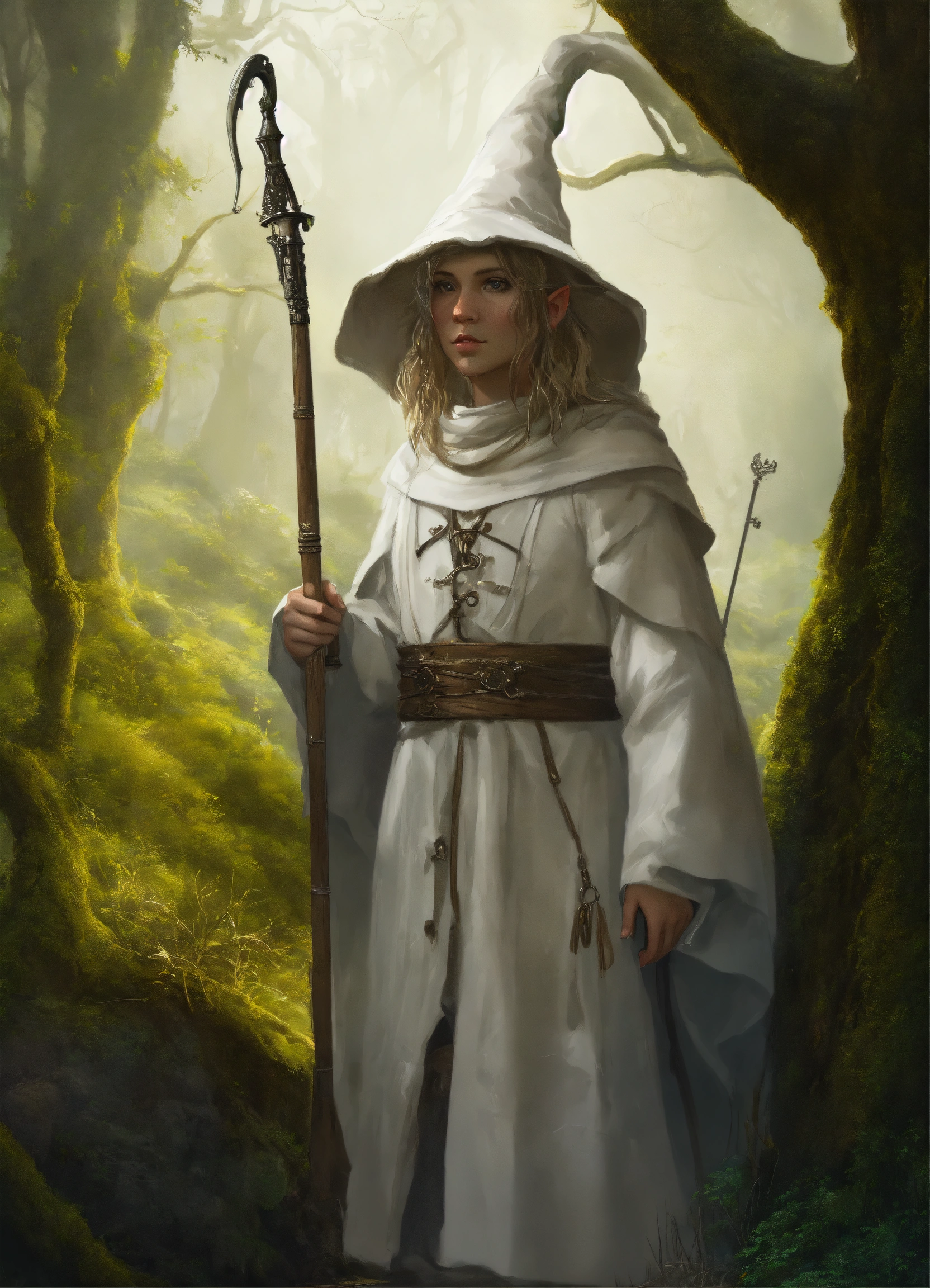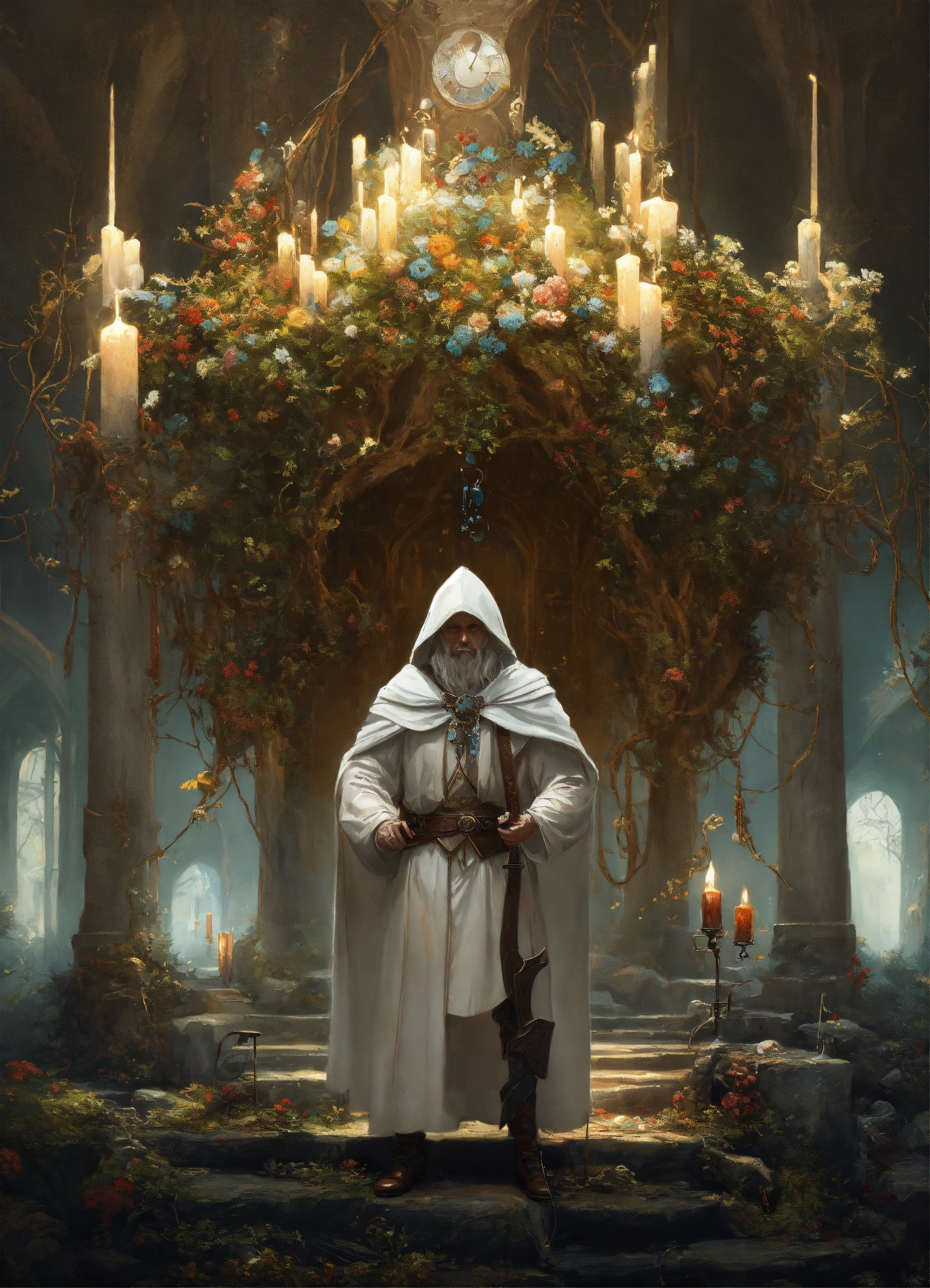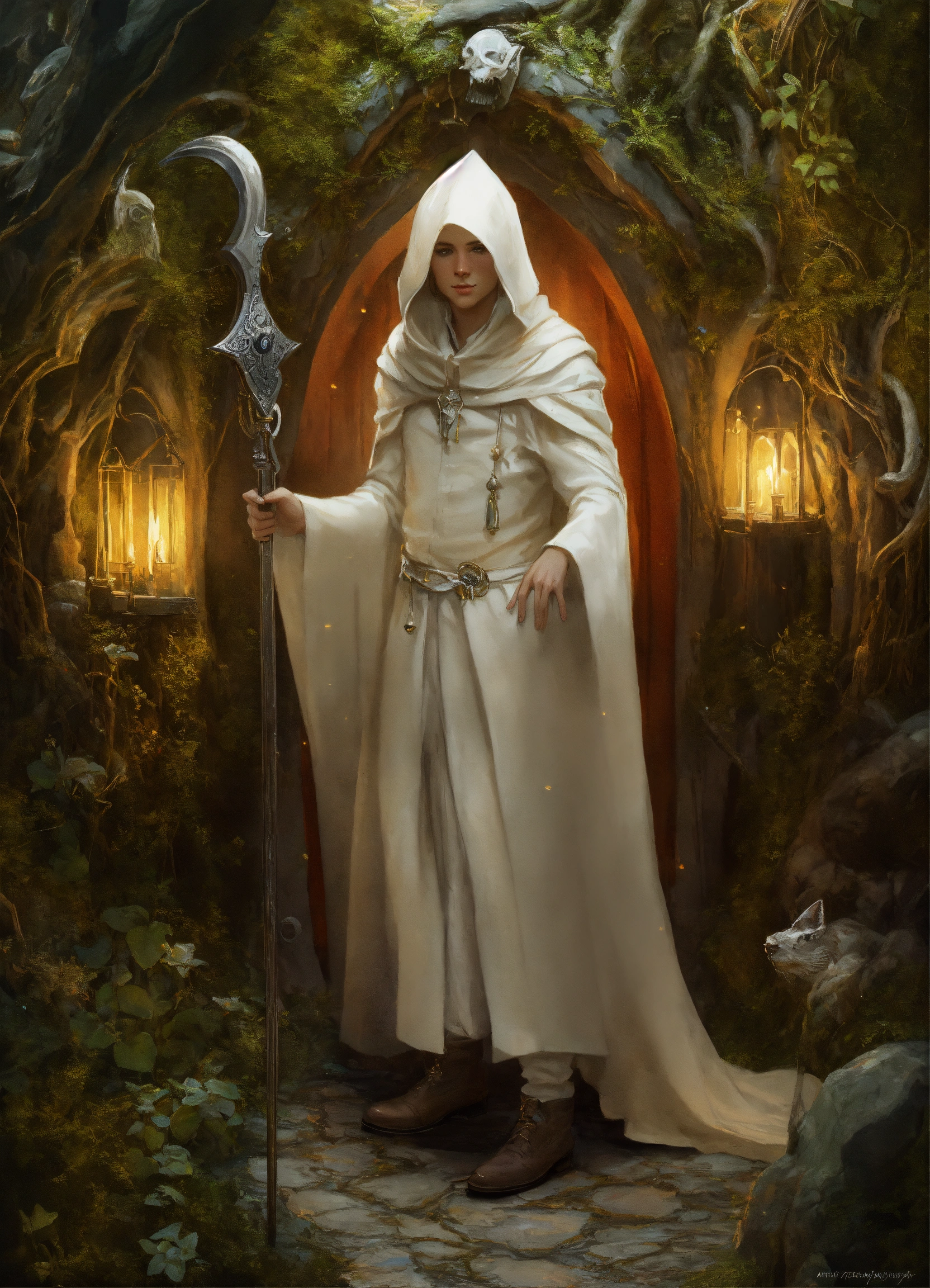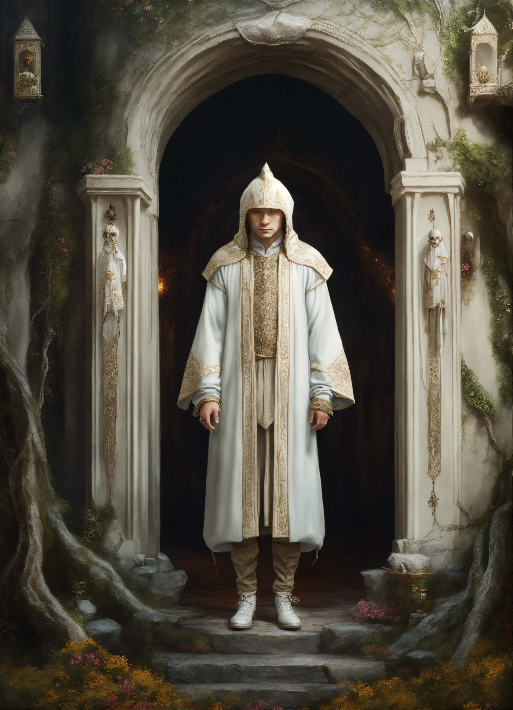Kleines weisses mänchen mit einer kaputze und hobbit füssen gruselig creepy full body white shot, digital painting, highly detailed, concept art, artstation, intricate, sharp focus, concept art, surrealism, surreal art, surreal, artwork