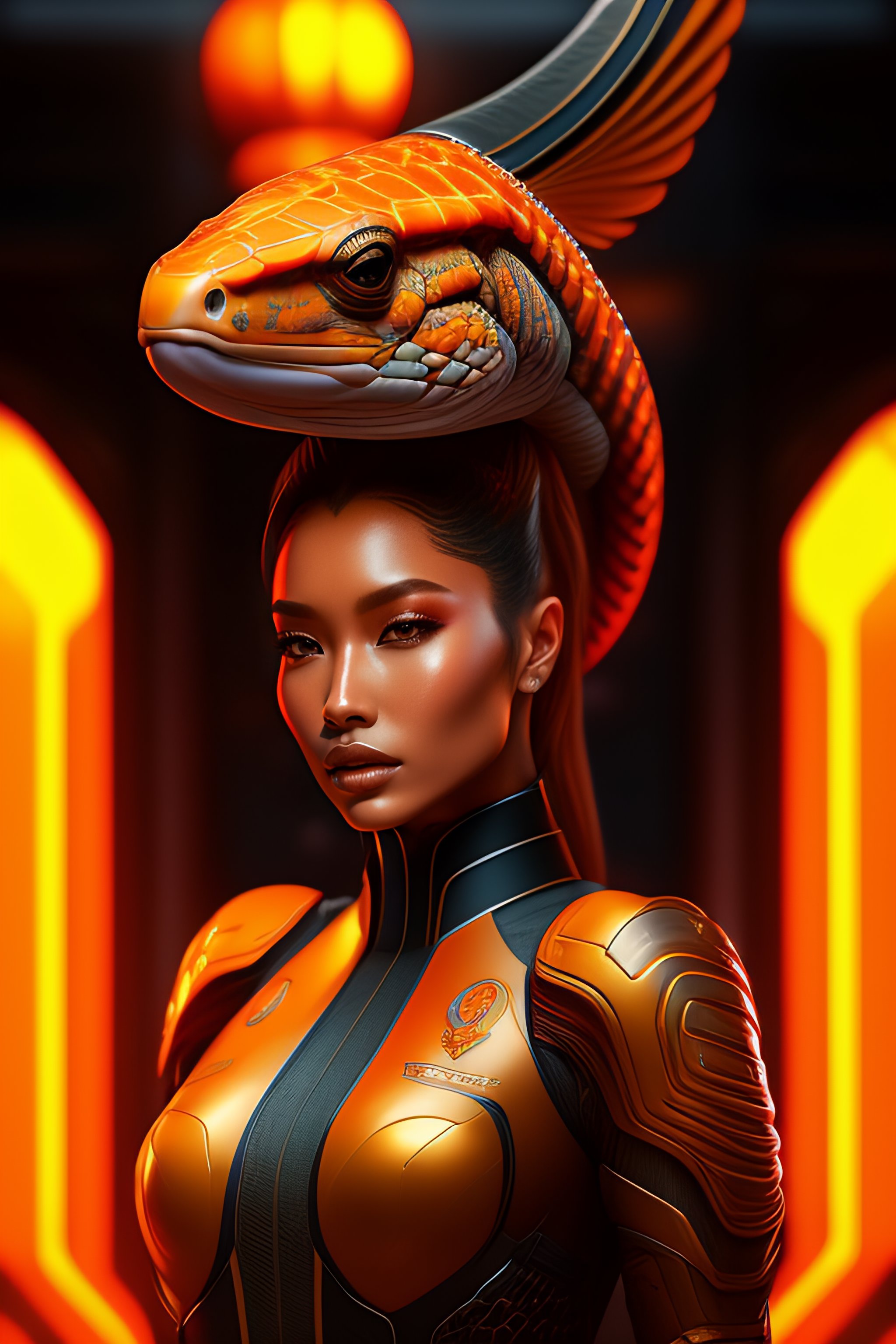 Portrait of a cybernetic orange snake a spiritual full body tortoise, sunburst arround head, deadly face with power armor, ultra realistic, concept art, intricate details, eerie, highly detailed, photorealistic, octane render, 8 k, unreal engine. art by artgerm and greg rutkowski and alphonse mucha