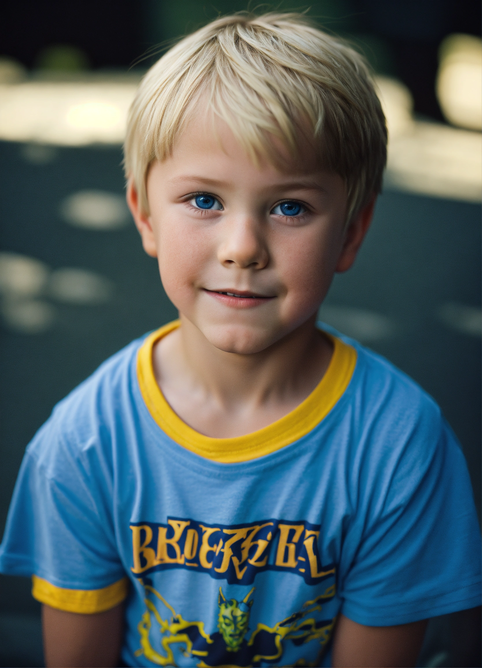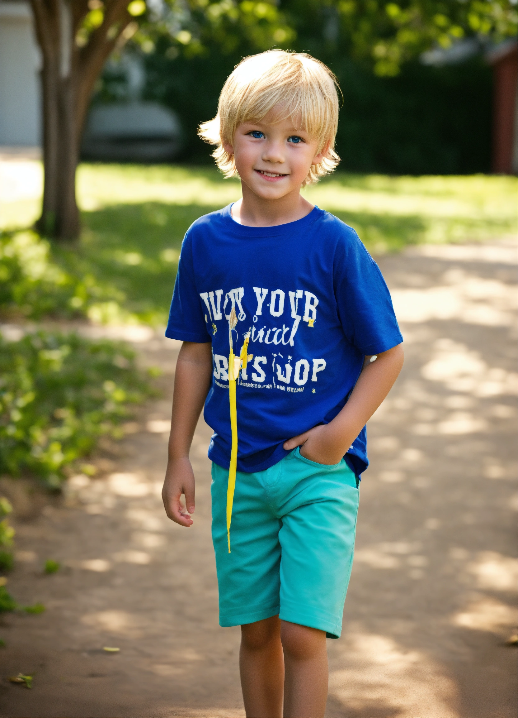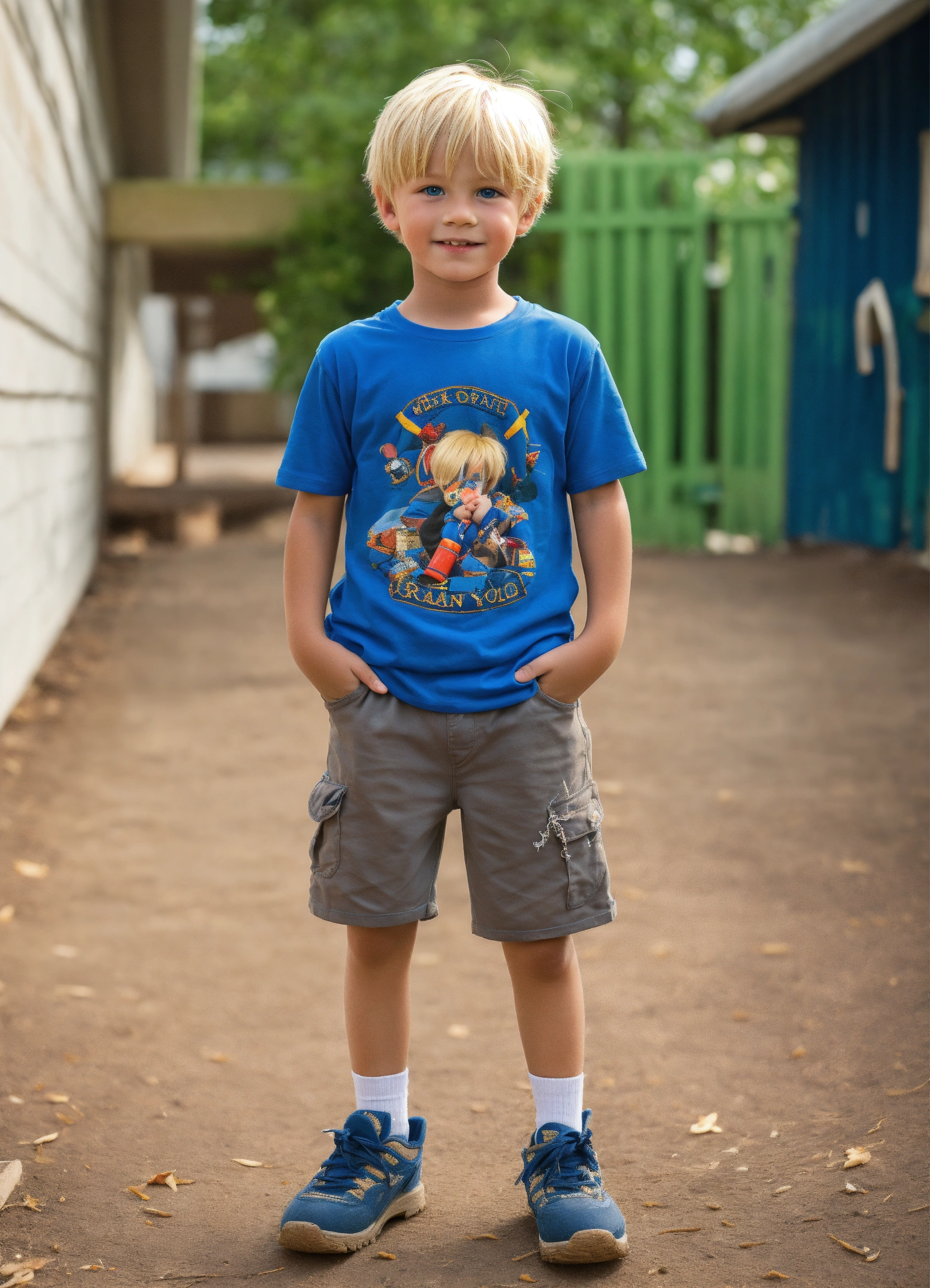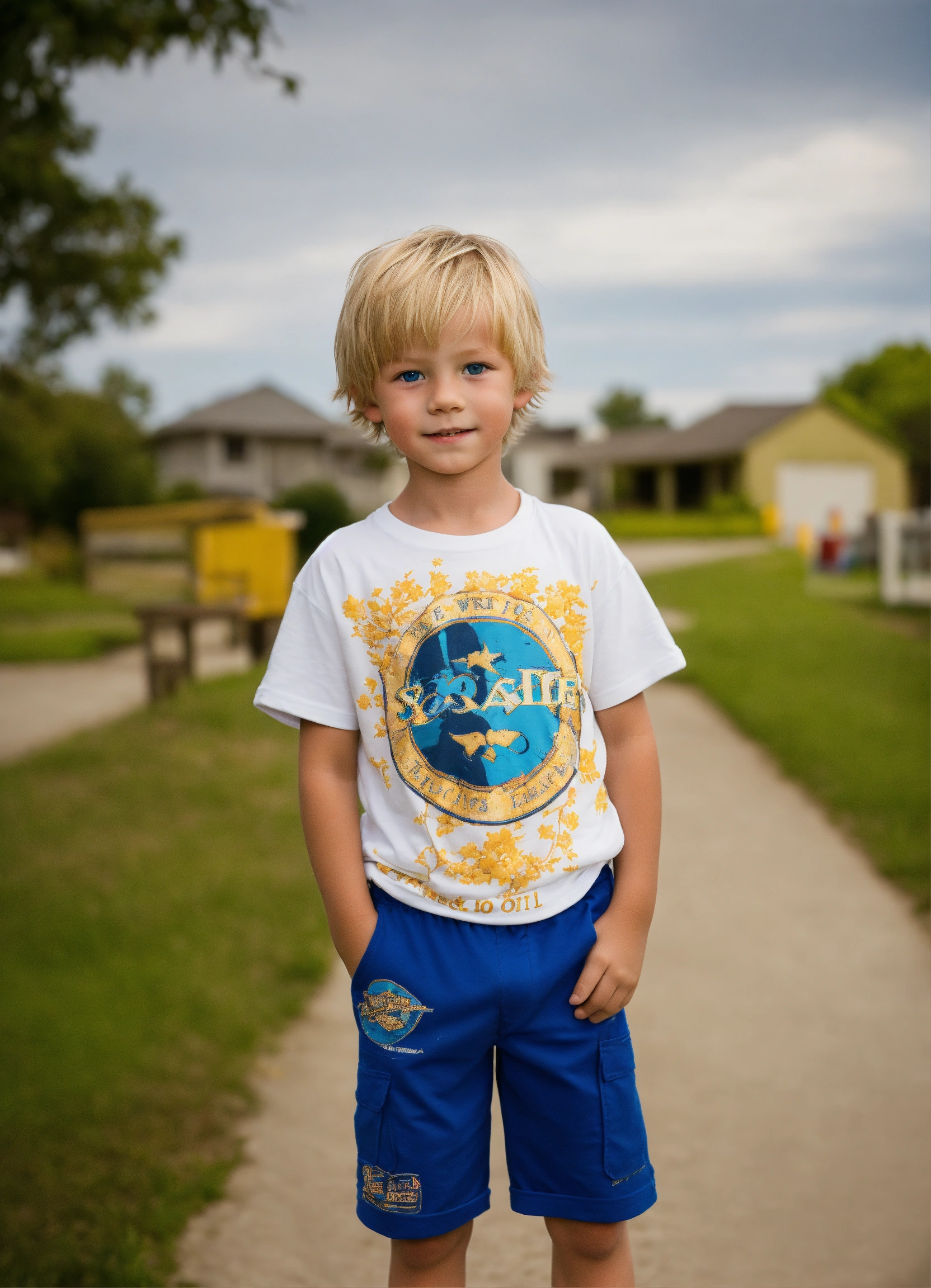 Photo of a 6-year-old boy, blonde, brat, obnoxious, wicked, best quality, t-shirt, shorts, short hair, blue eyes, adorable, spoiled