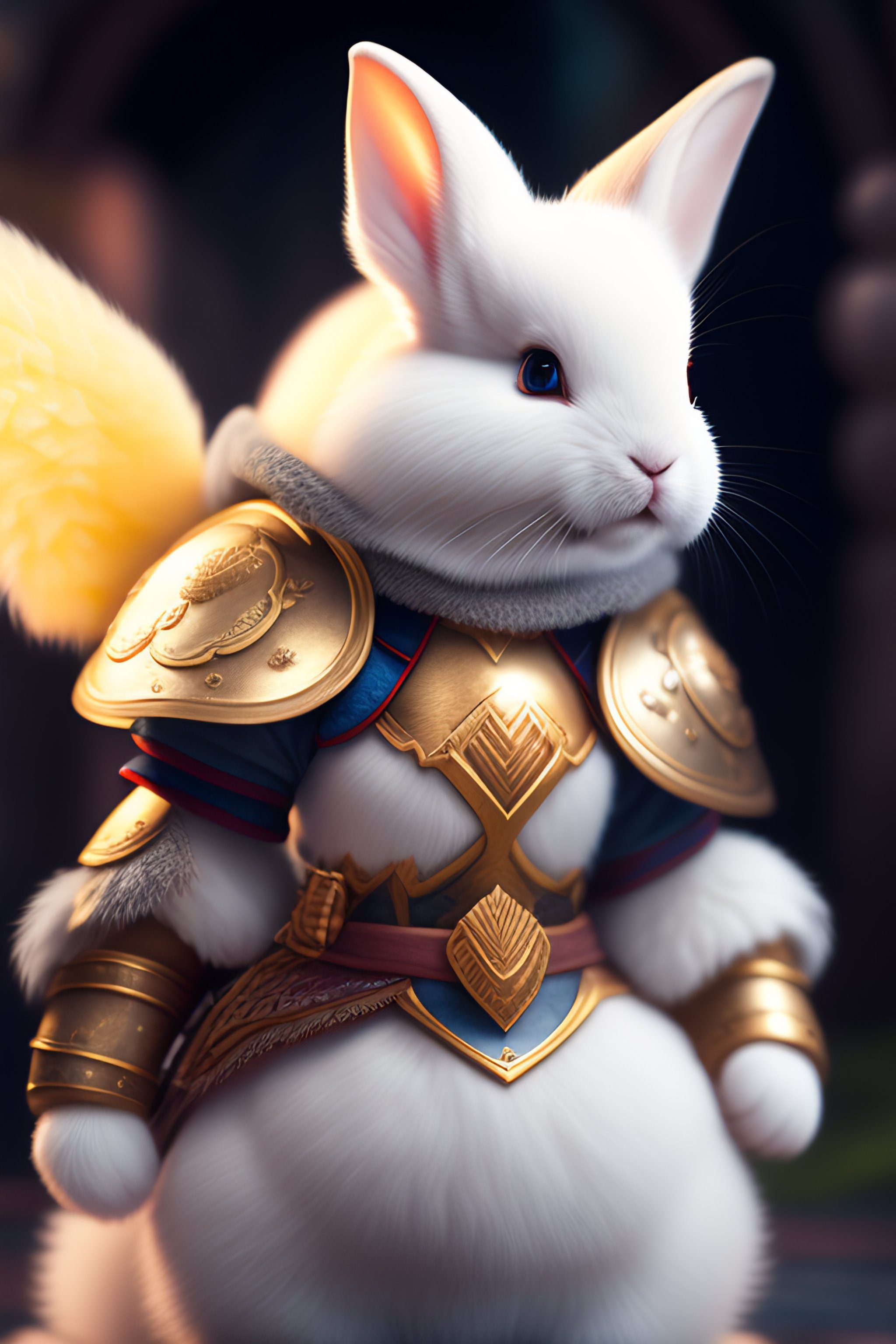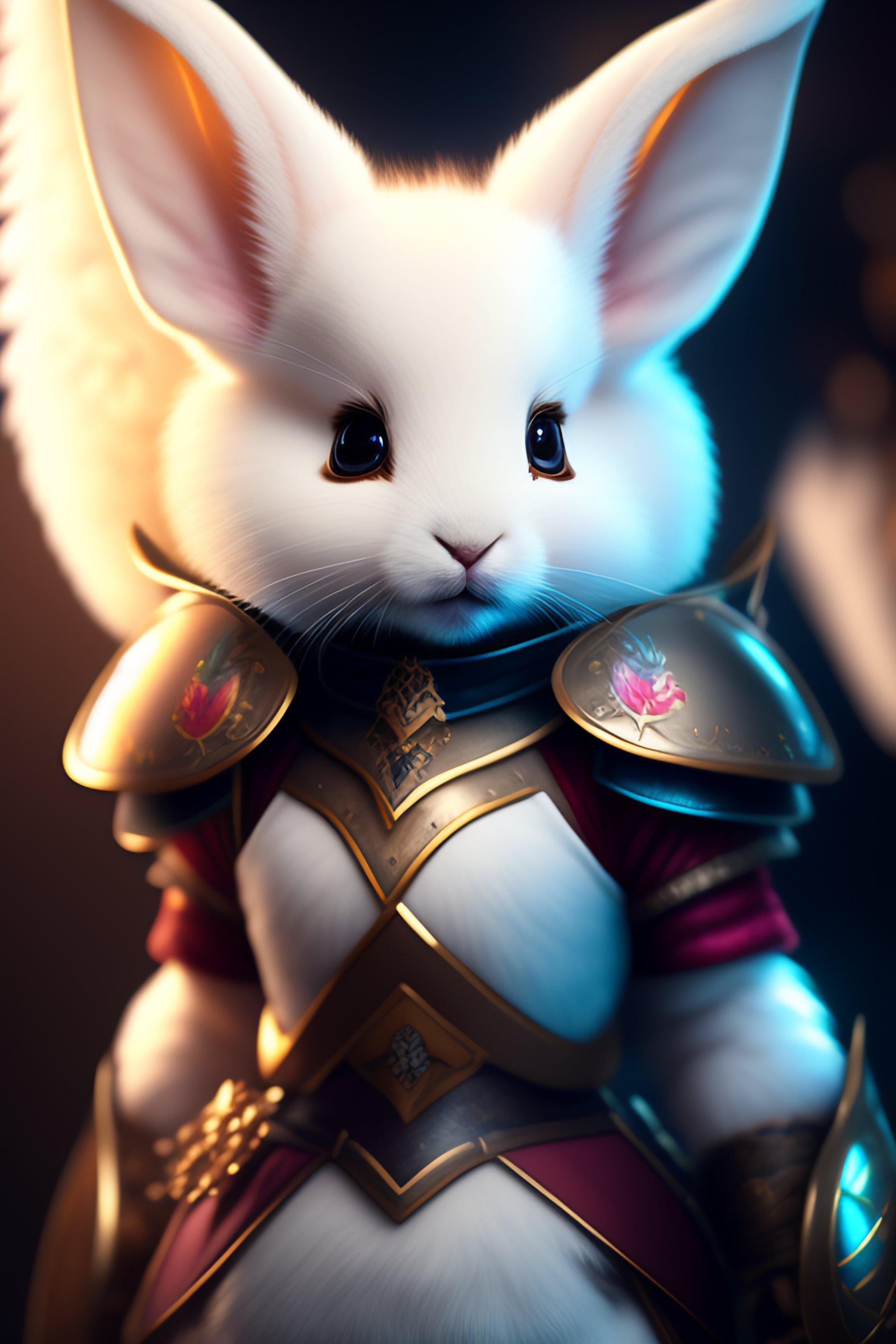 Dynamic photography of a cute fluffy white female rabbit as a fighter wearing armor, pixar character, cute lighting (high definition)++, photography, cinematic, detailed character portrait, ++detailed and intricate environment ++, detailed and intricate environment