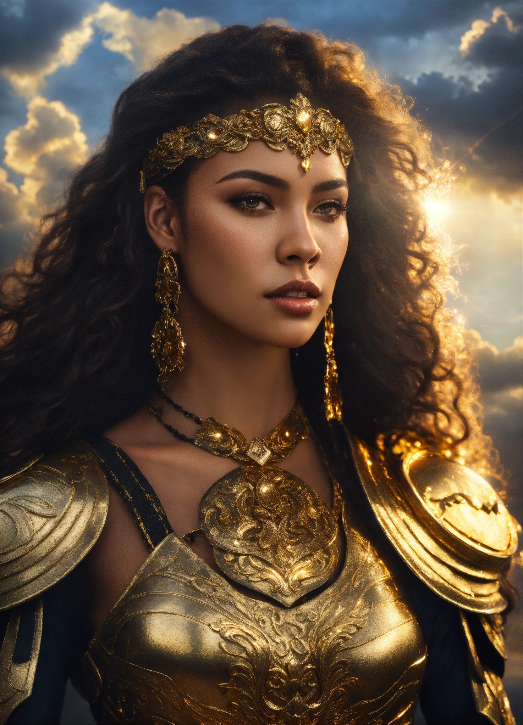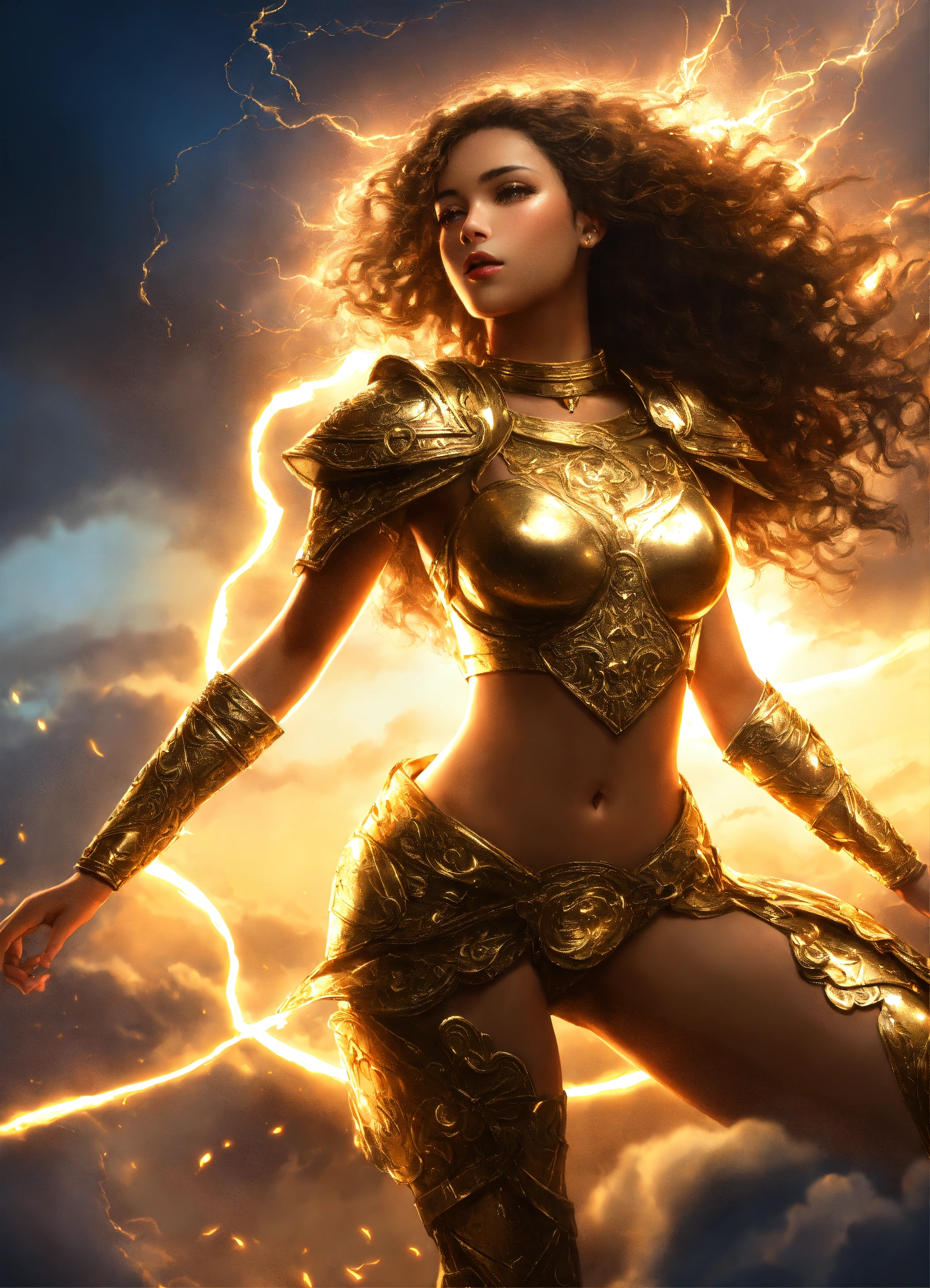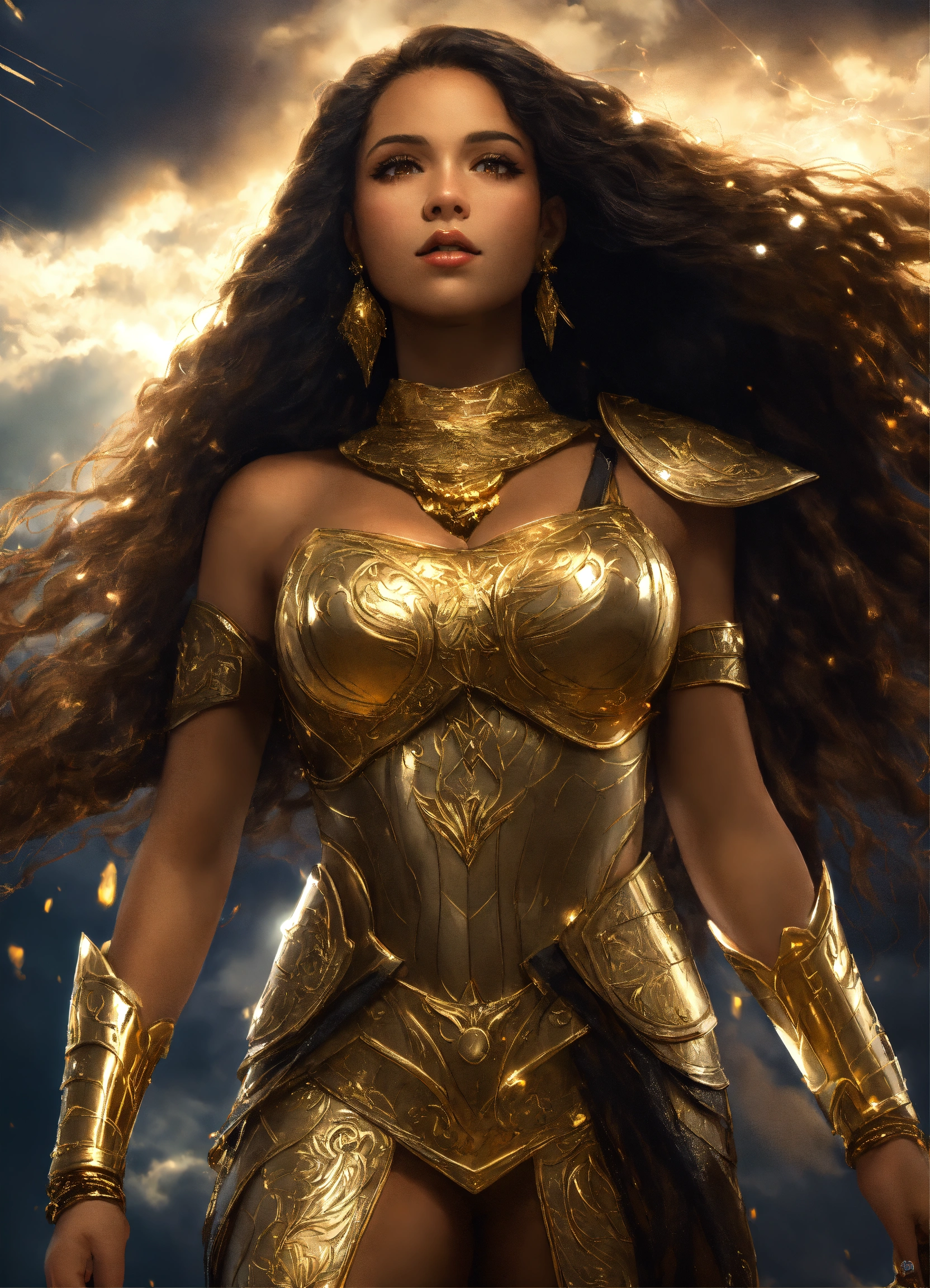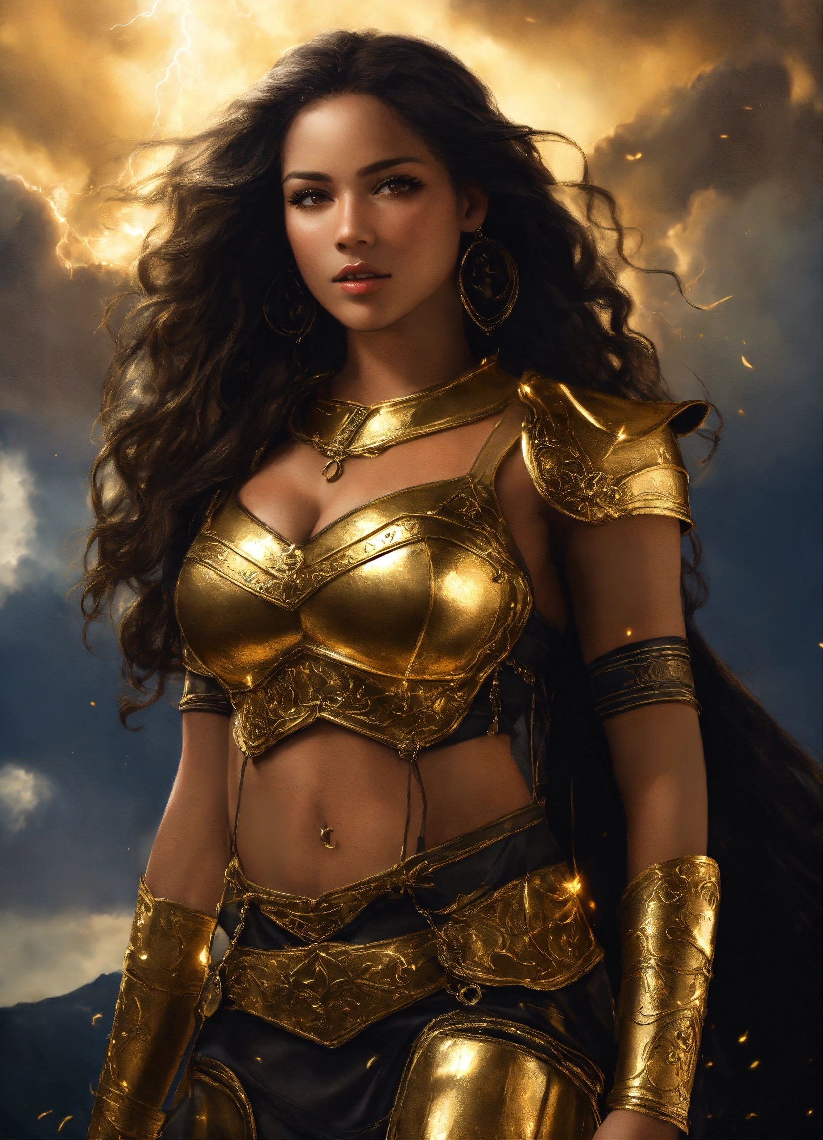 Full body beautiful mixed race amazon goddess with light brown skin, beautiful gorgeous g-cup goddess mixed race woman with light brown skin, beautiful perfect face, shapely hour-glass figure long flowing hair, fully clothed in gold and black armor and gold accessories, she's floating in the sky with gold lightning and dark clouds behind him, high detail, realistic photo, high detail, digital painting, cinematic, stunning, hyper-realistic, sharp focus, high resolution 8k, insanely detailed