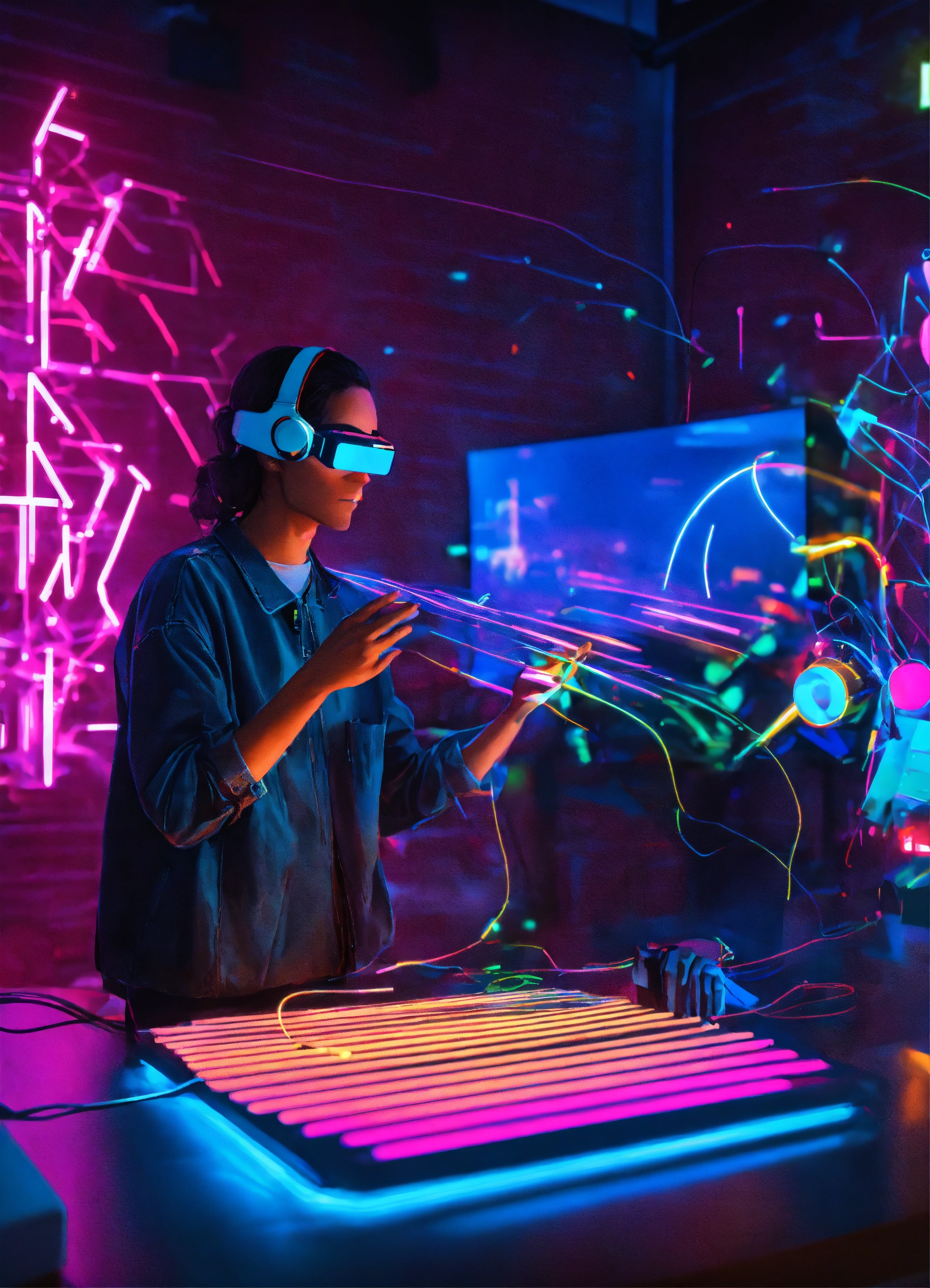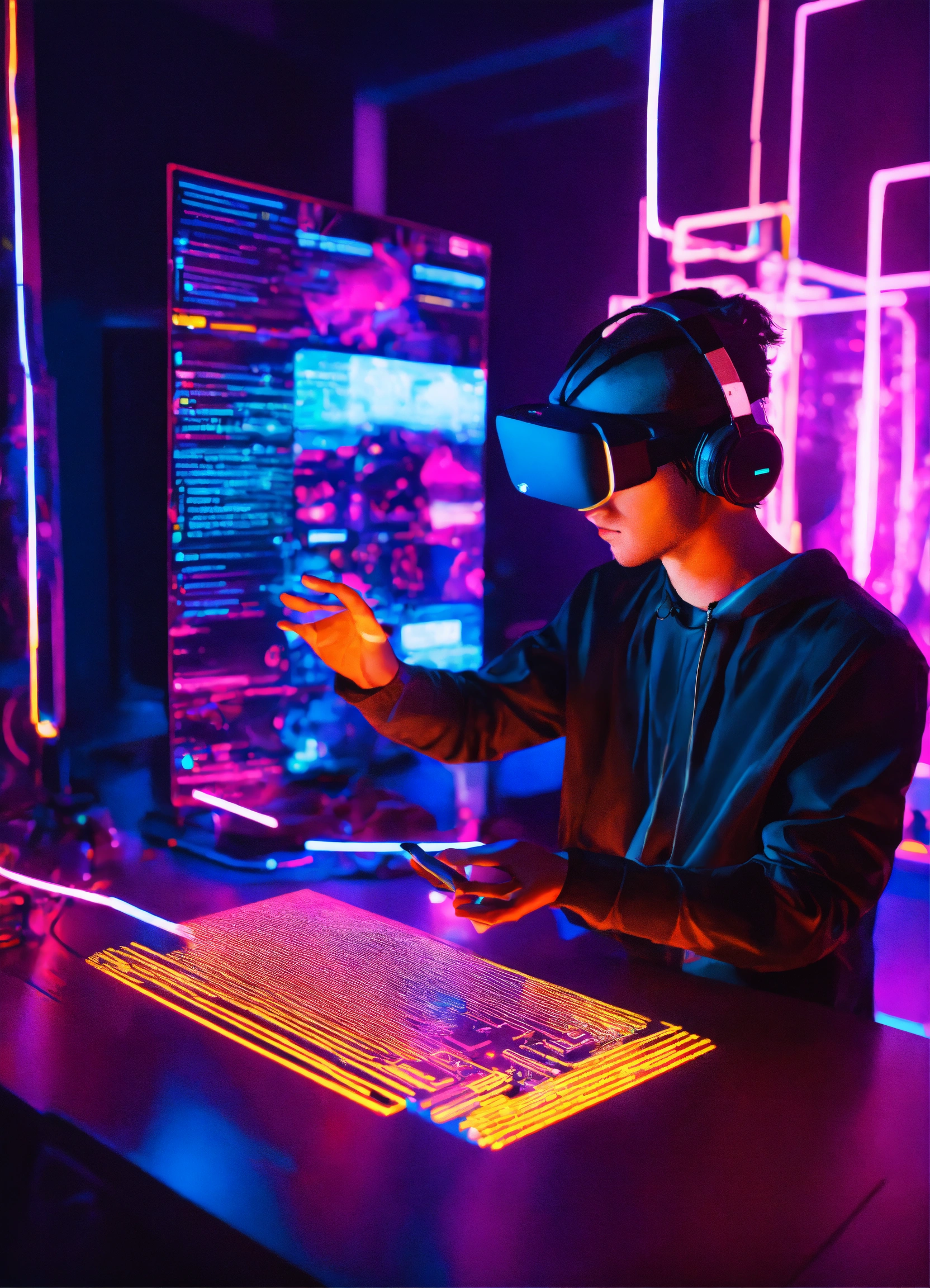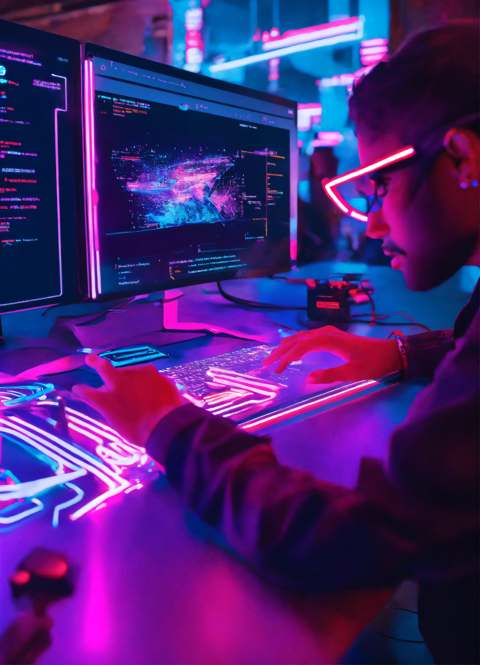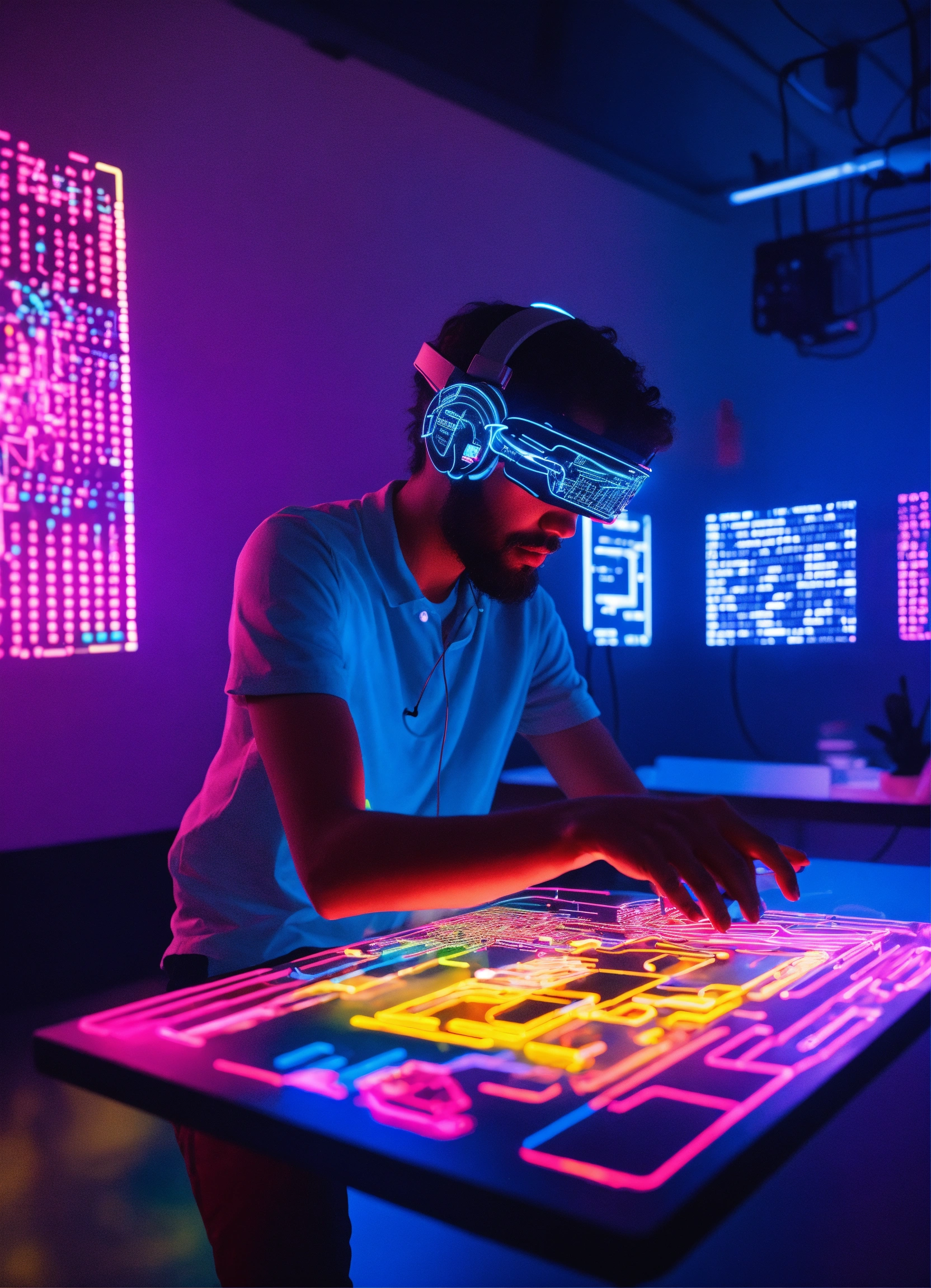 A person interacting with codes with their hands in a mixed reality in a neon vibes