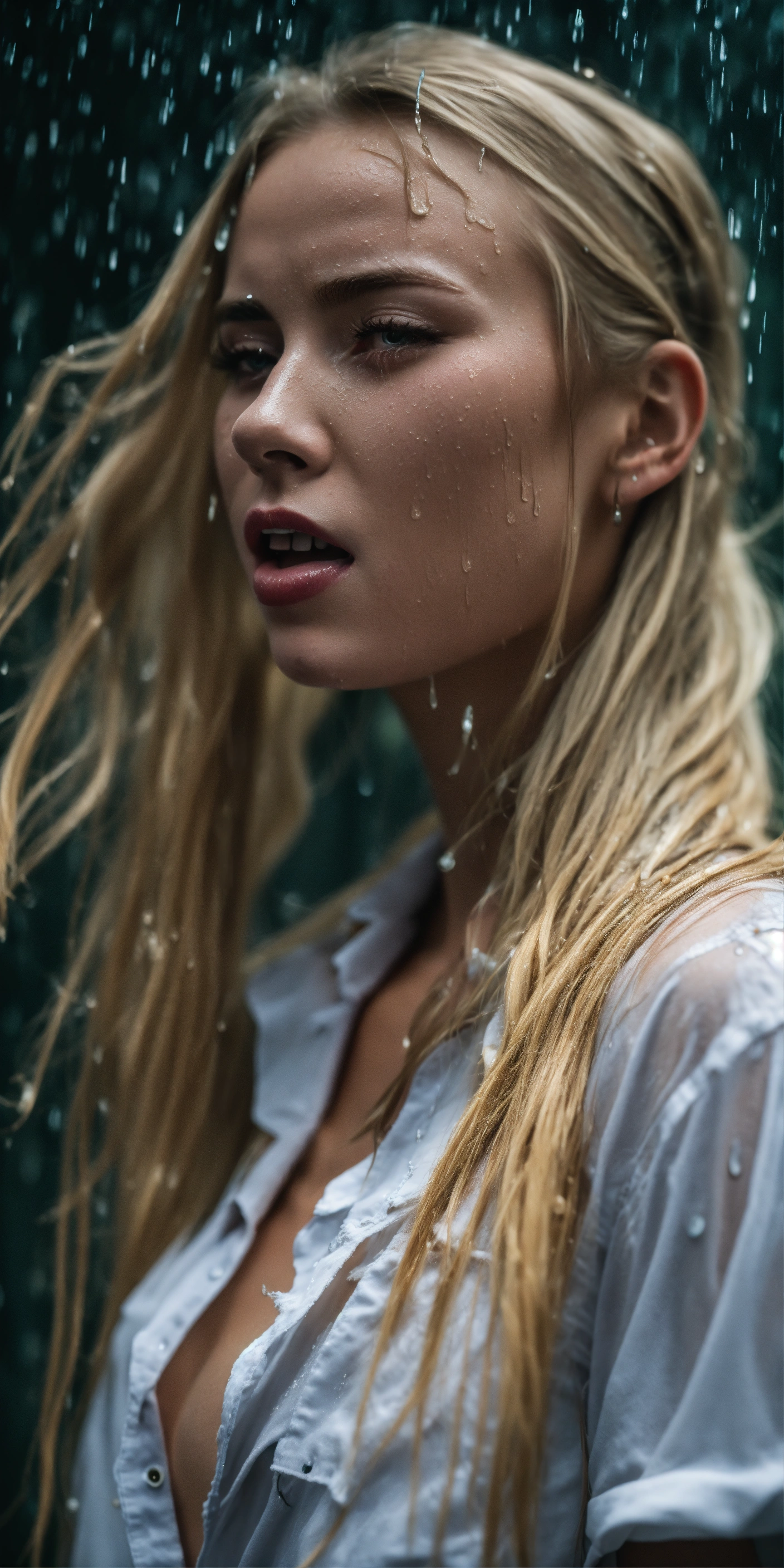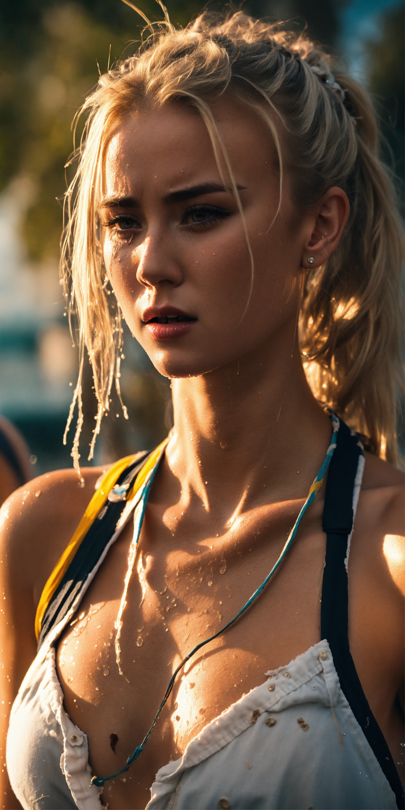 Full body, standing, gag, swimwear, shiny, wet messy long hair, prepubescent, unbuttoned tattered torn dress shirt, tube socks, crying, screaming, crying, distressed, three gorgeous young, ponytail blonde hair, white woman, pale skin, fitness influencer, highly detailed, dramatic shoot, sharp focus, 4k uhd, cinematic lighting, relaxed, beach