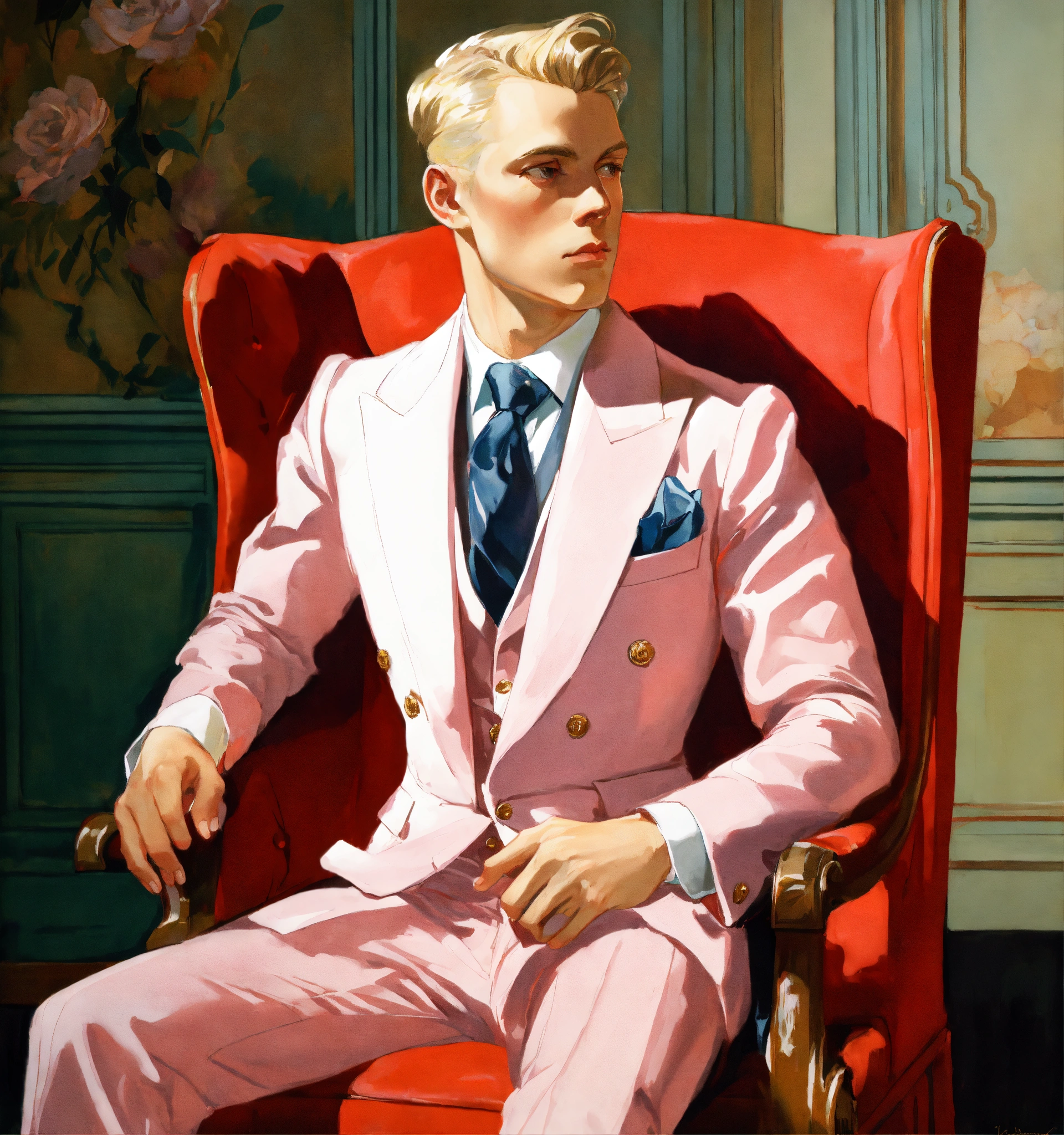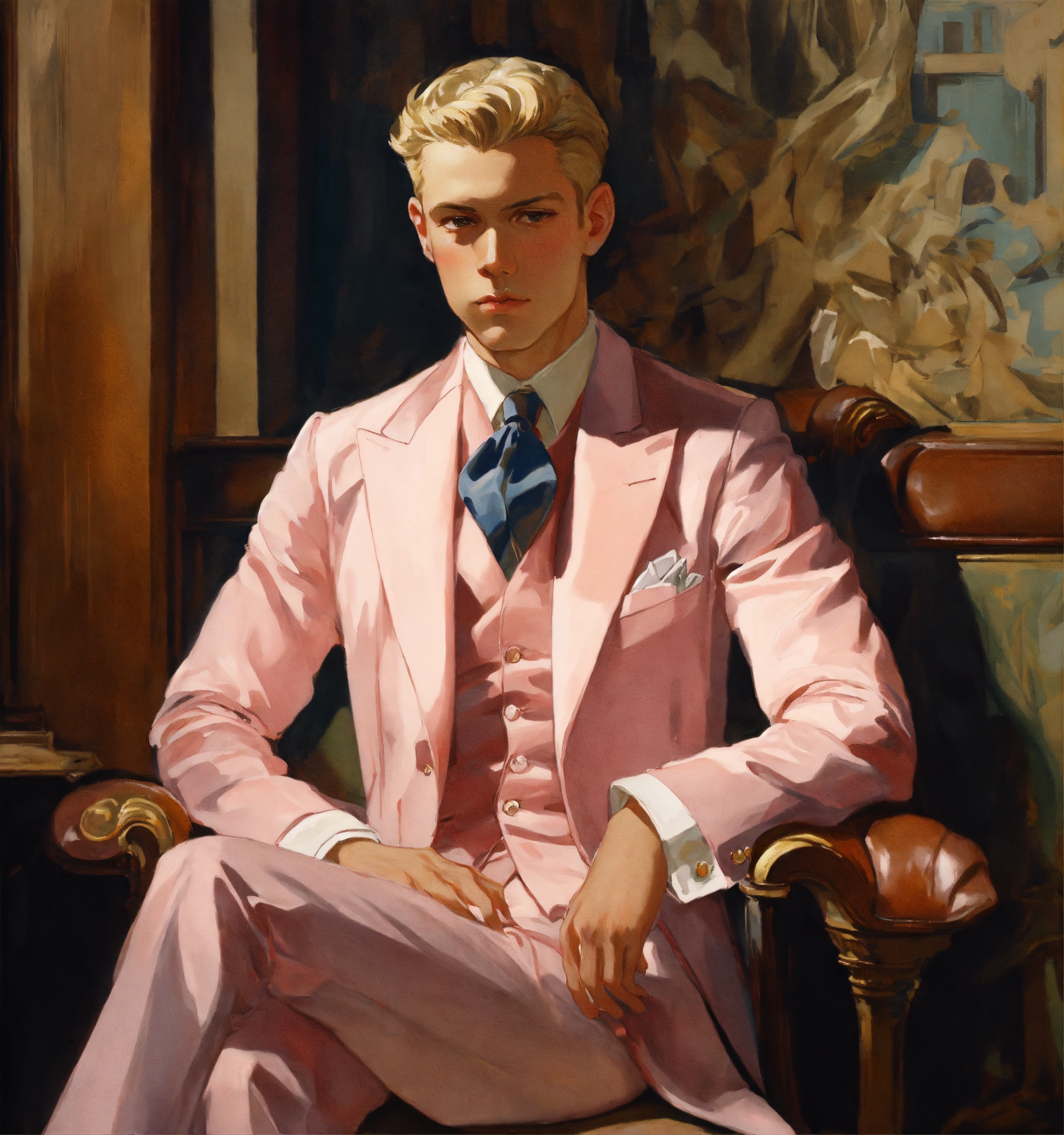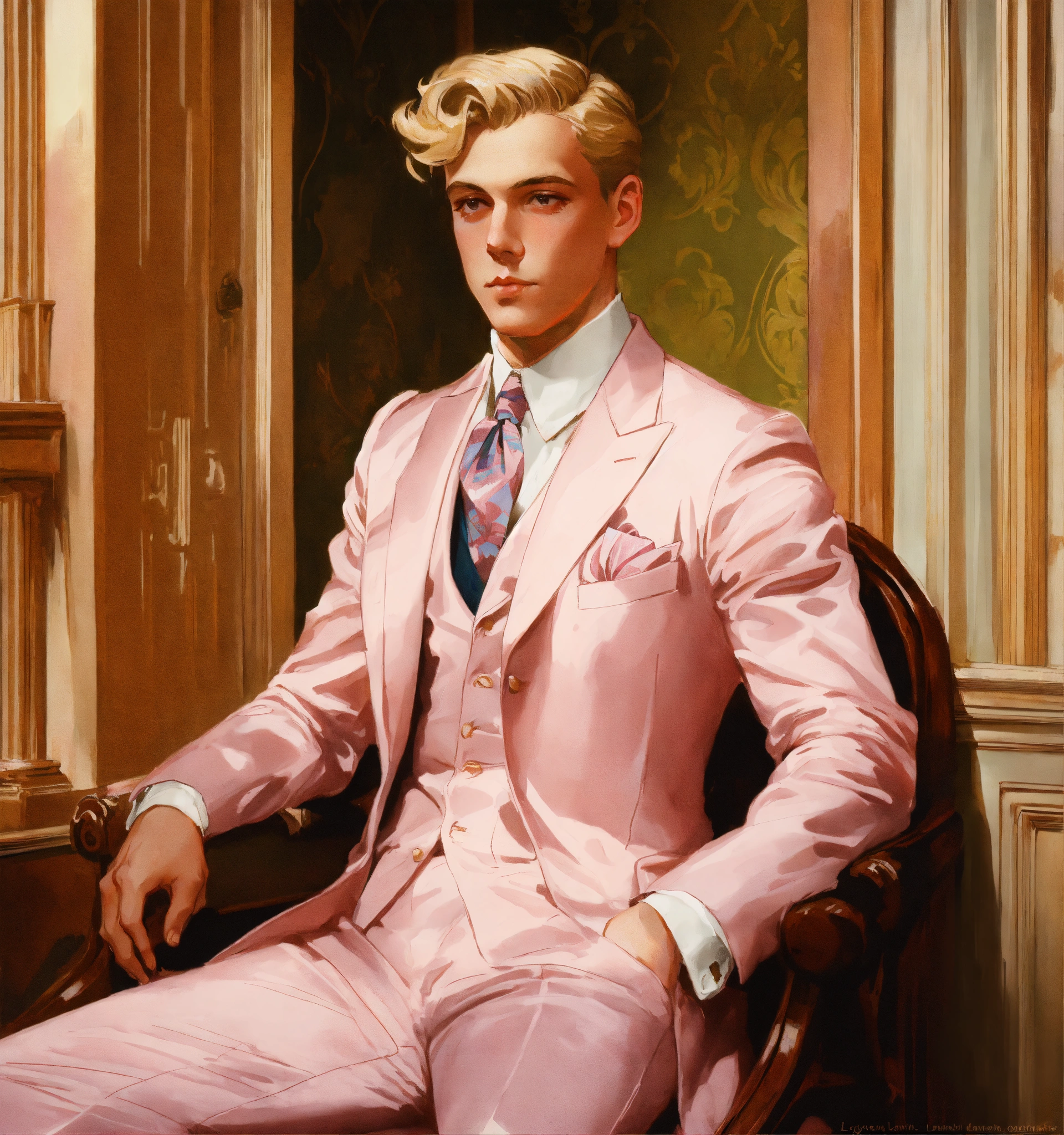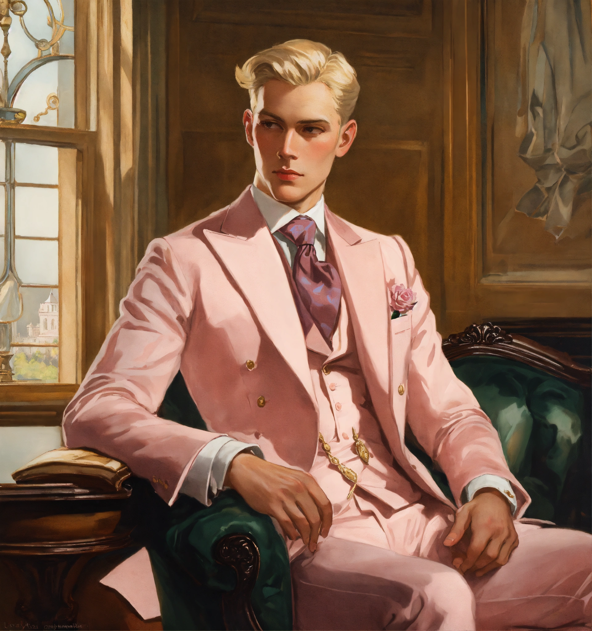 A pale blonde melancholic gentleman in light pink vested suit and tie, seating in an old manor, leyendecker style