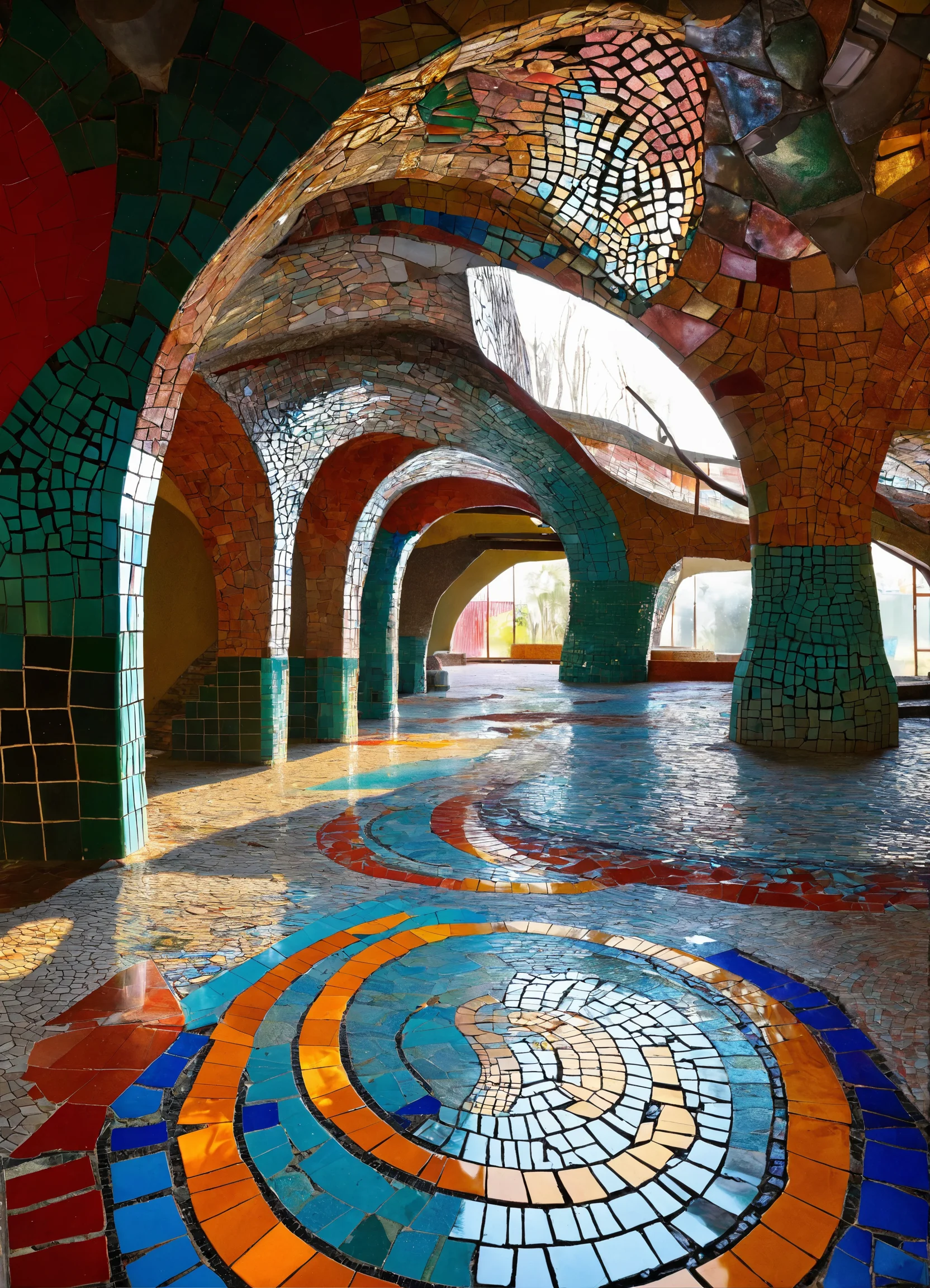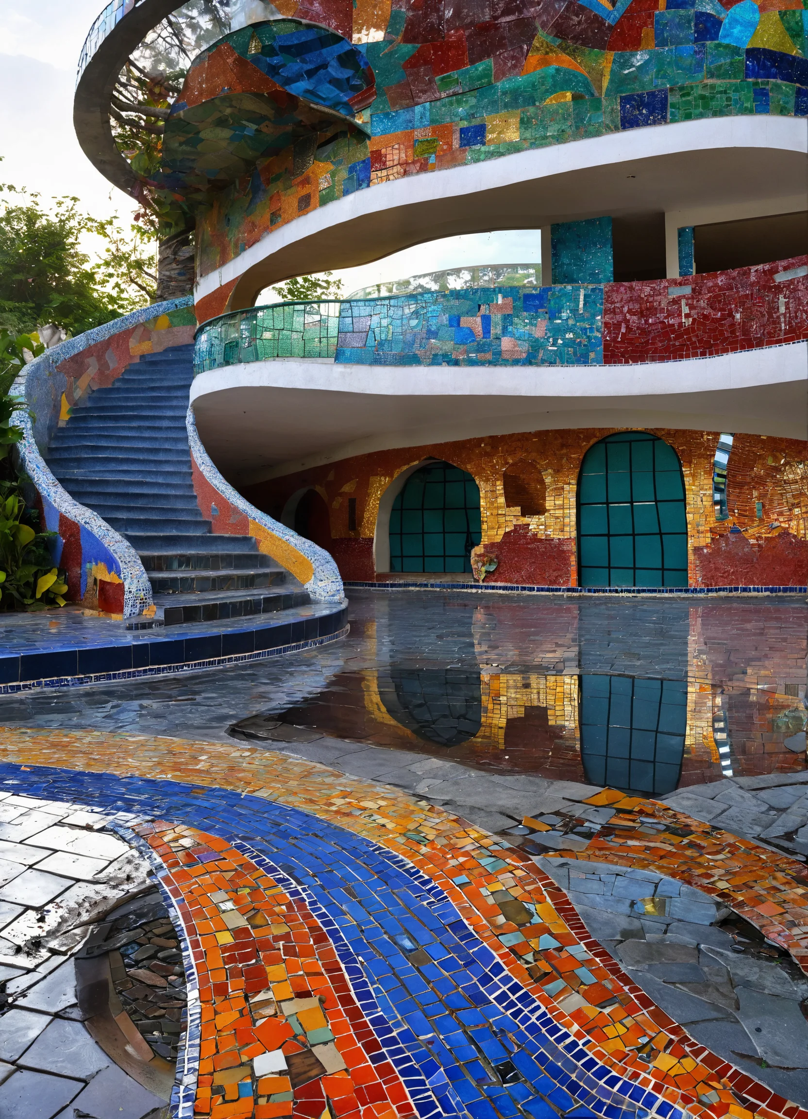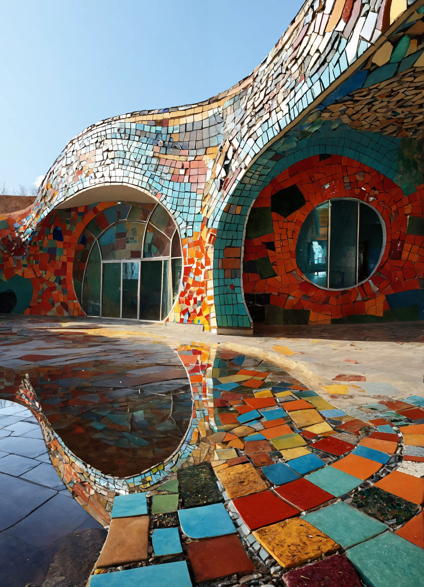 A unique, mosaic-covered community building. it is an inviting building with curvilinear shapes, walls adorned with colorful tiles. the wet ground reflects the mosaic's colors, creating a mirrored effect. the overall atmosphere is utopian, knowing a better world will be here someday.
