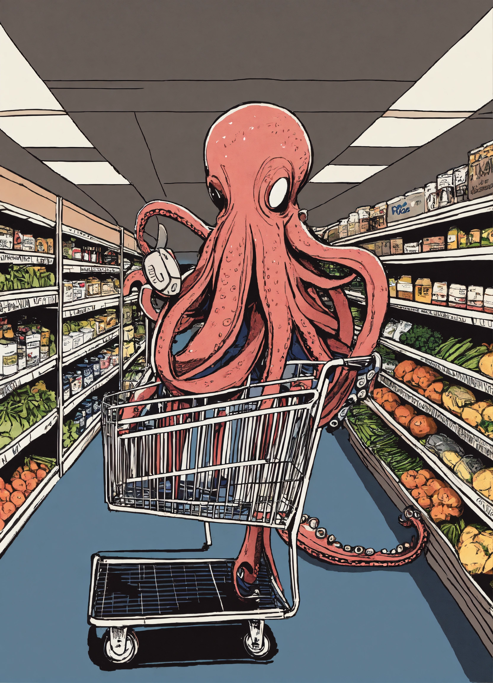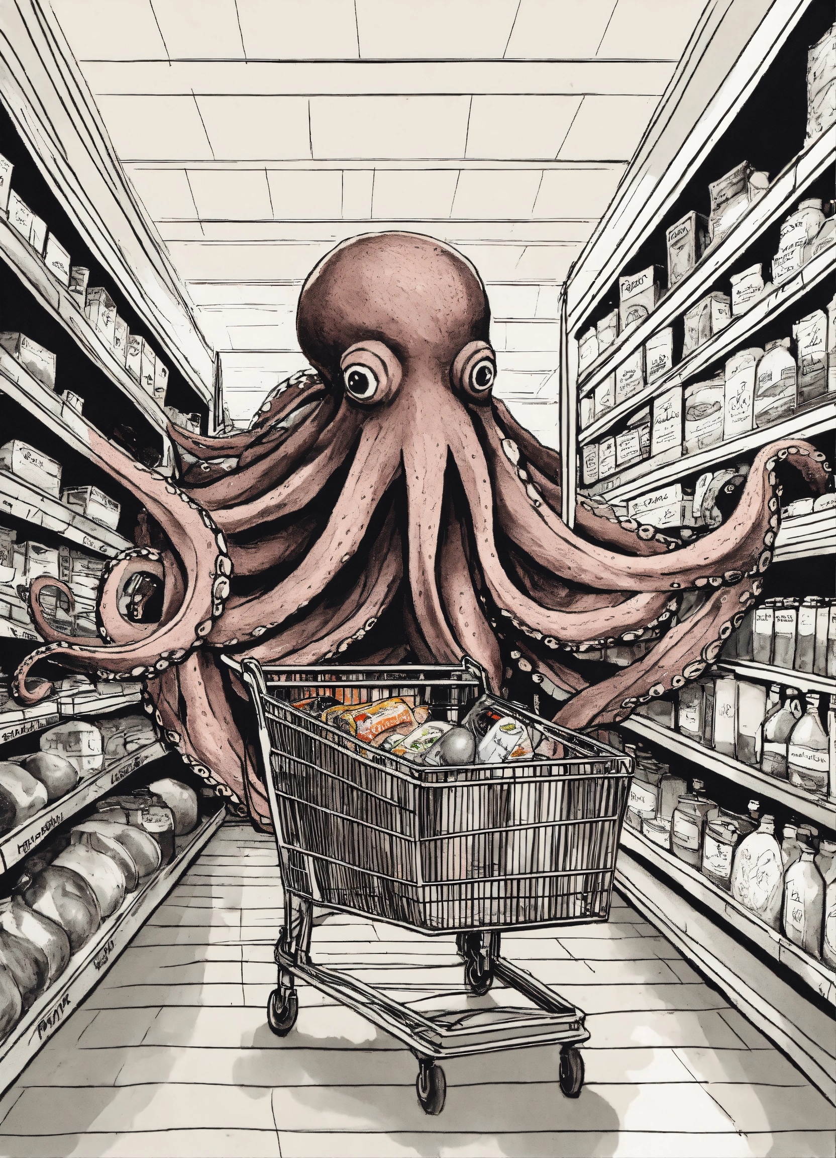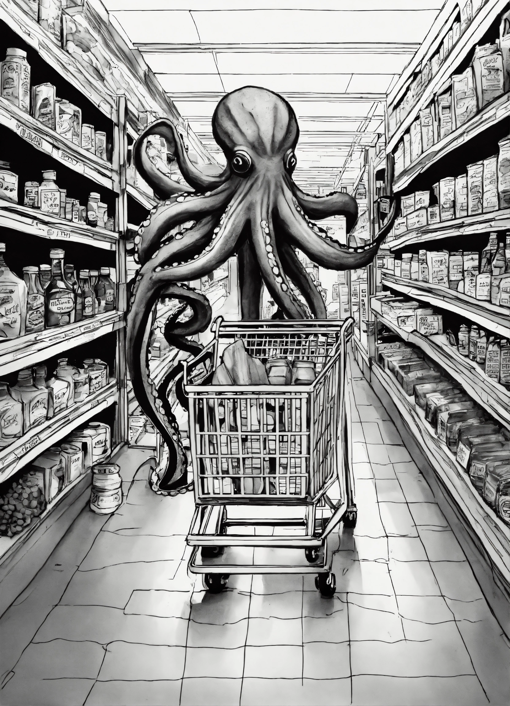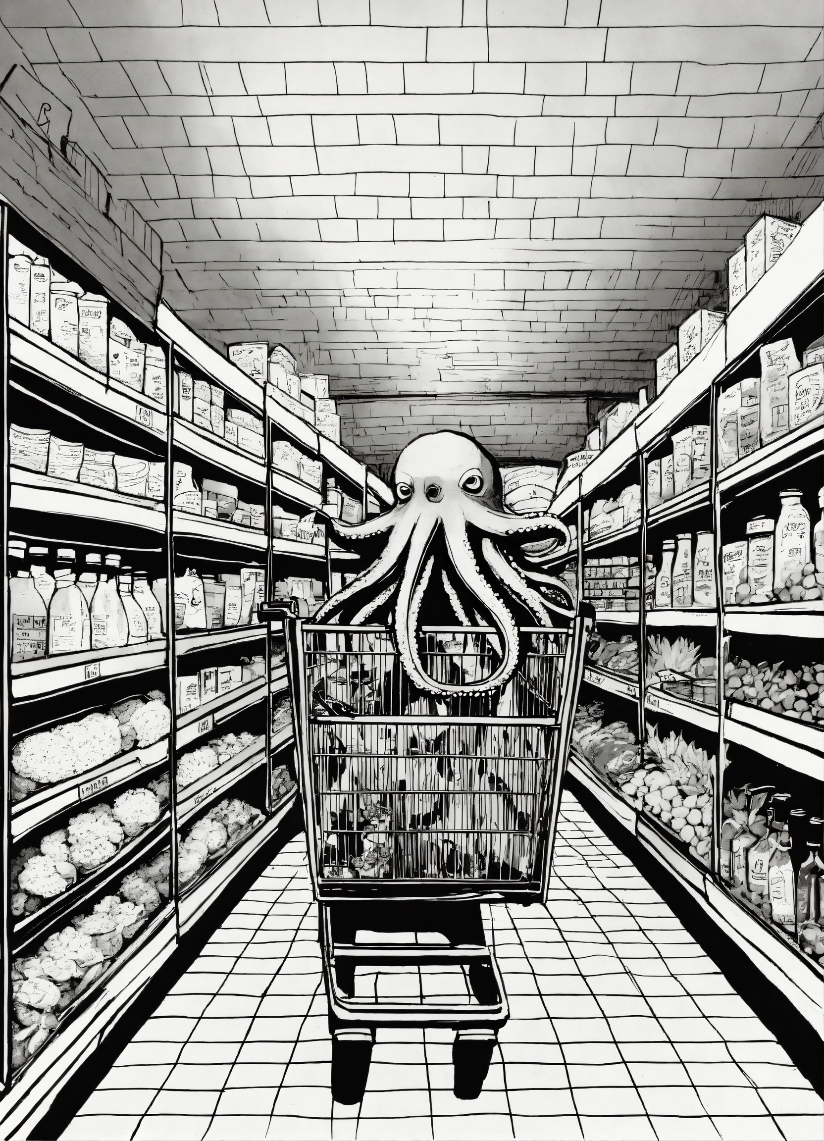Ink drawing of an octopus pushing a shopping cart in a grocery store