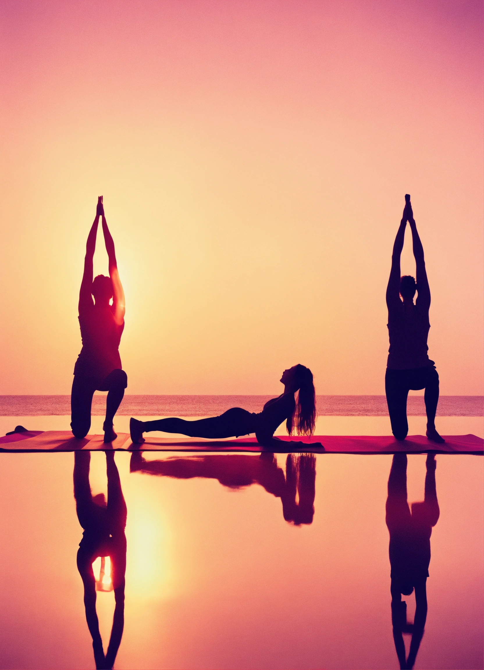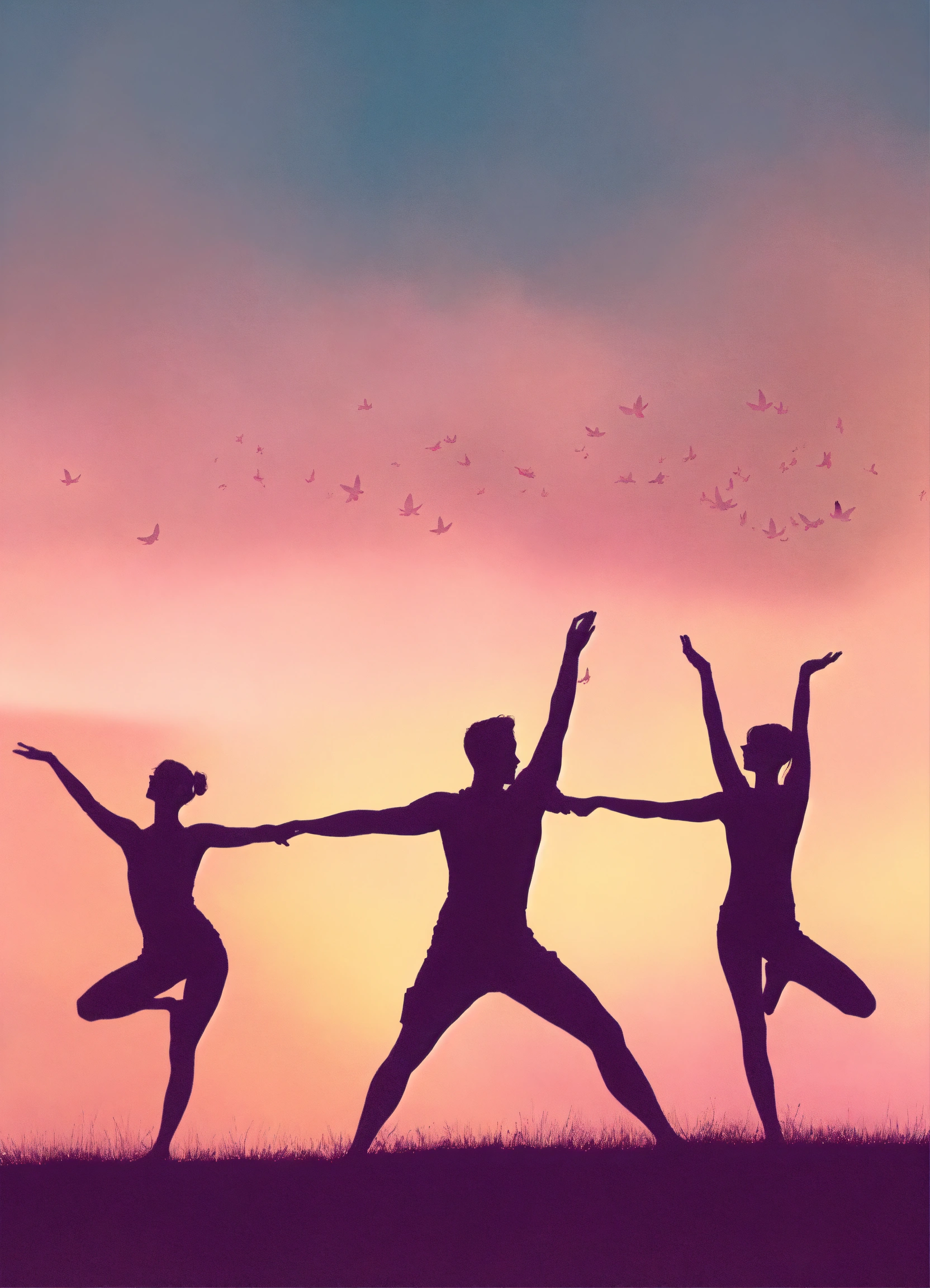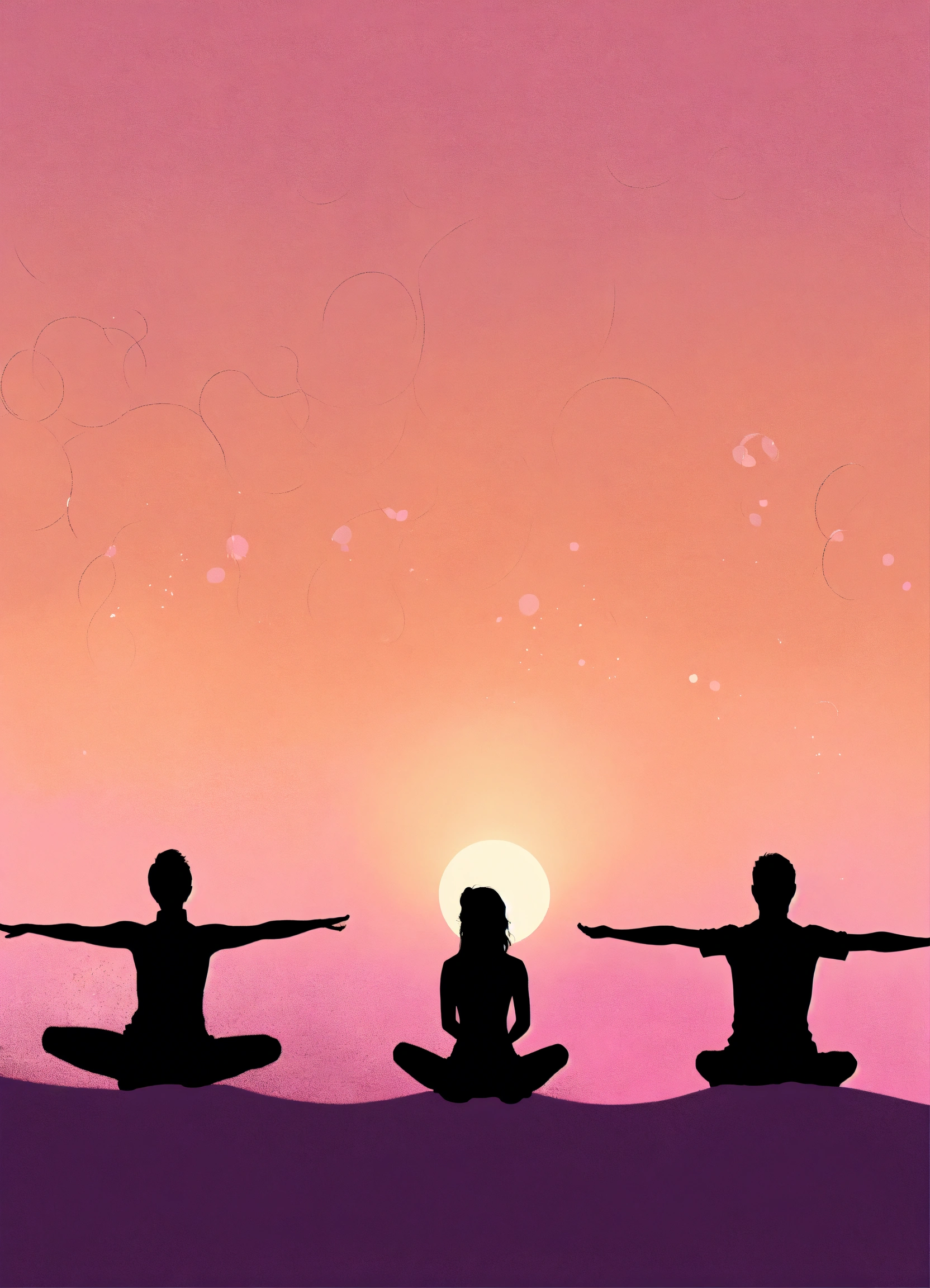 Silhouettes people doing pilates together, overlay background, pastel shades, hi res image, overlay technique, add lotus outline image