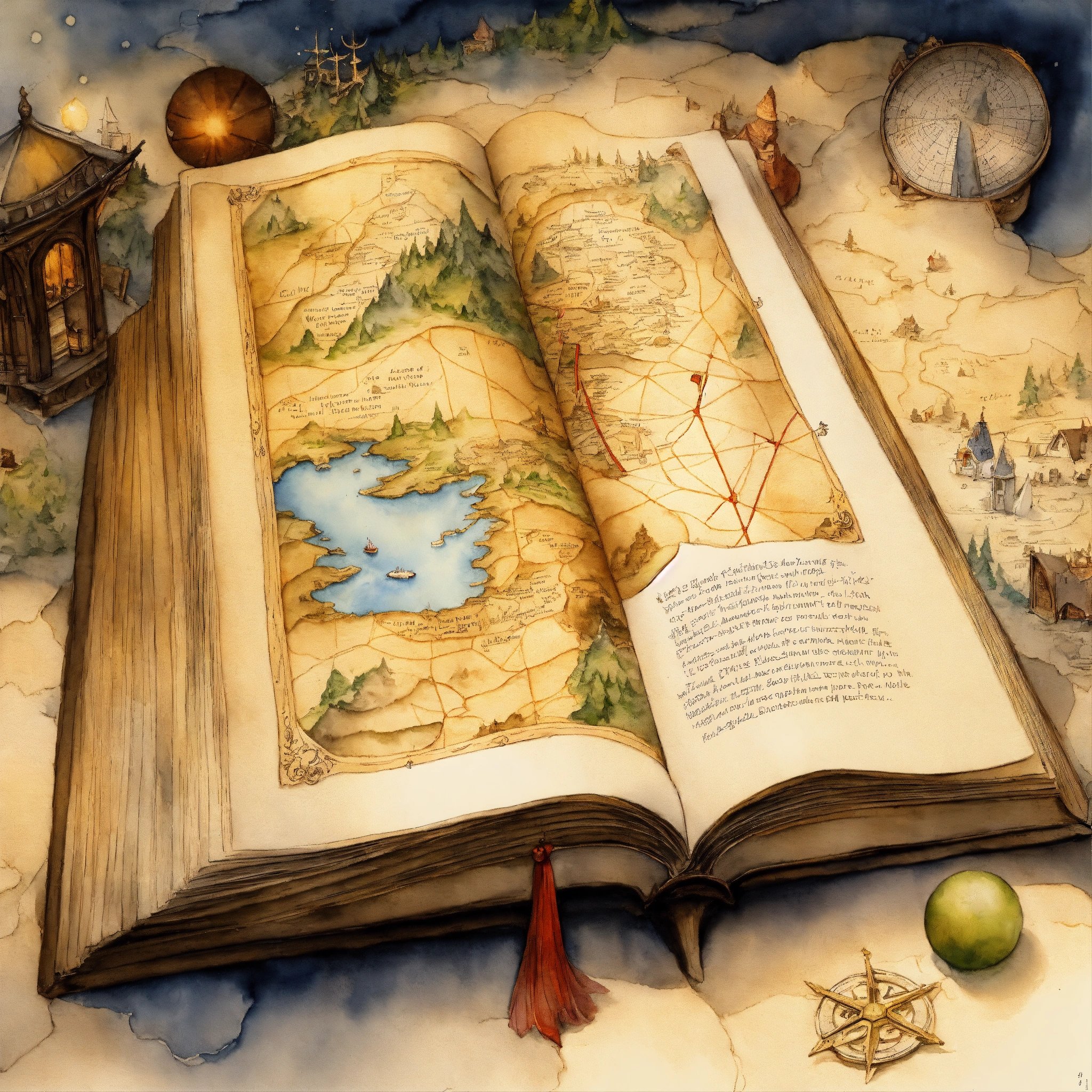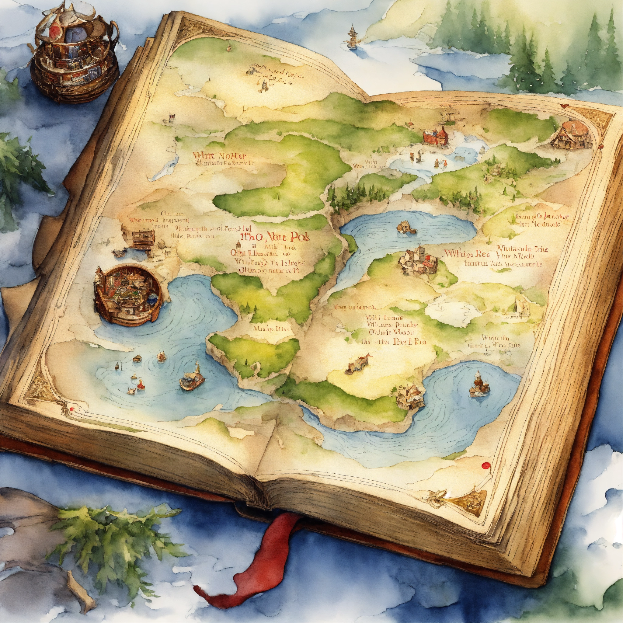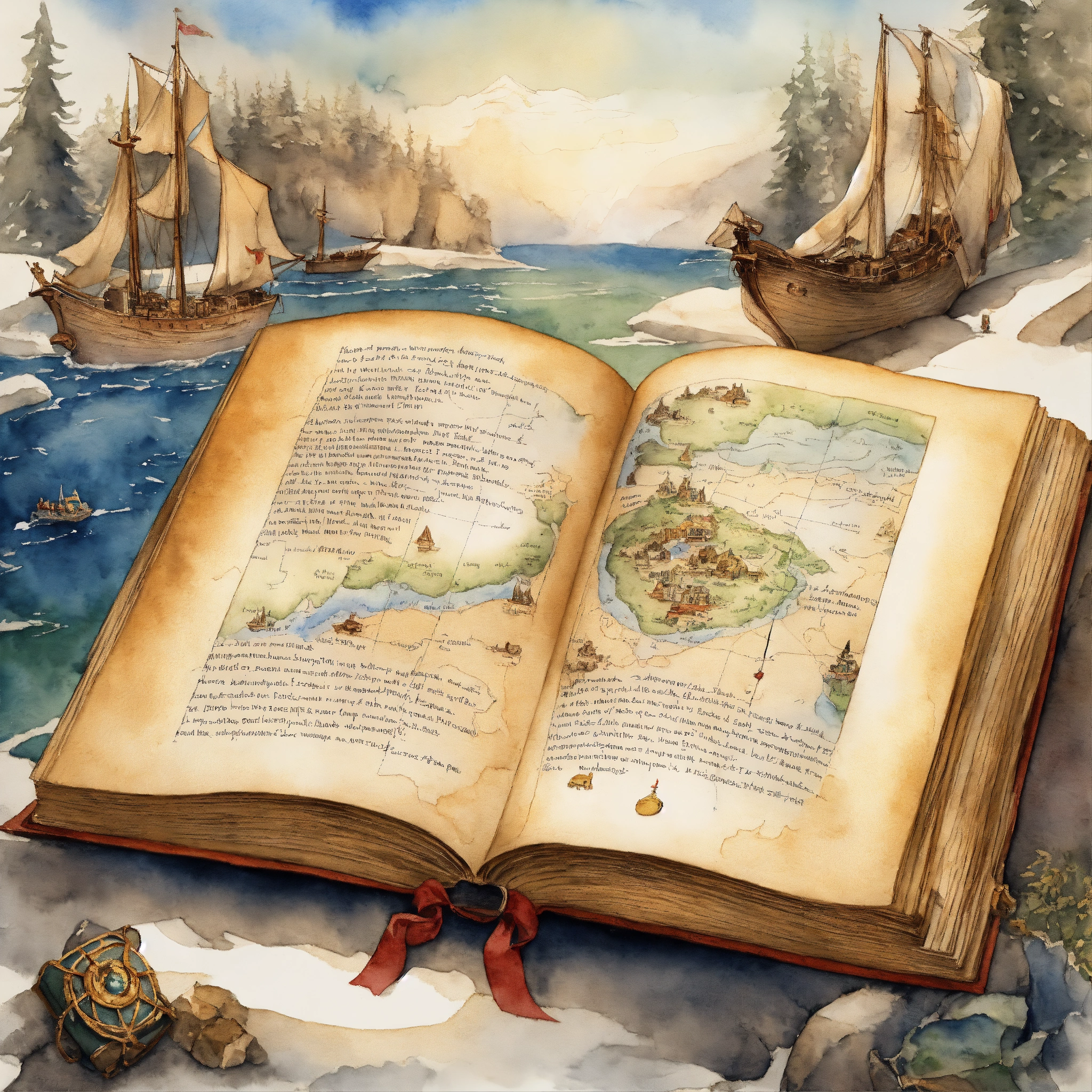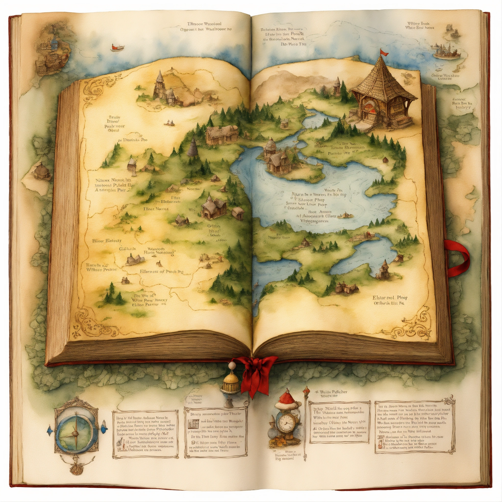White background, depict an otherworldly elvish treasure map open book to the north pole, the image should evoke a sense of awe and wonder, inviting viewers to embark on an imaginative journey. highly detailed, sharp focus. 4k watercolour illustration by cicely mary barker