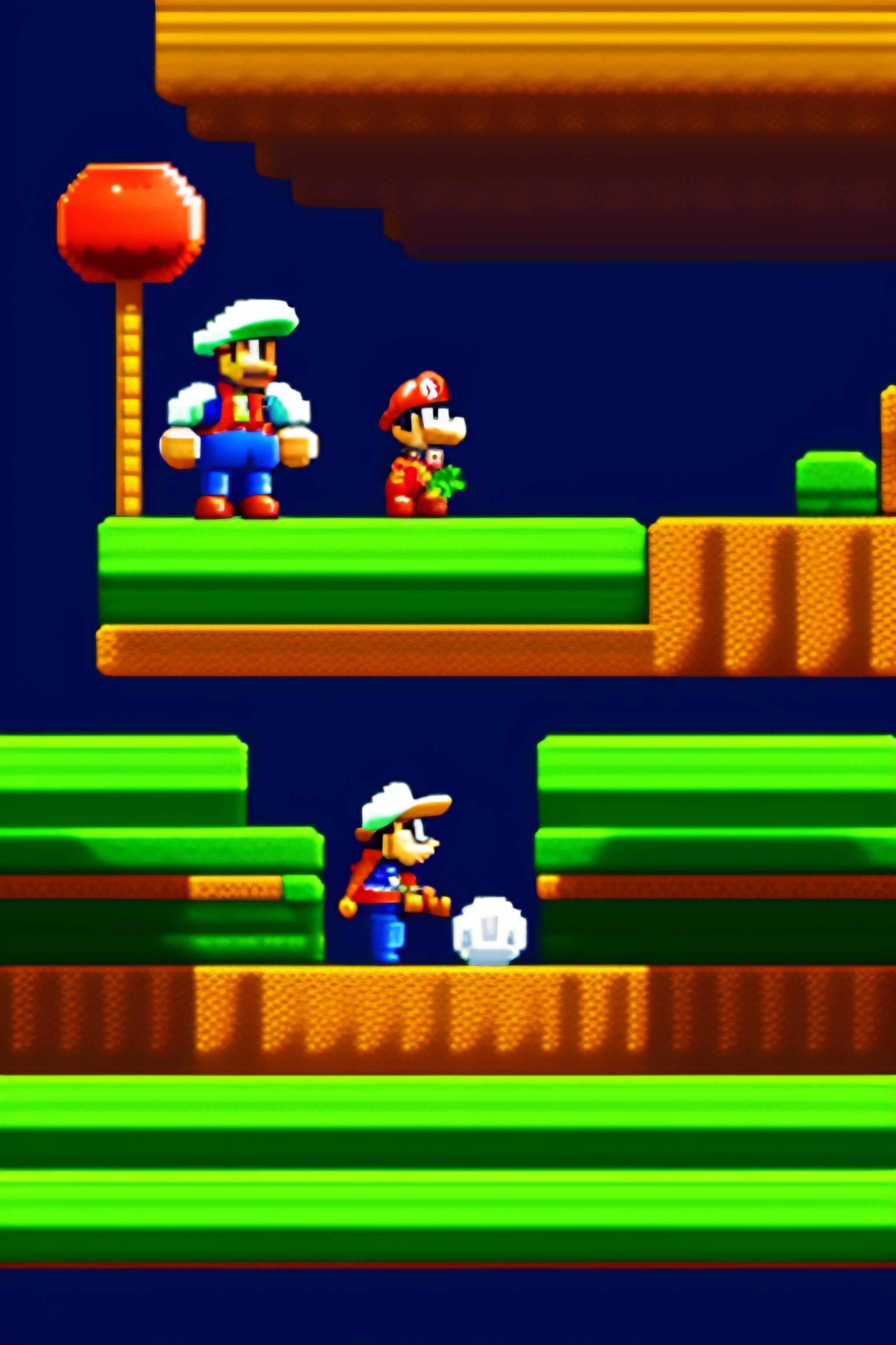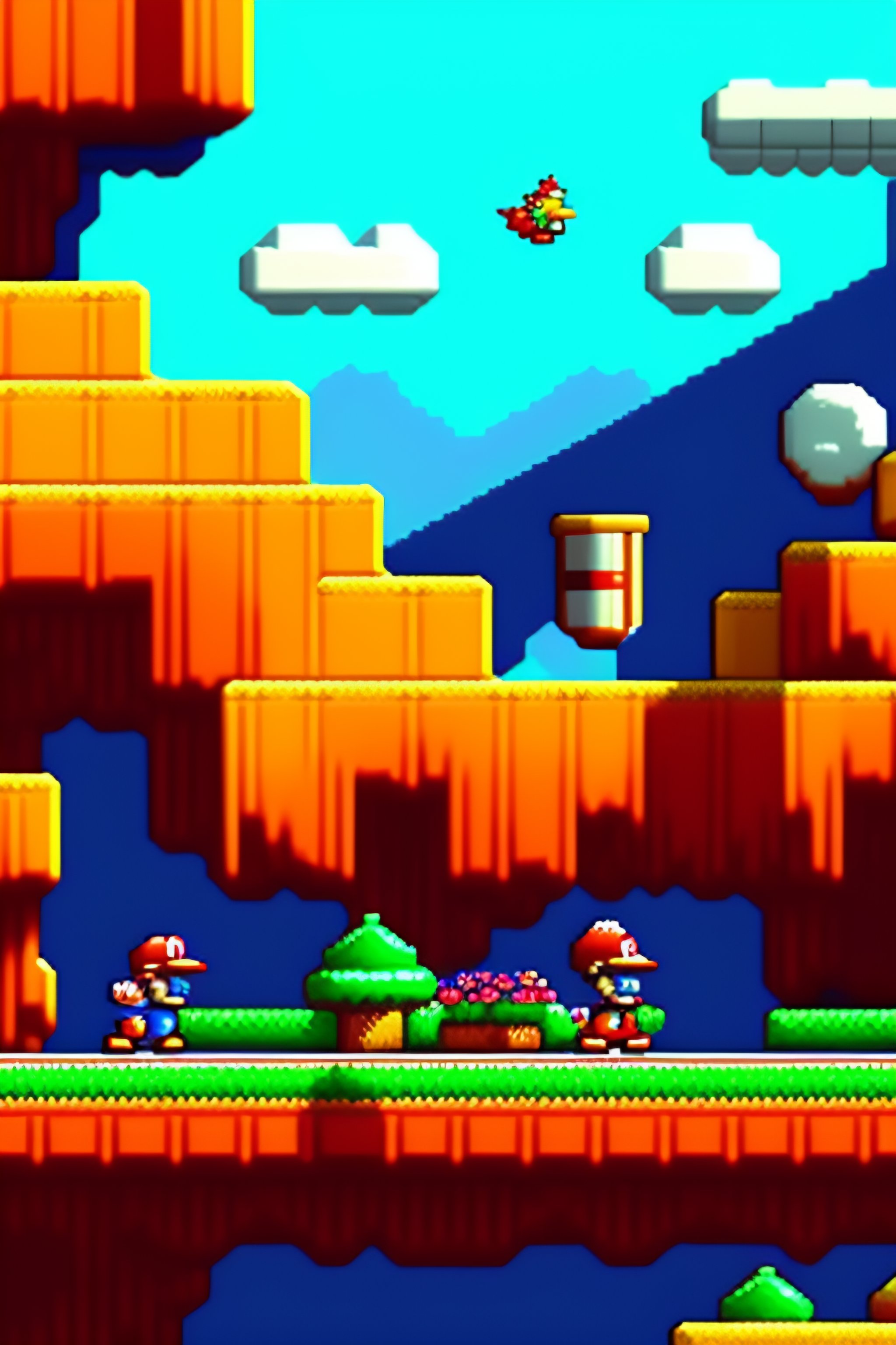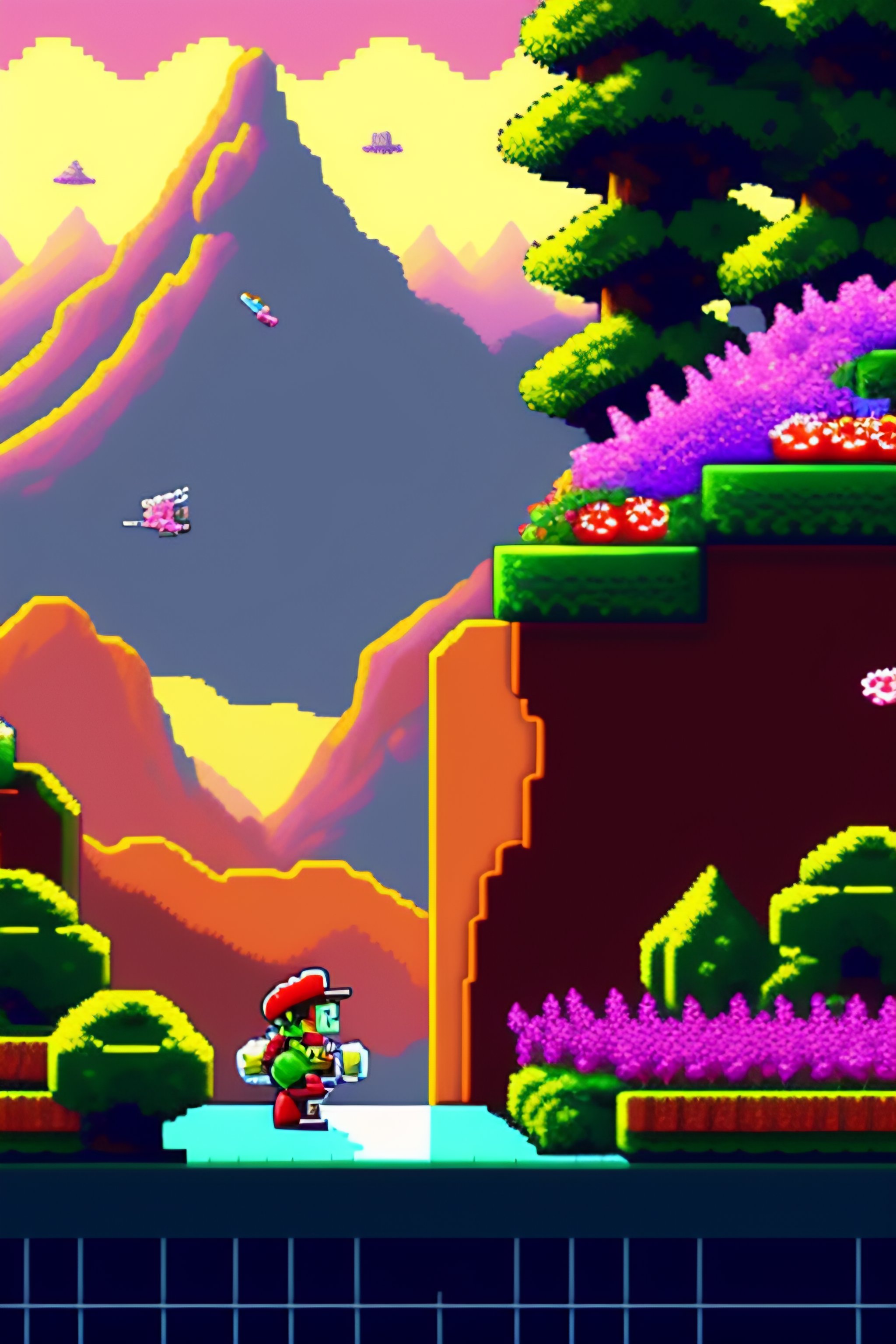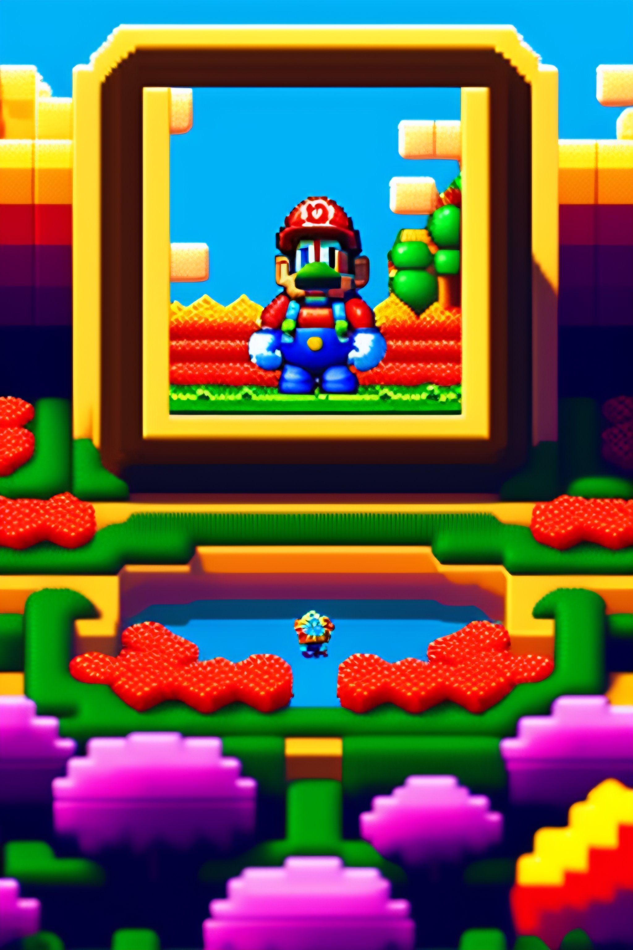 Pixel art super mario bros, 3d pixel art 8k wallpaper, incredible pixel art details, friend playing flowers in the foreground, awesome pixel art by pixel jeff
