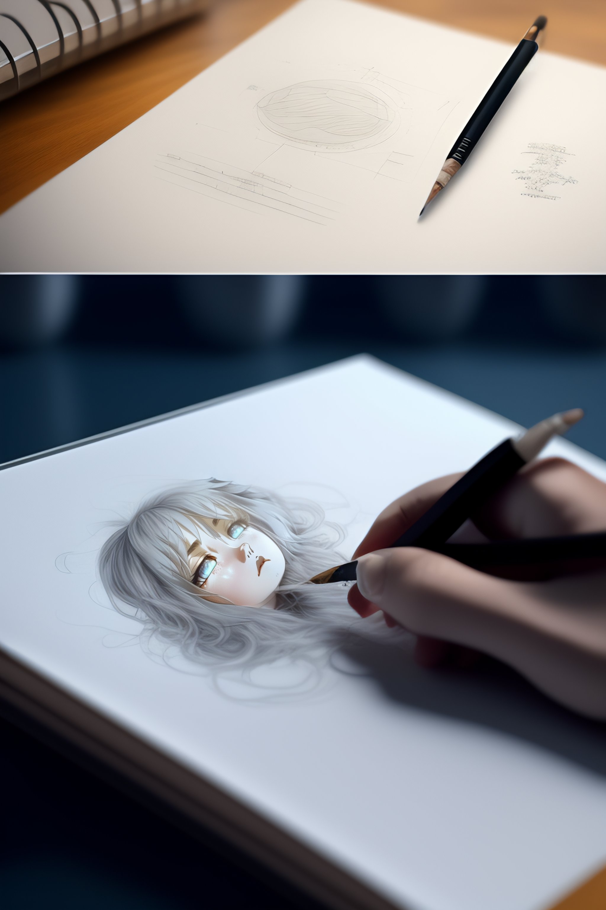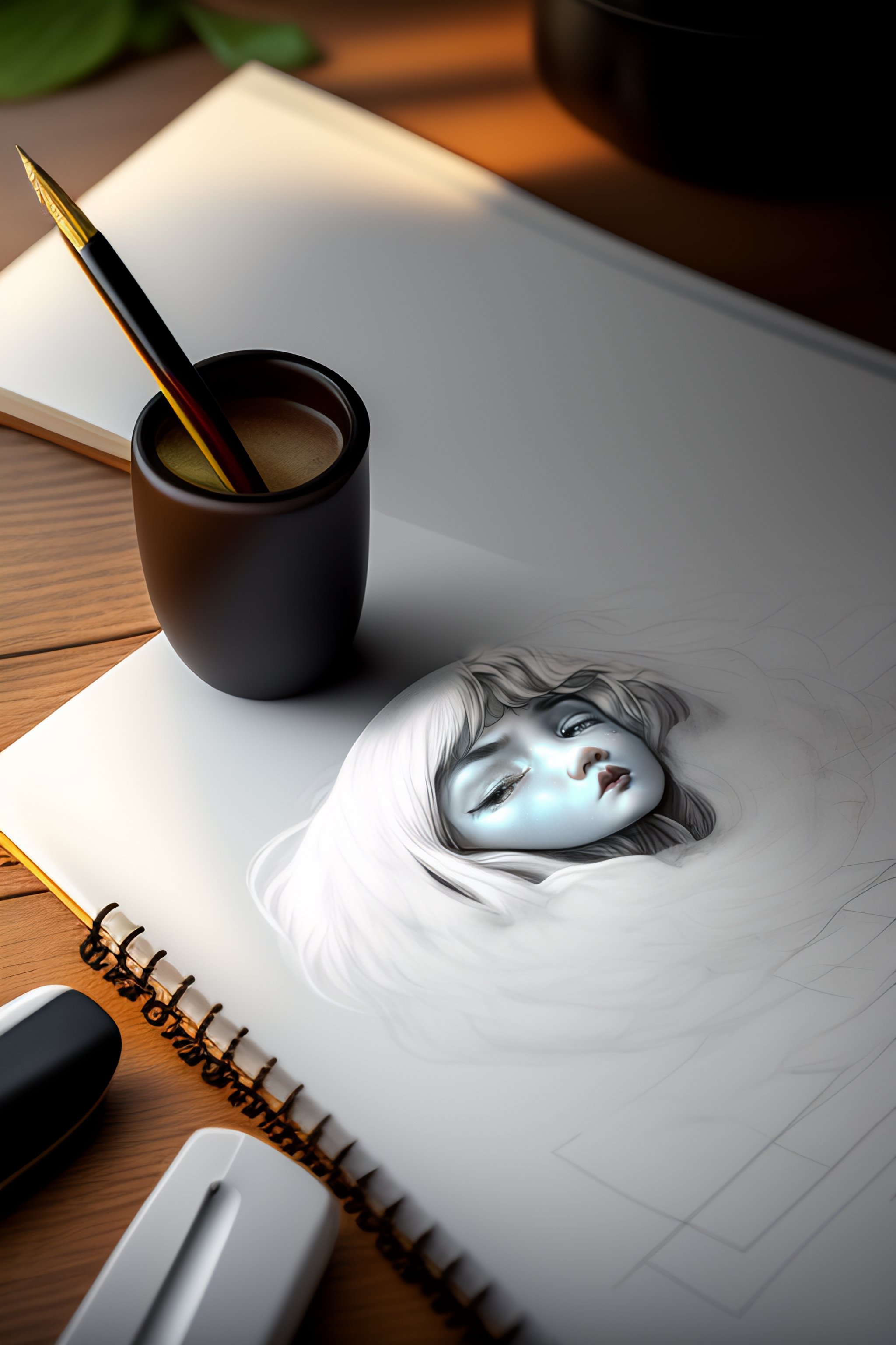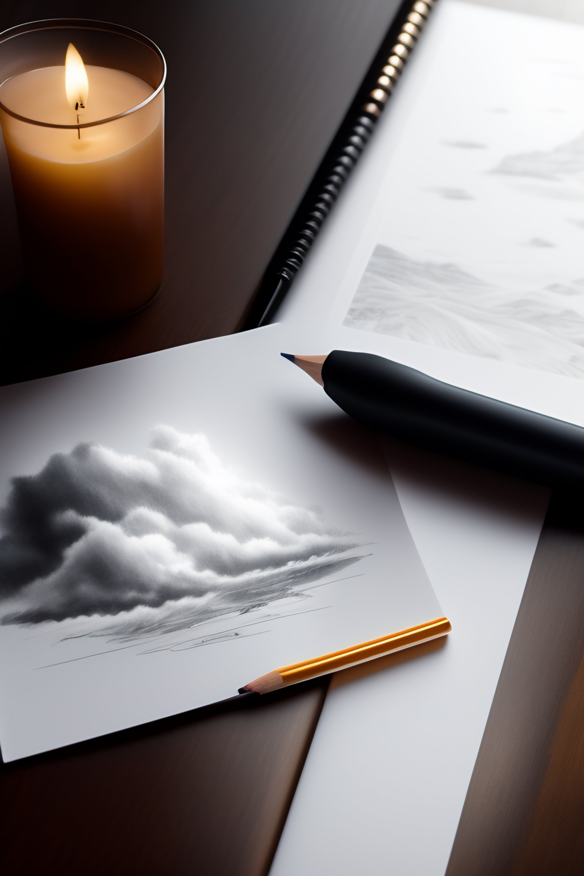 Photoreal, a piece of paper with some drawings on a desk containing sketches, one sketch has an uncolored anime girl crying, another sketch is an uncolored storm cloud, pencil is sitting on the paper