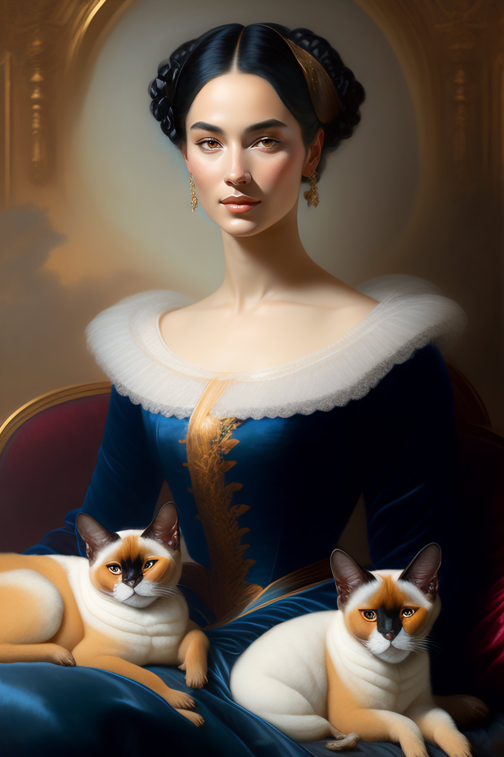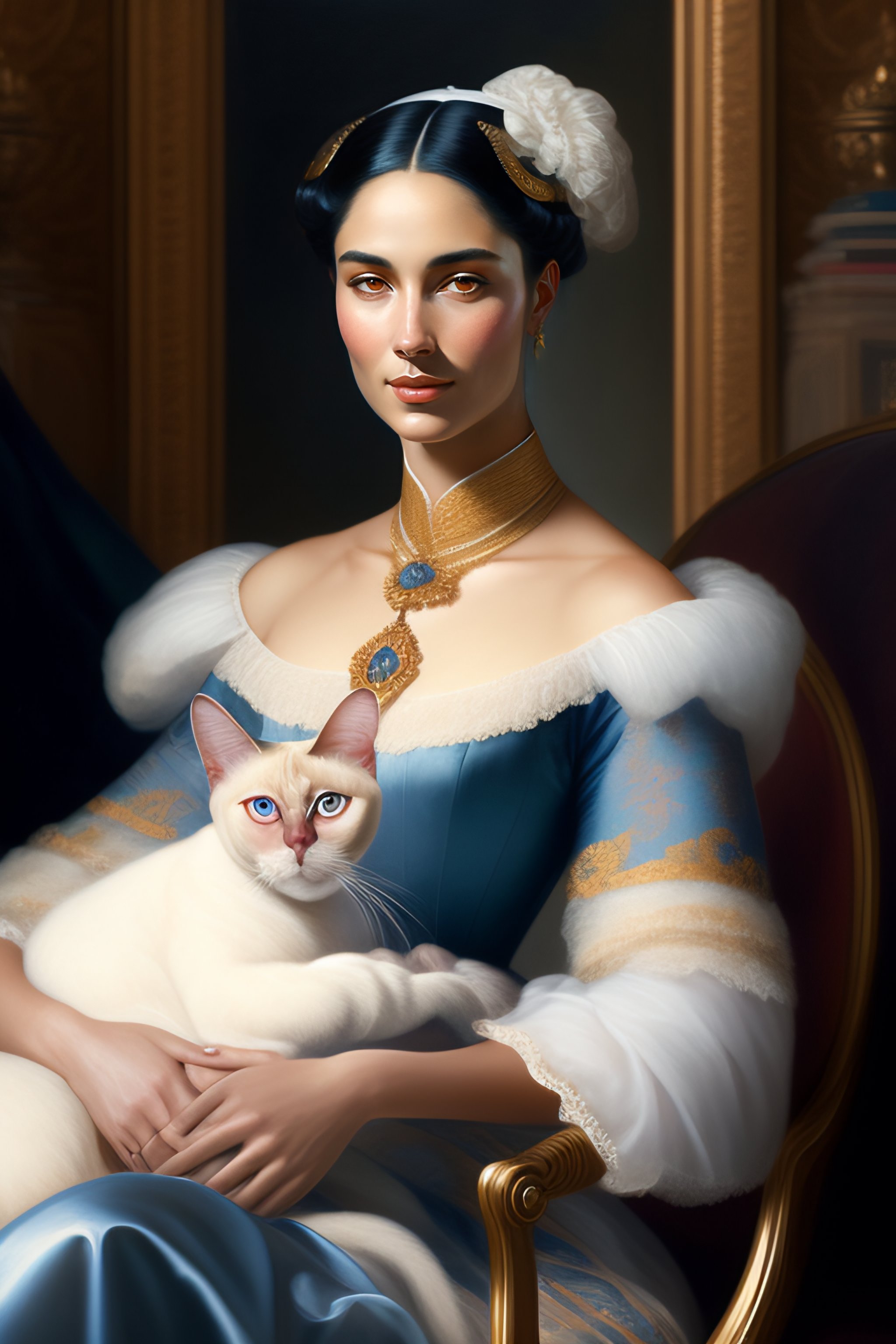 A portrait of a beautiful woman with a beautiful siamese cat in her lap, in 19th century. cat has wedge shaped head, large ears, blue eyes, slender body. beautiful painting with highly detailed face by greg rutkowski and magali villanueve