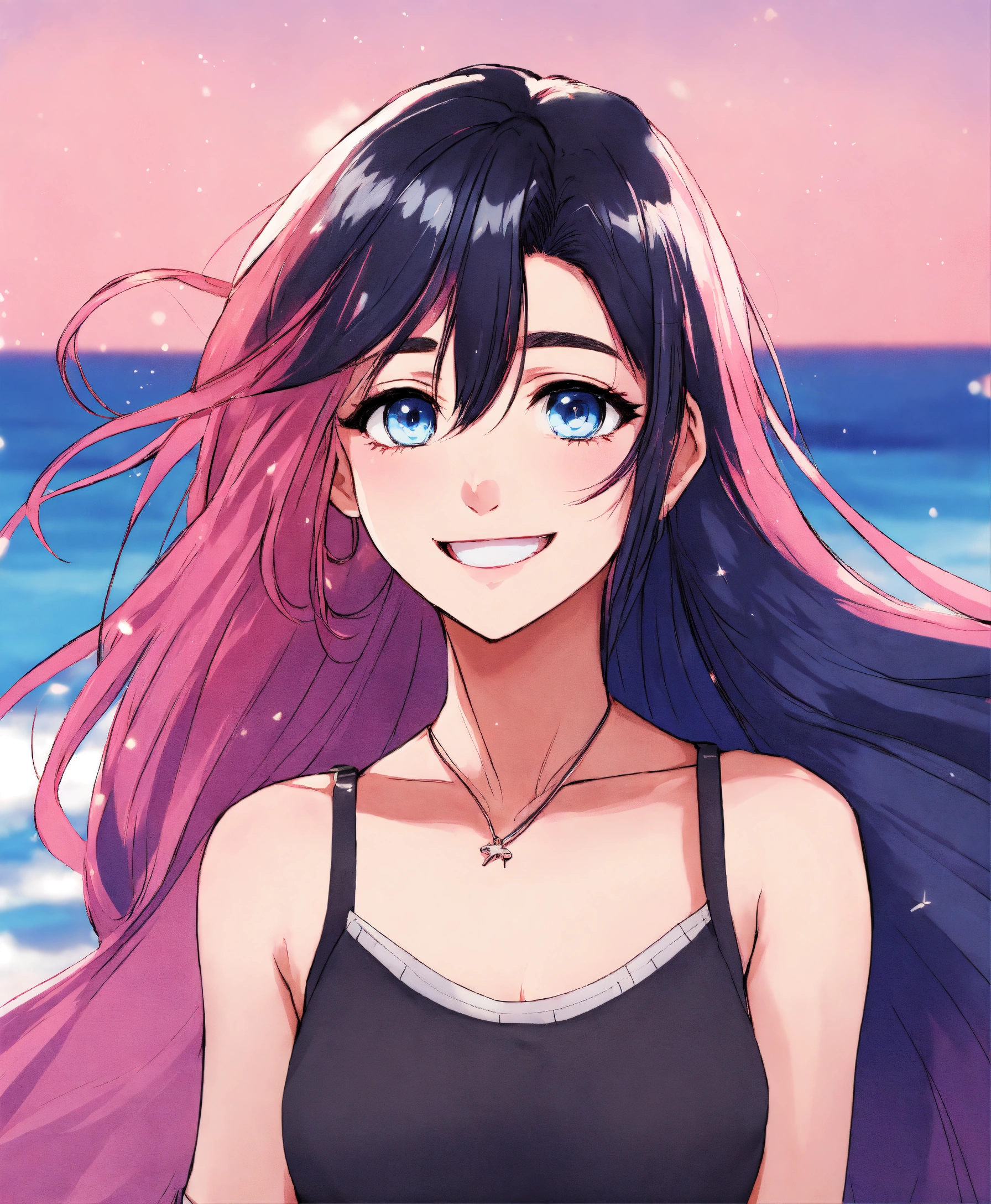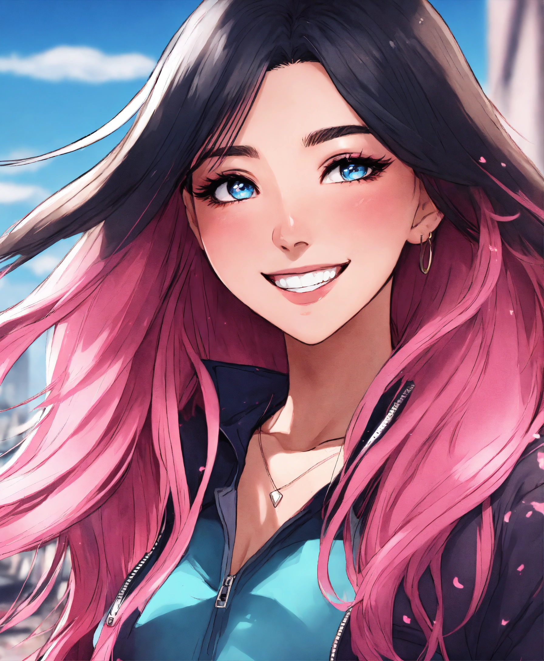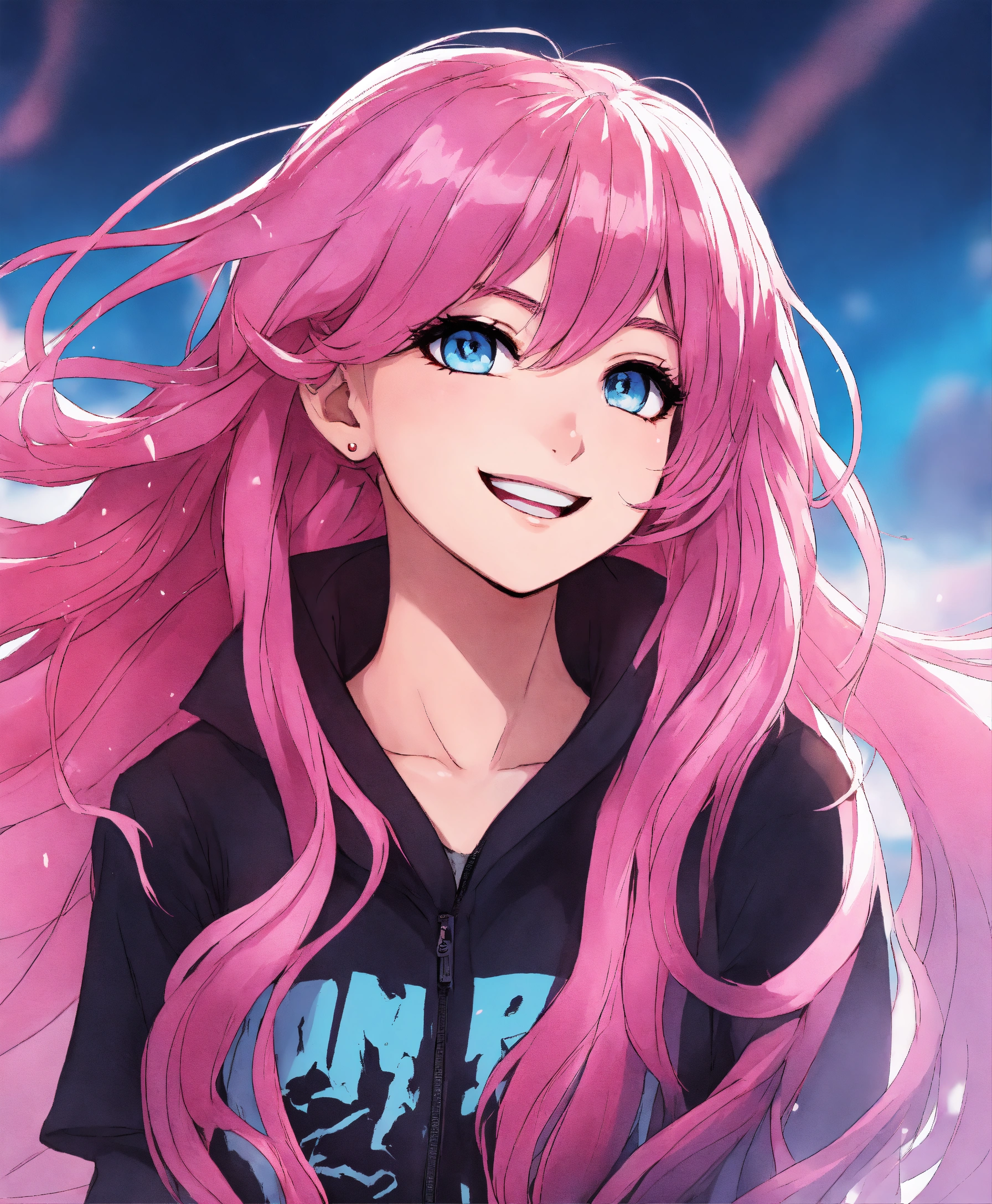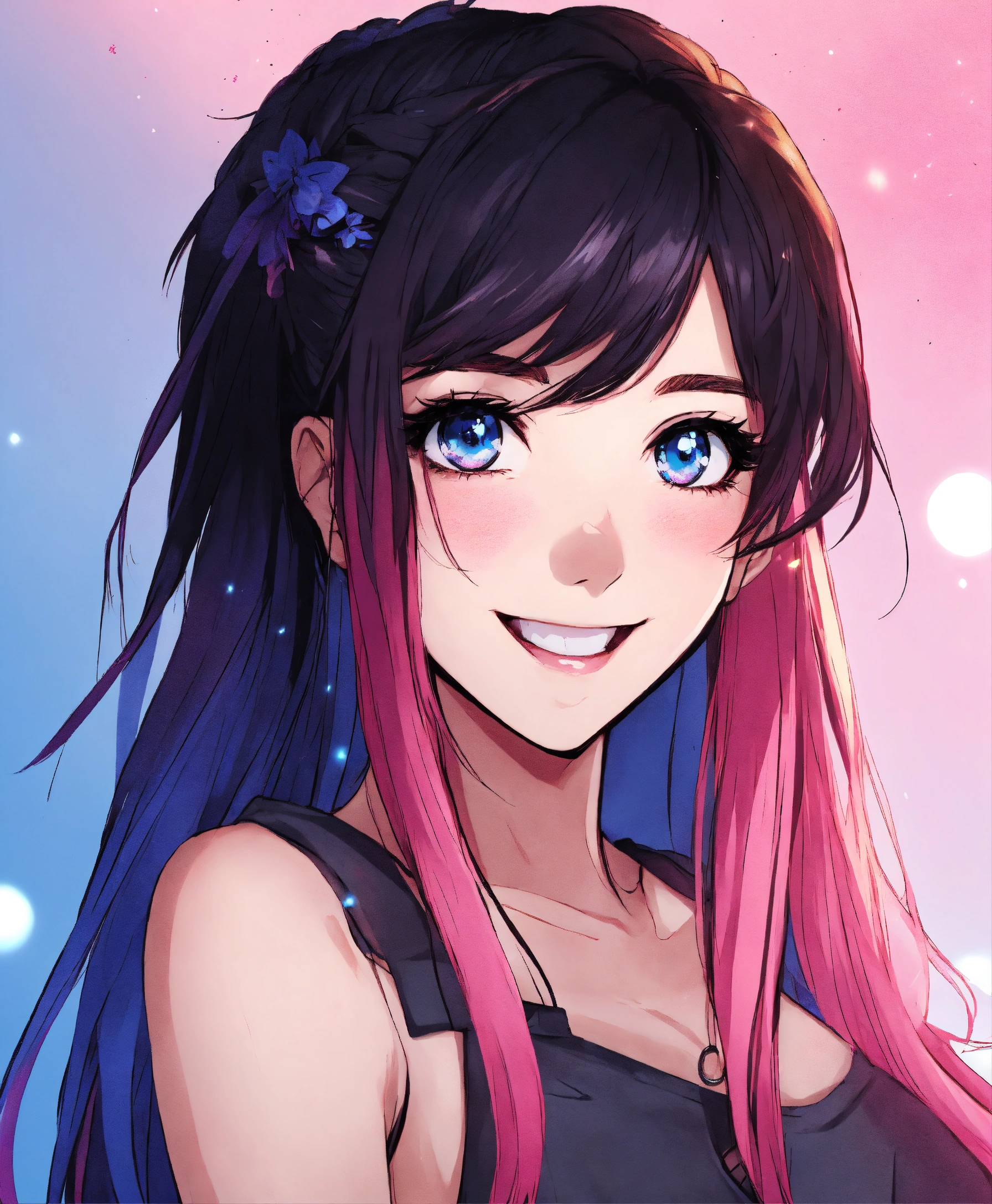 Anime character, black pink ombre hair long, smiling, excited, comic book style, white skin, blue eyes