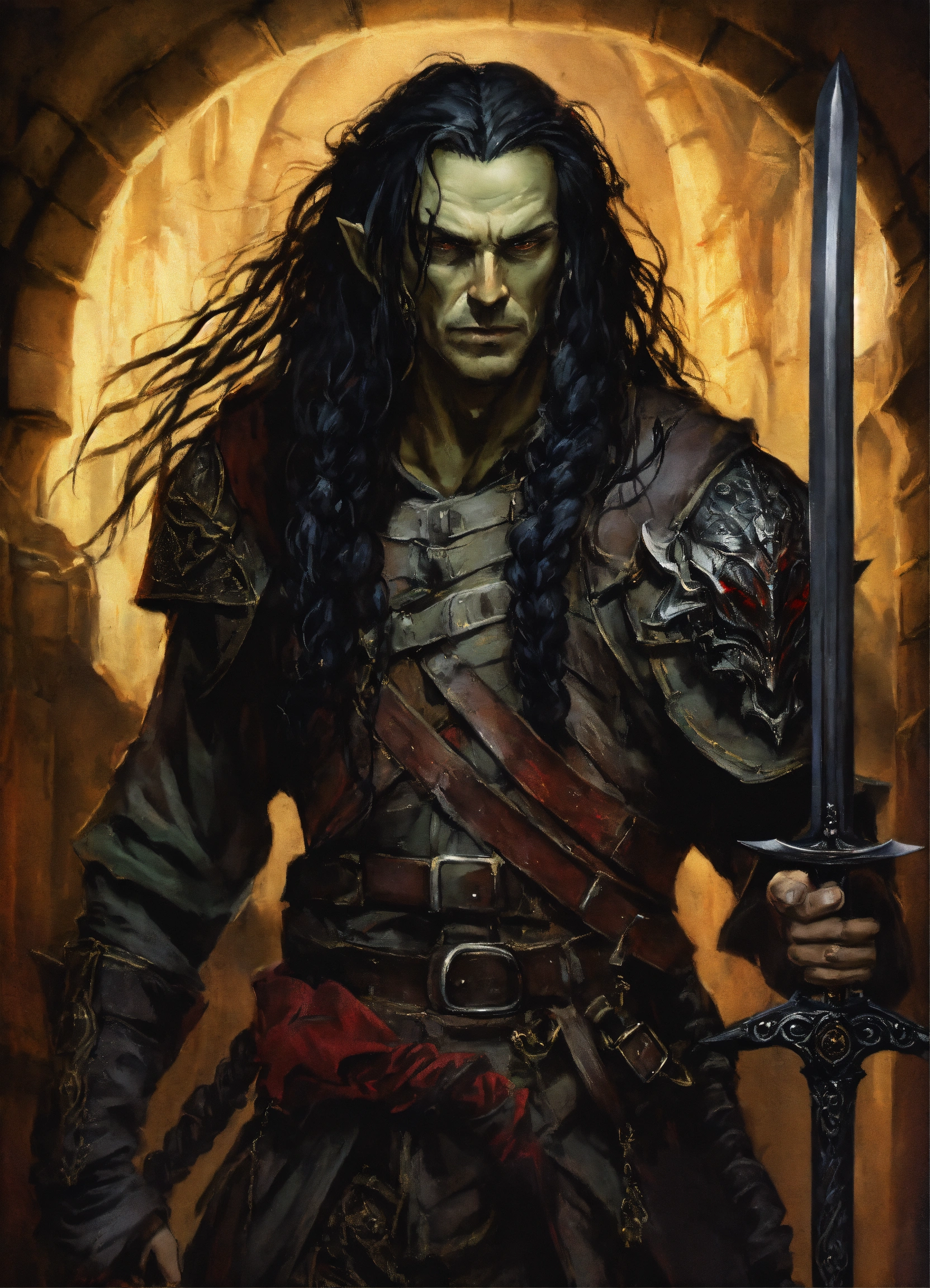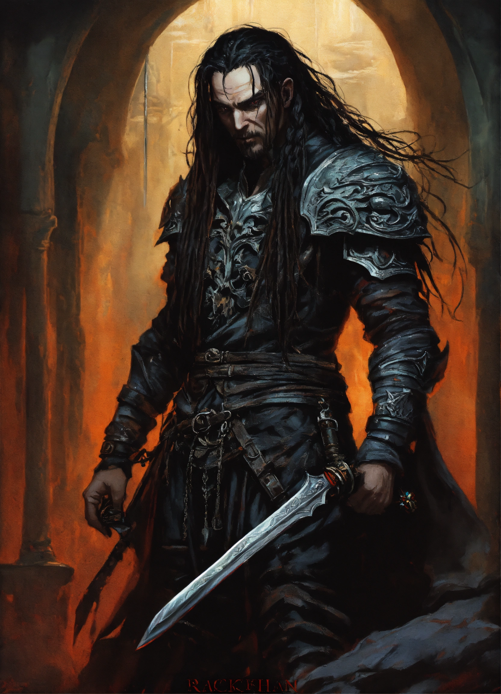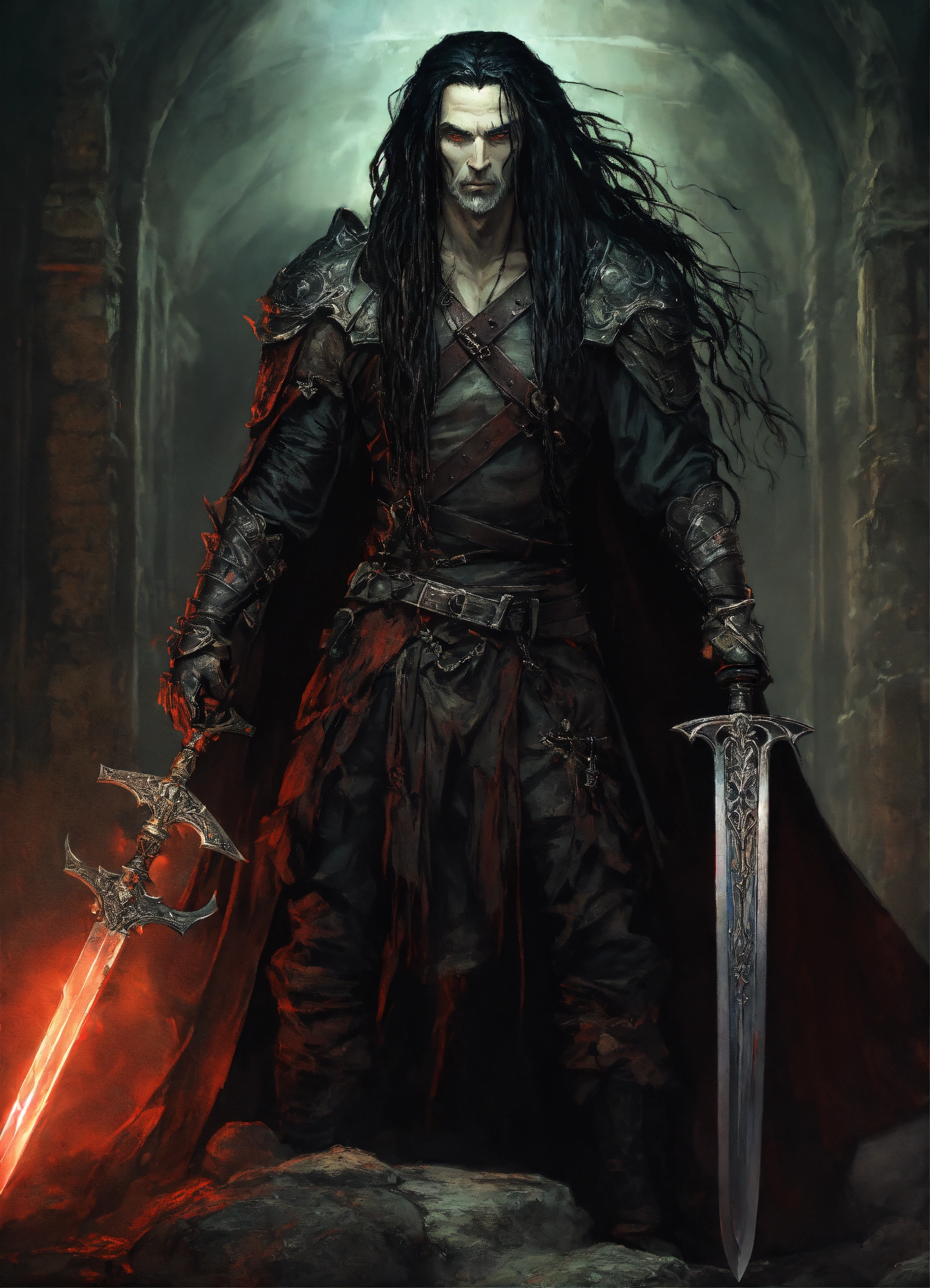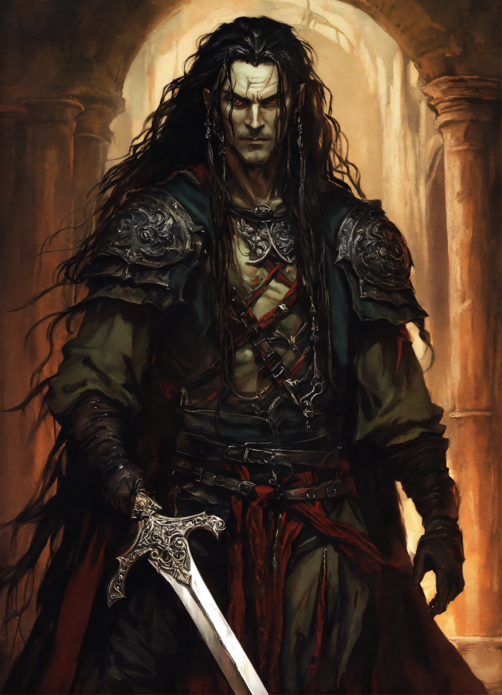 Older male warrior alien vampire with long black braided locks, with sword, gothic underground catacombs, rackham