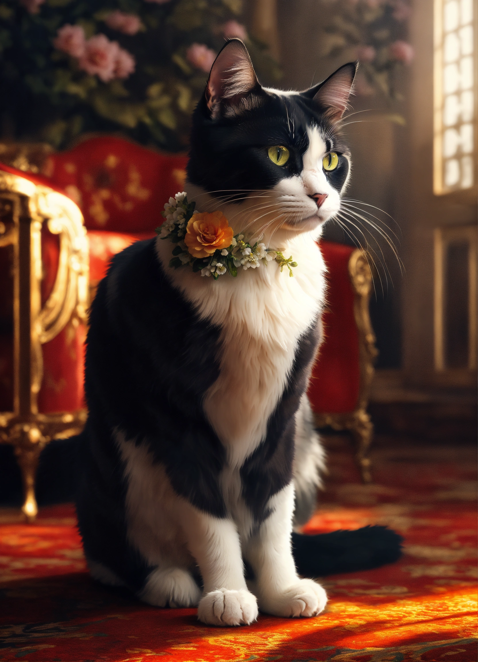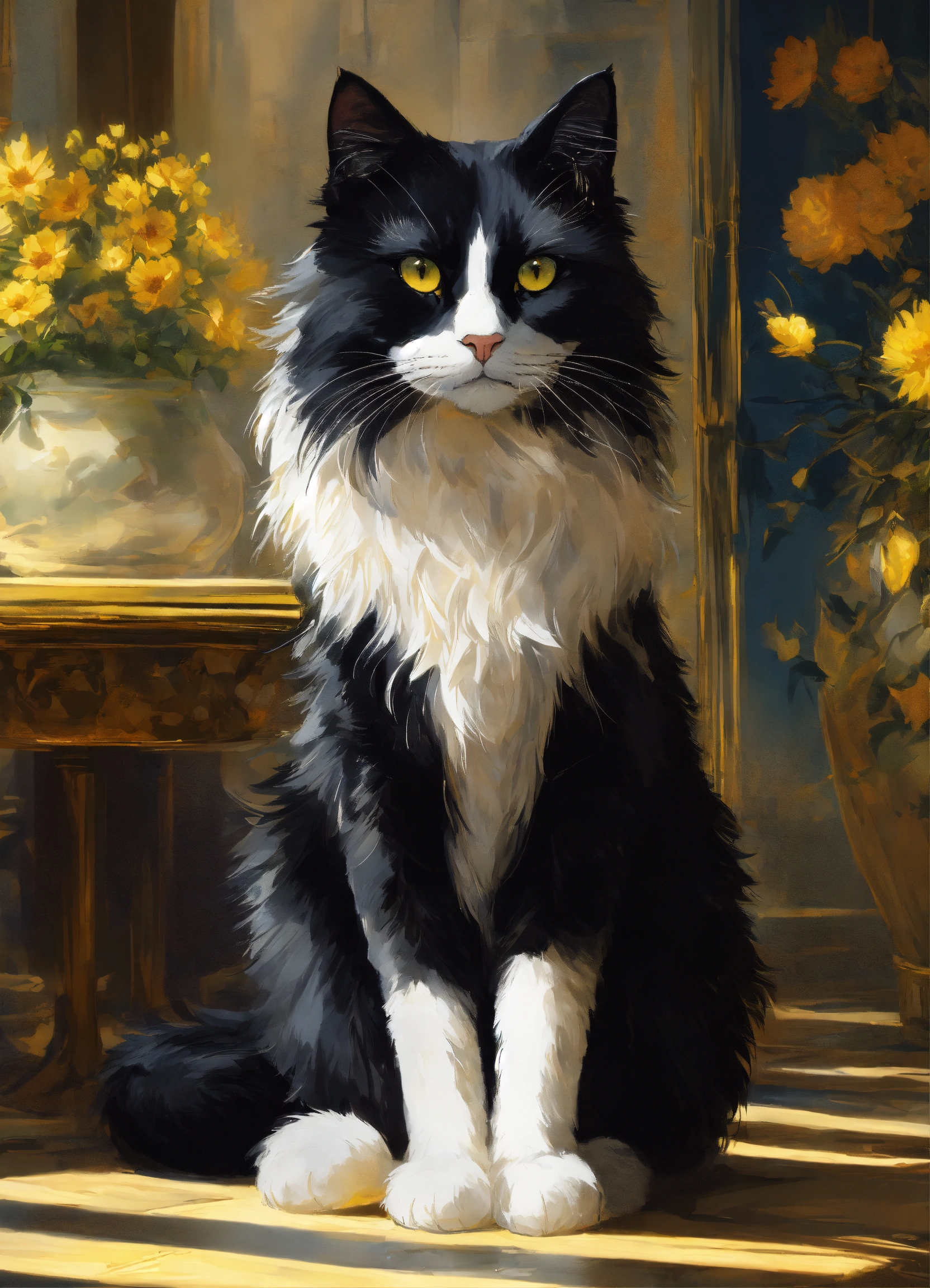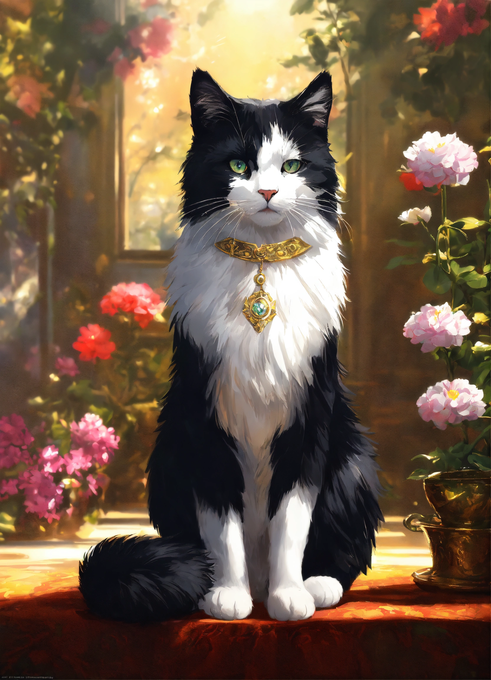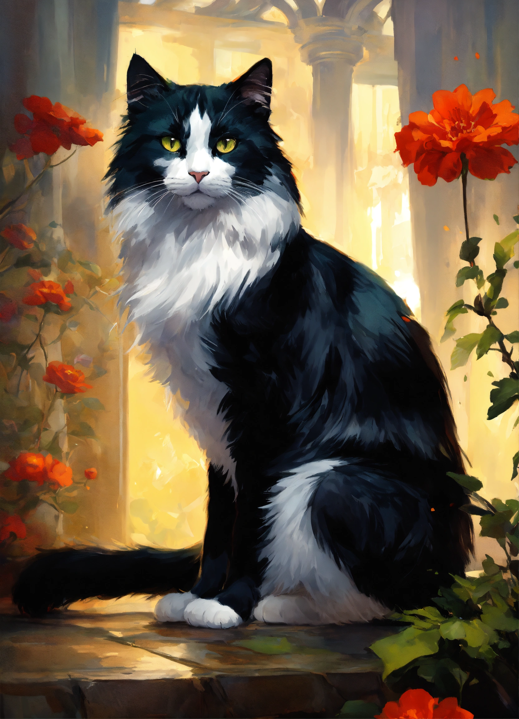 Mdjrny-v4 style, full-length masterpiece fullbody emotional portrait of handsome siberian black and white cat with perfect face, sitting elegantly. with flower all around chris foss, alberto giacomettin, alexander jansson. elegant sitting pose, concept art, beautiful lighting, extremely detailed, sharp-focus, magnificent, award-winning, epic, dramatic.