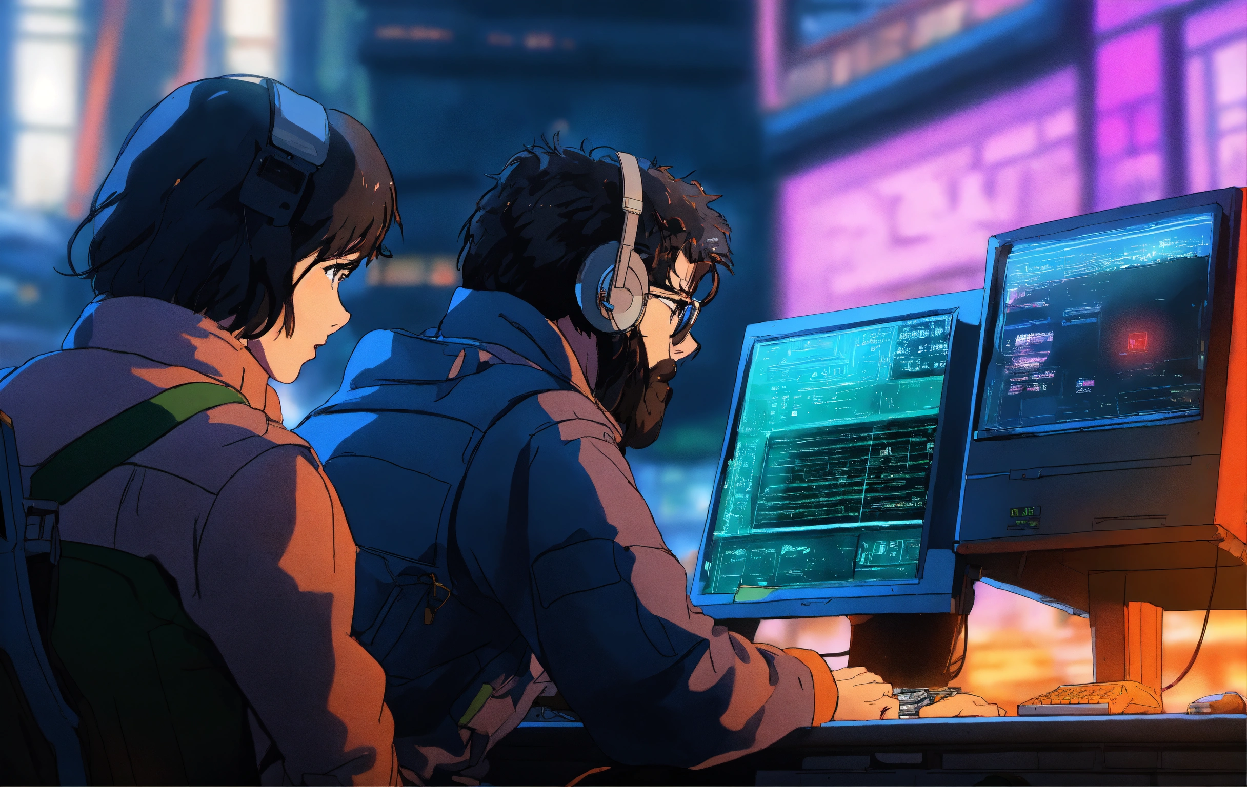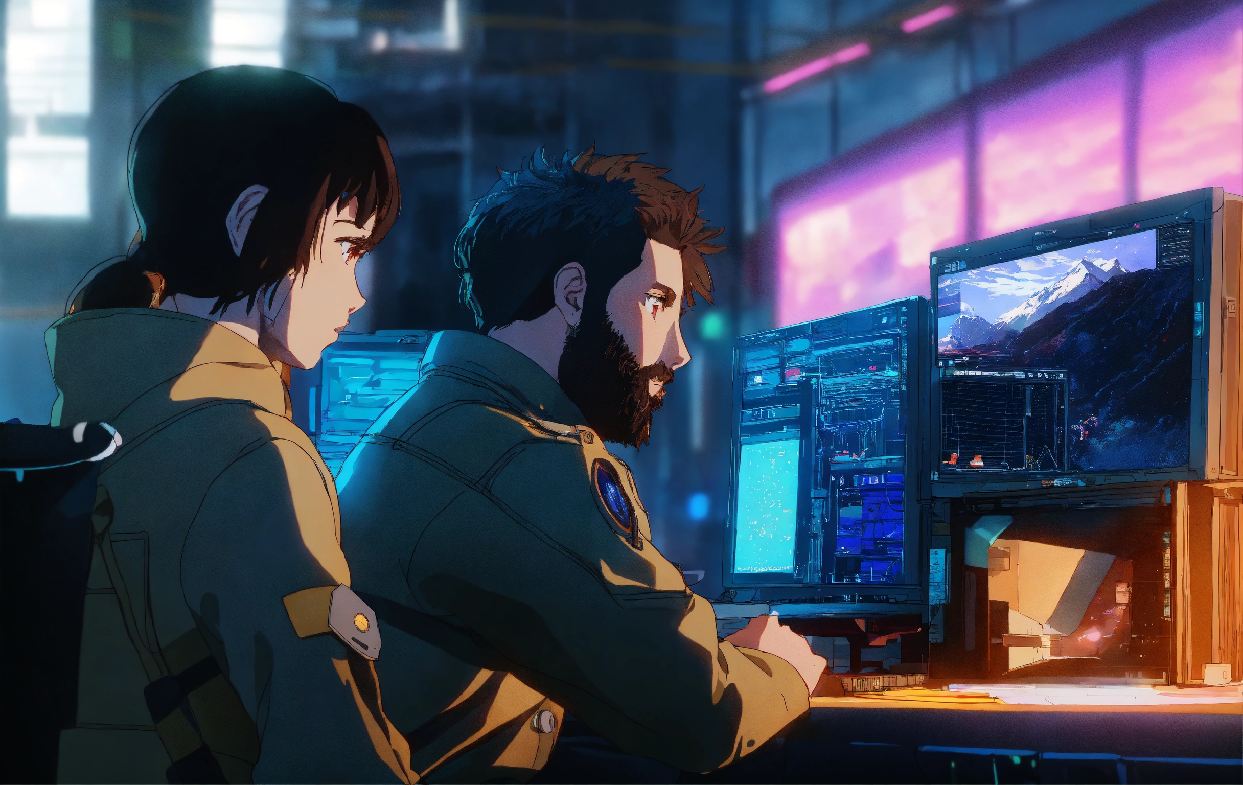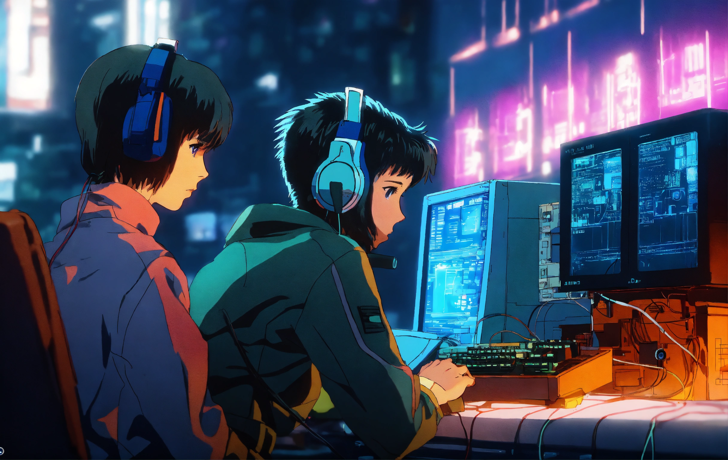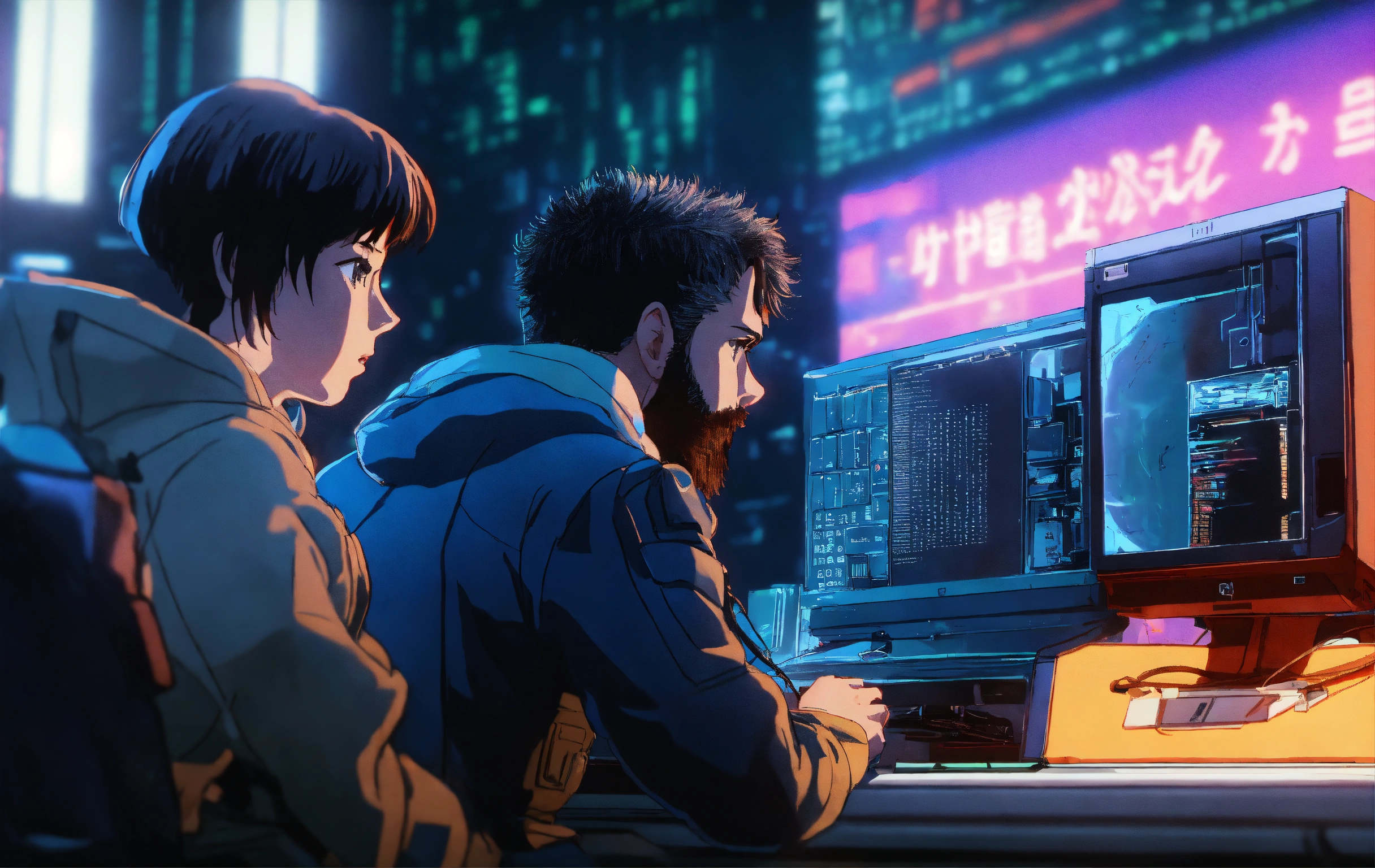 Alexander graham bell fixing computers, repairing computers, anime, retro anime, 1980s anime, 1990s anime, ghost in the shell, serial experiments lain, 4k, rule of thirds, extreme detail, detailed drawing, trending artstation, hd, sharp focus, backlit, symmetrical features, film grain