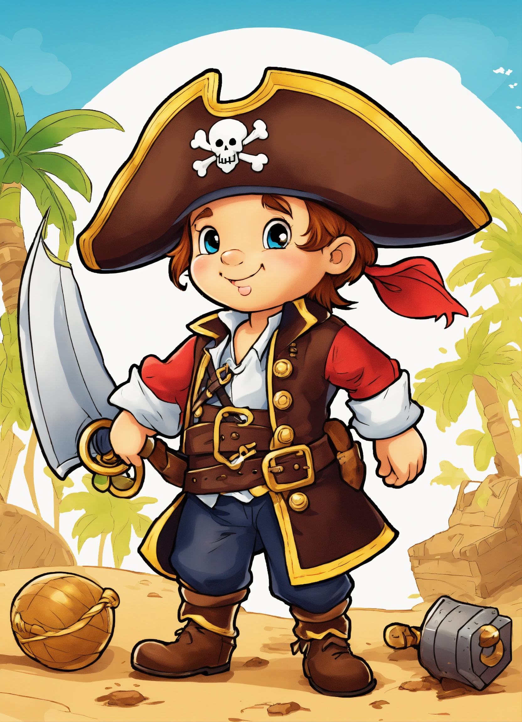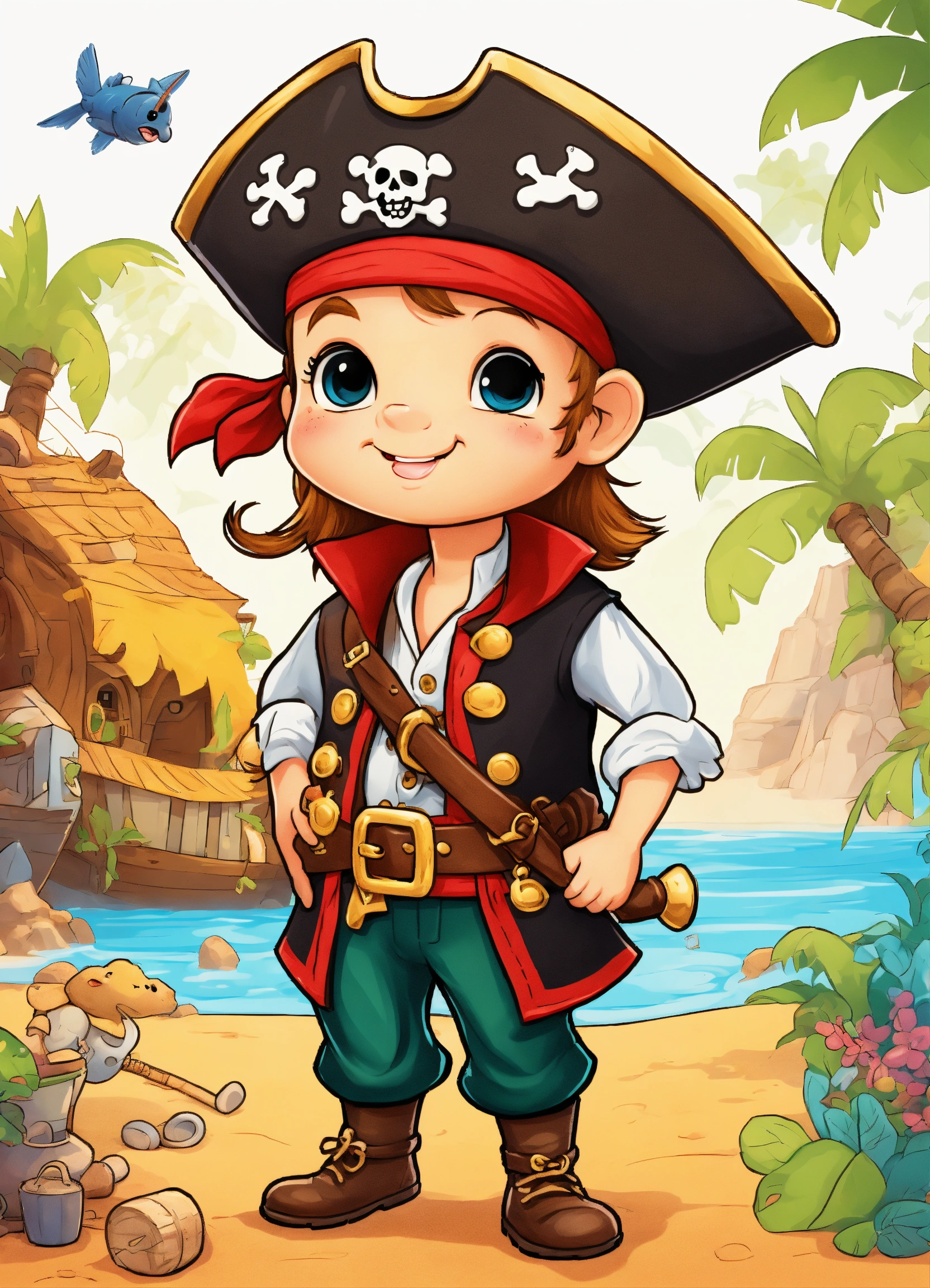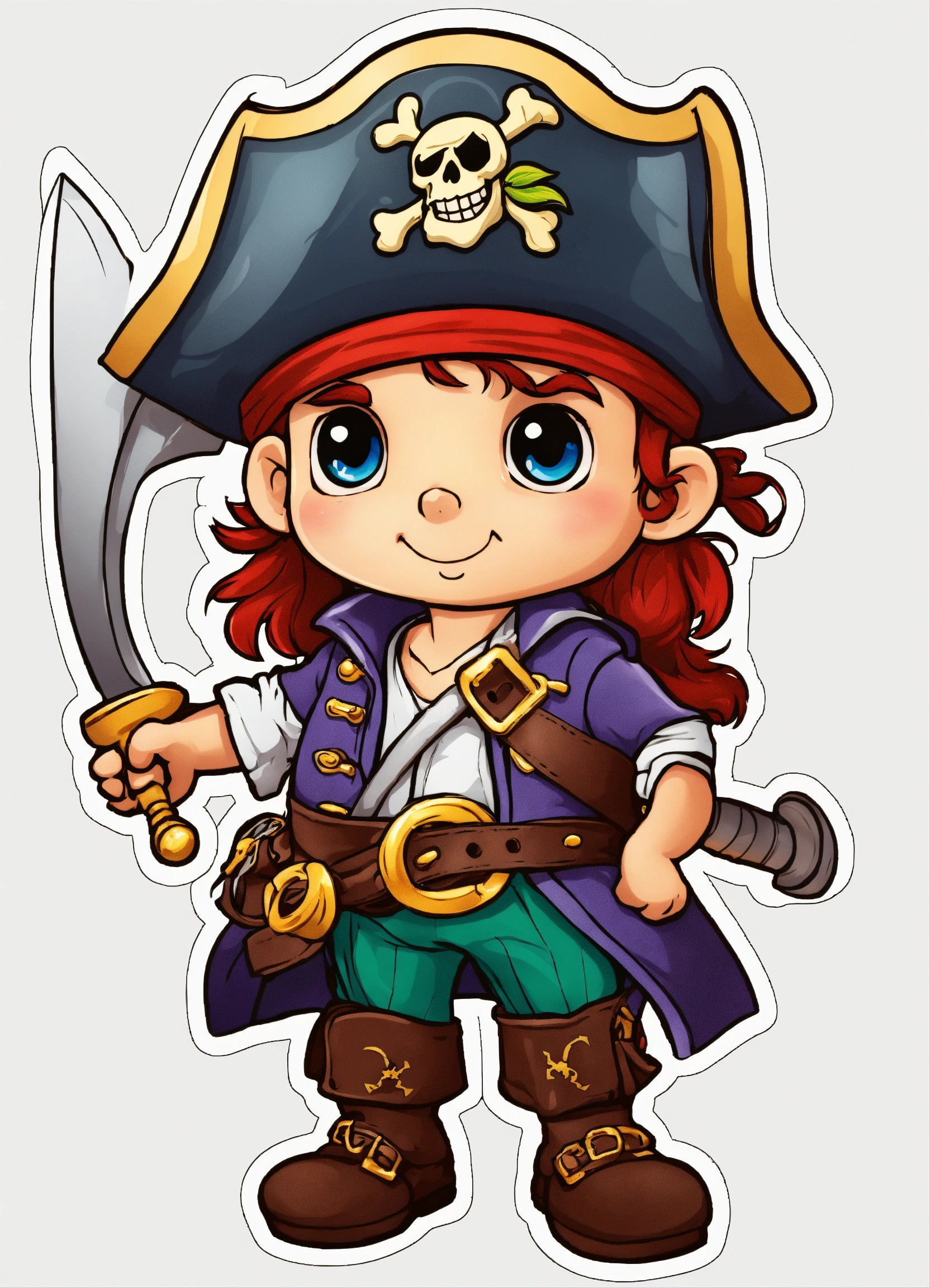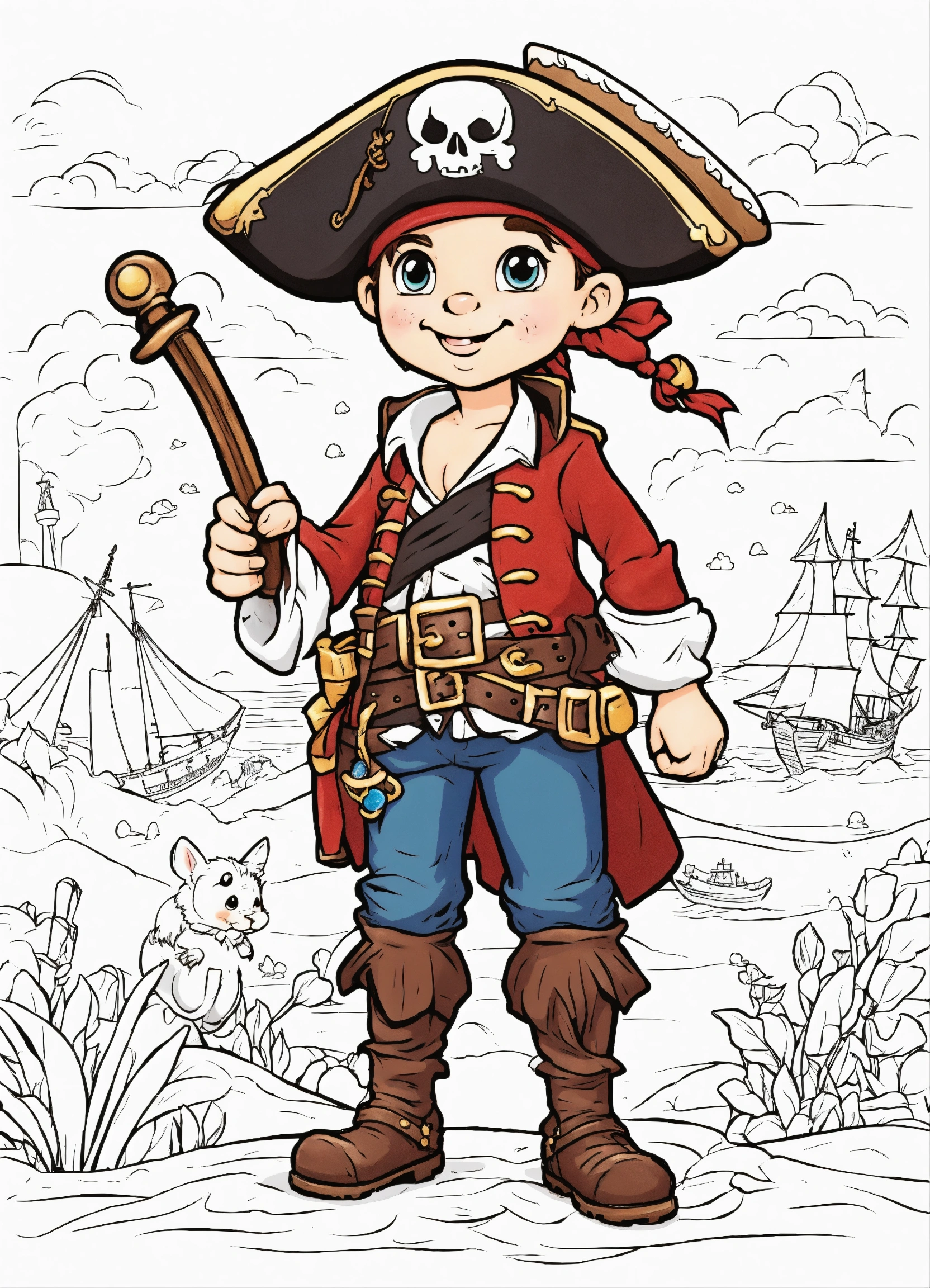 Generate a cute little pirate illustration, 4k resolution, cartoon-sticker style with clear lines on a pure white background suitable for a children's coloring book.