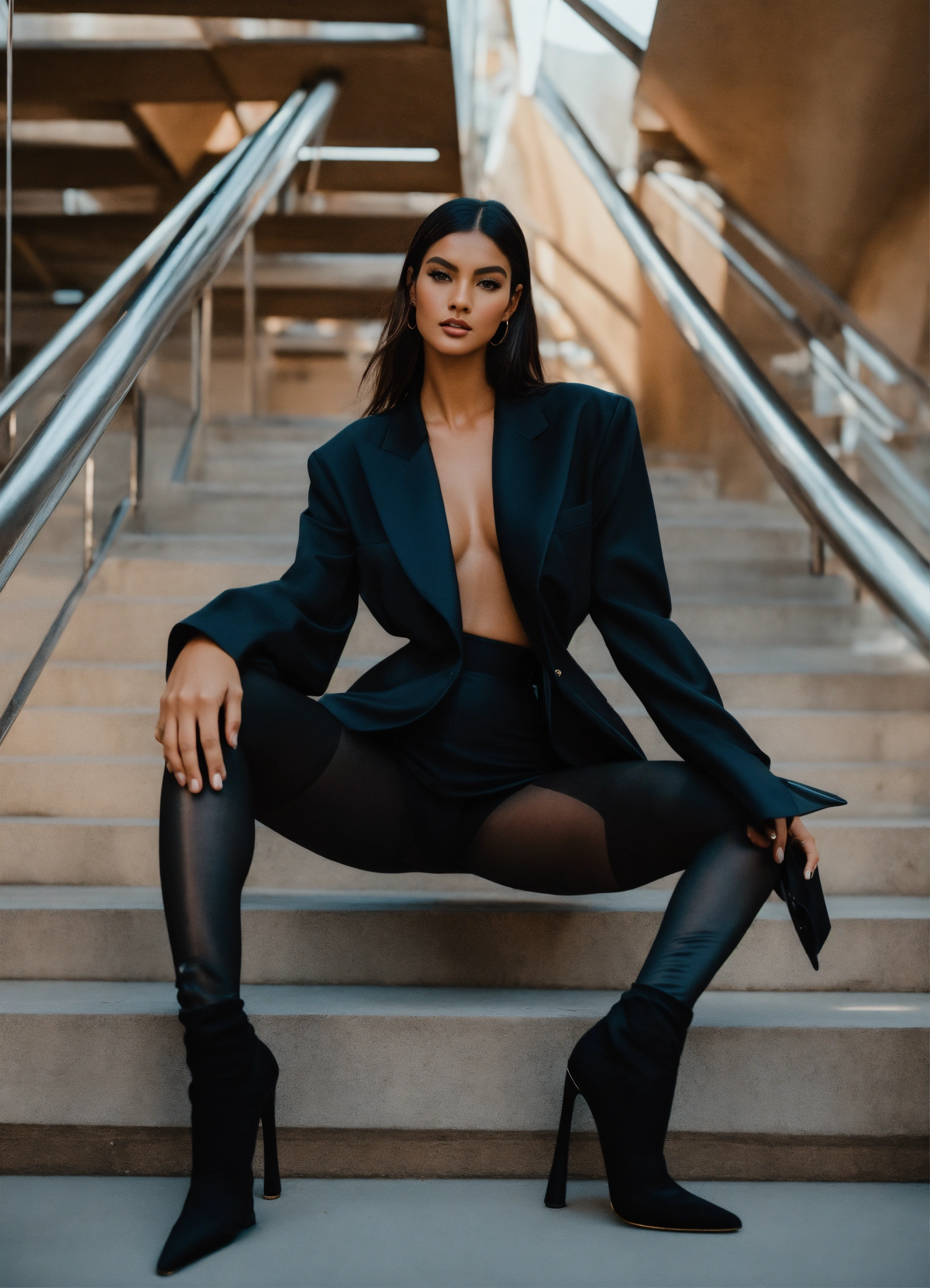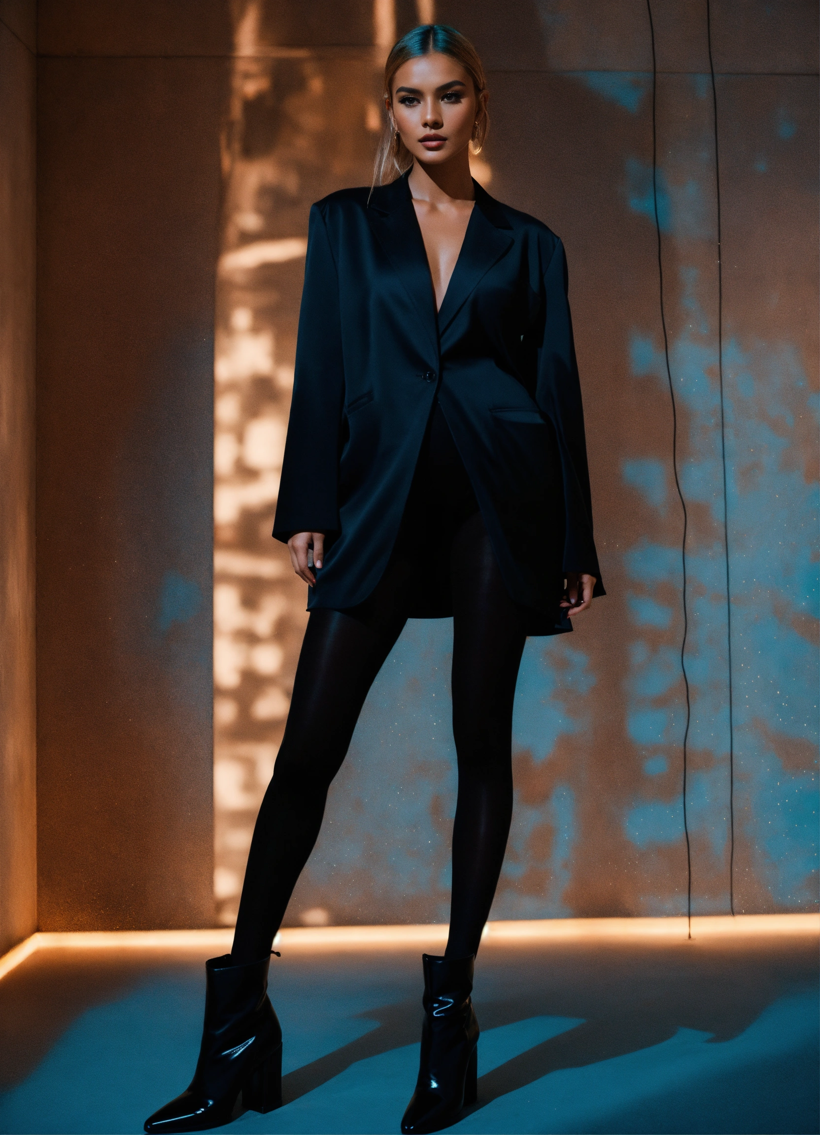 Create a visually stunning skims inspired photoshoot featuring a tanned supermodel wearing oversized black glossy faux blazer with sheer tights and boots, iso 400, surrealistic, 8k, full frame, minimalist and brutalist background, skims aestethic