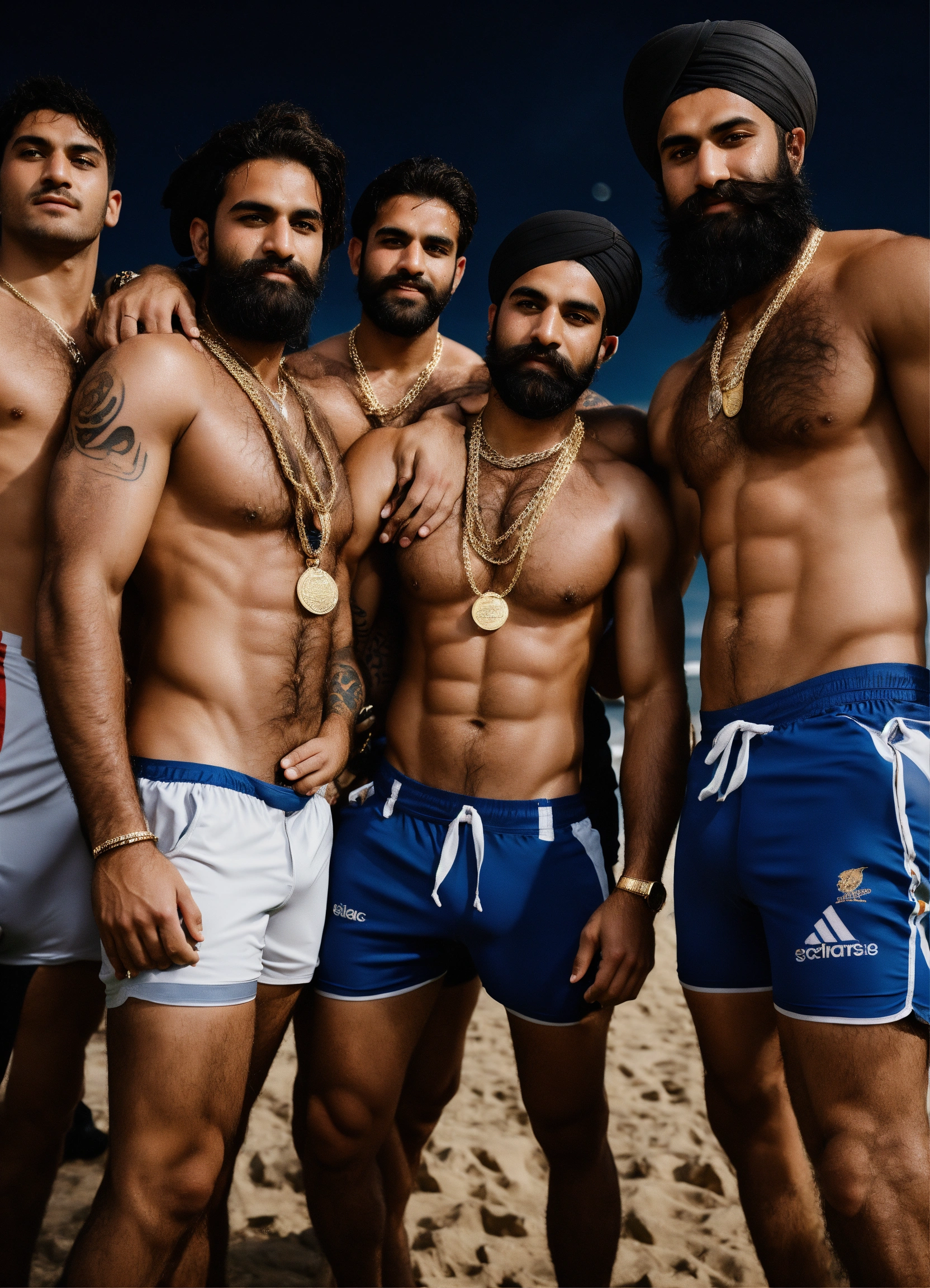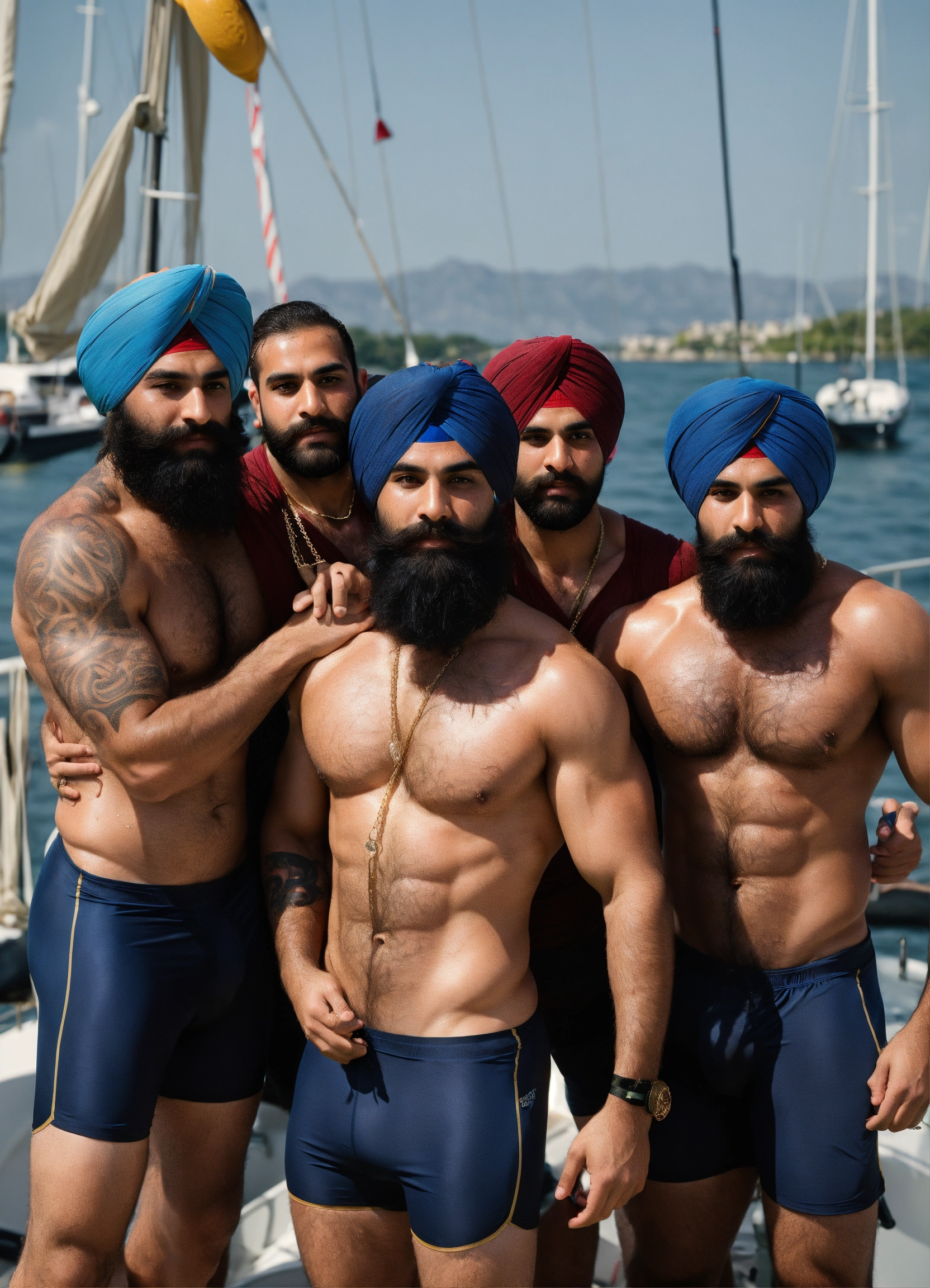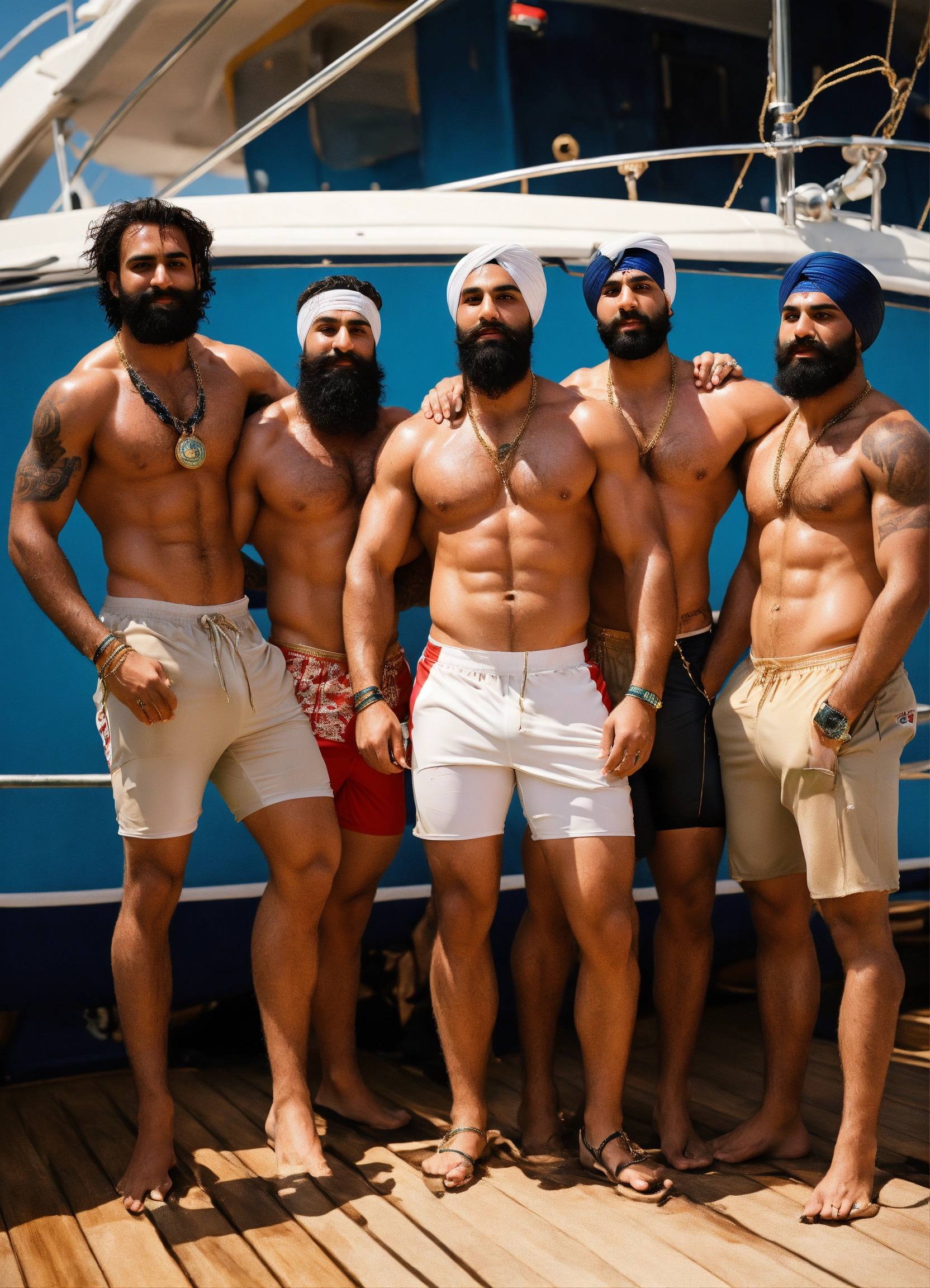 A group photo, group of rugby sikh men, touching each other, yacht, look rich, tattoos, gold chains, shirtless, full body, dad energy, (arms up), (sweaty), epic, hairy backs, hairy armpits, long hair, ((tight spandex shorts)), (bulge), sweaty, messy, dirty, beard, (hairy backs), (size difference), photography, high resolution, very detailed, smooth, clear, clean 4k in the style of bruce weber