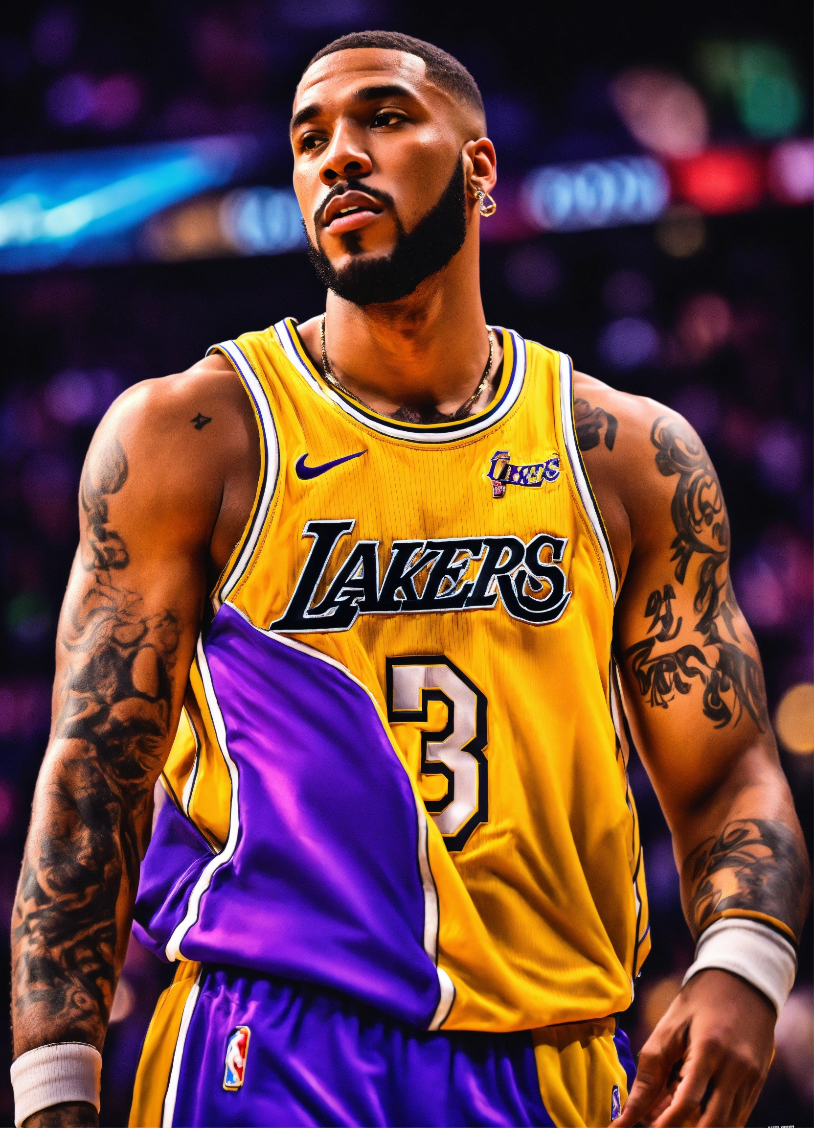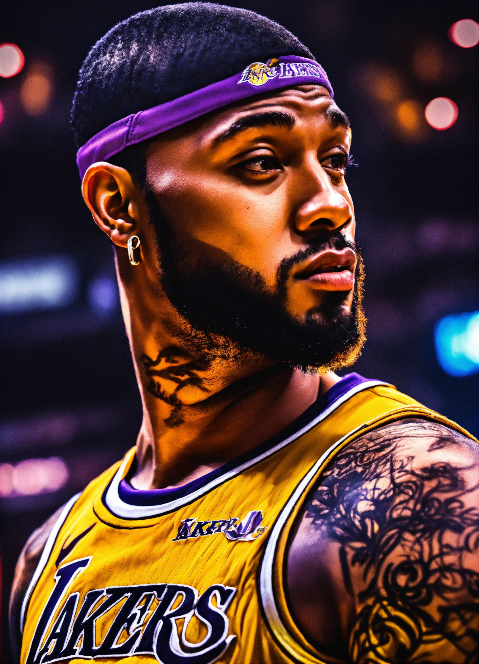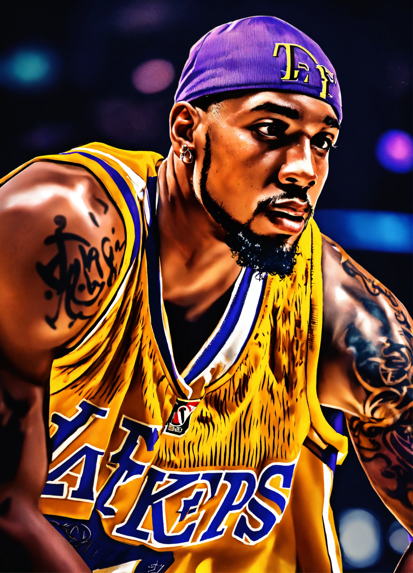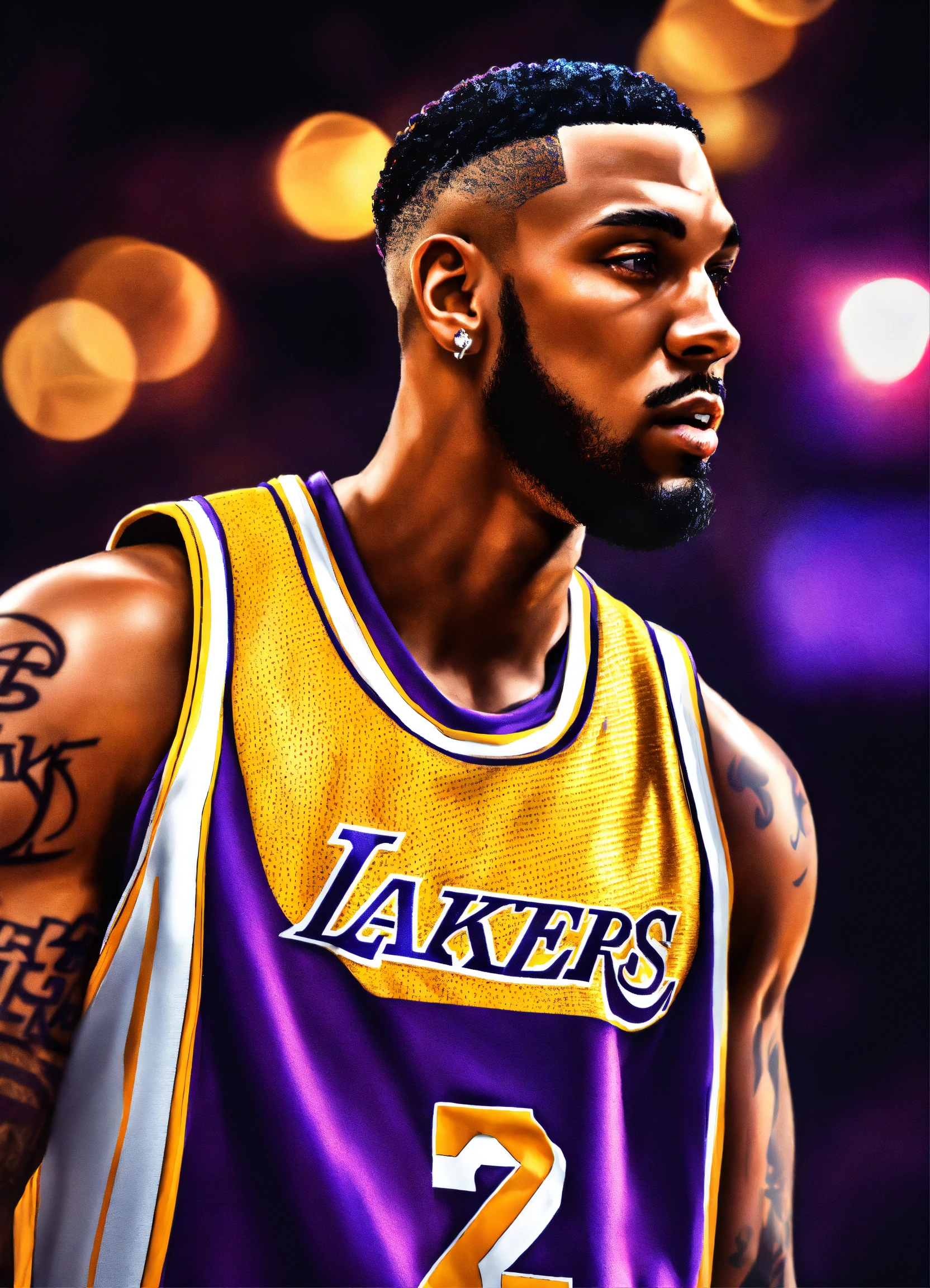 Close up of a rapper wear los angeles lakers jersey, iper realisti, digital art, digital paint, 8k, ultra realistic, iper detailed, hdr