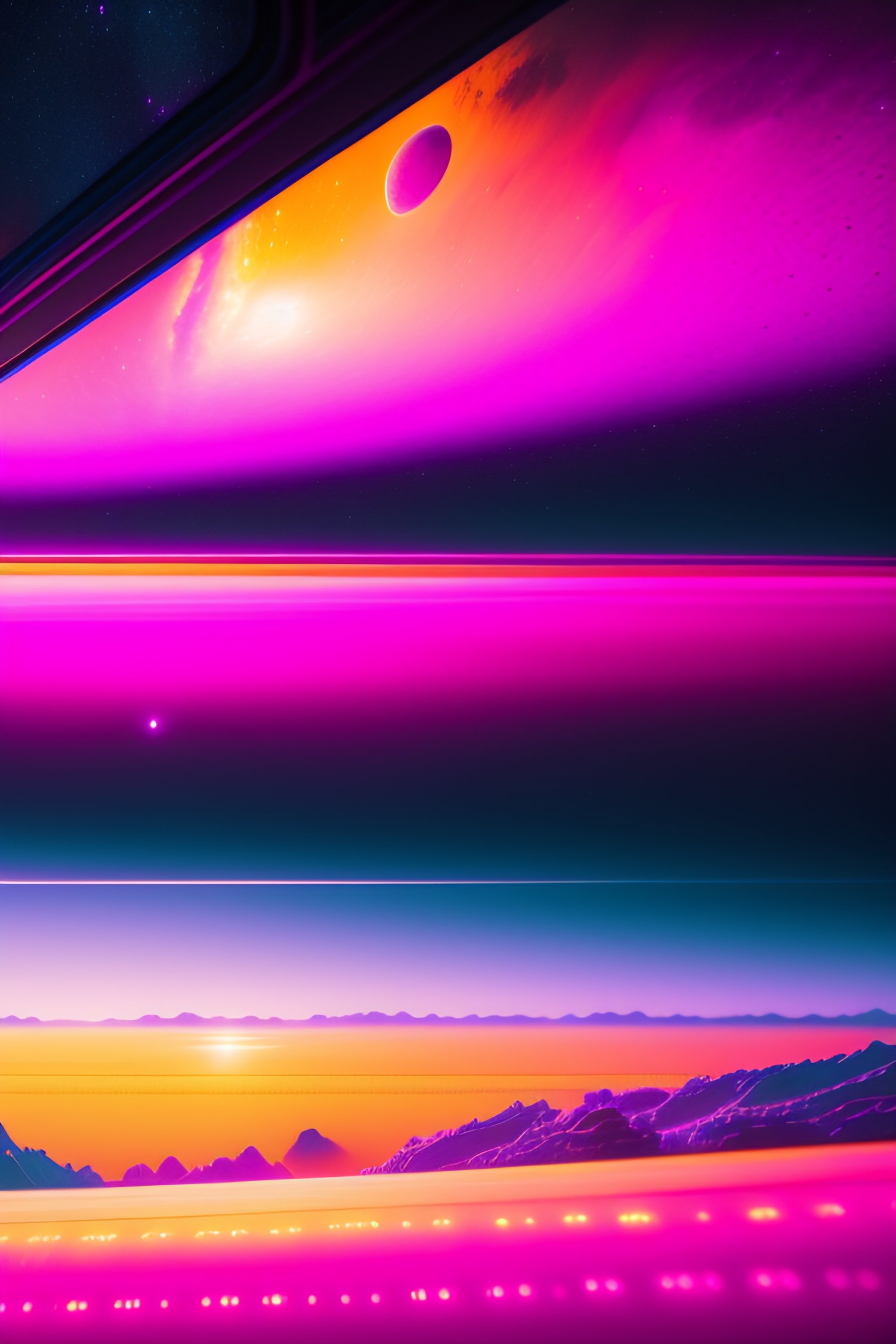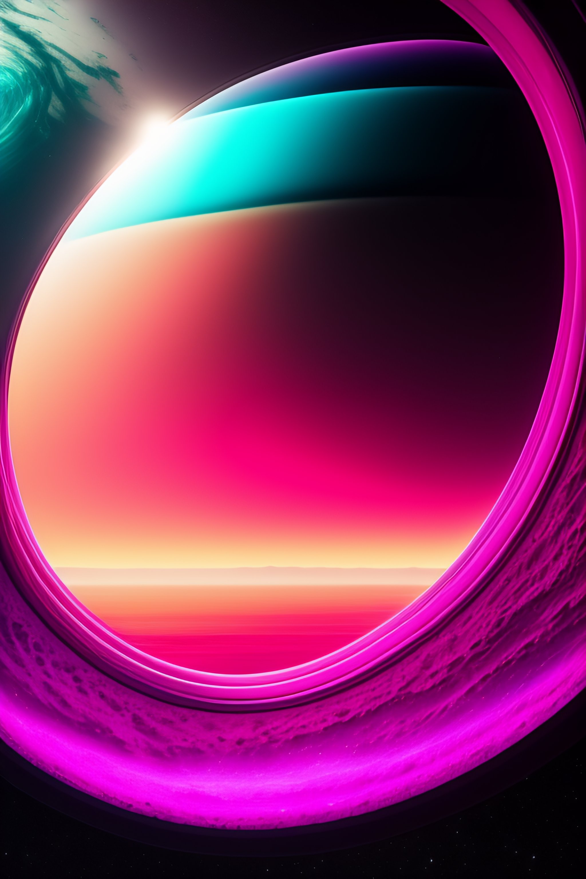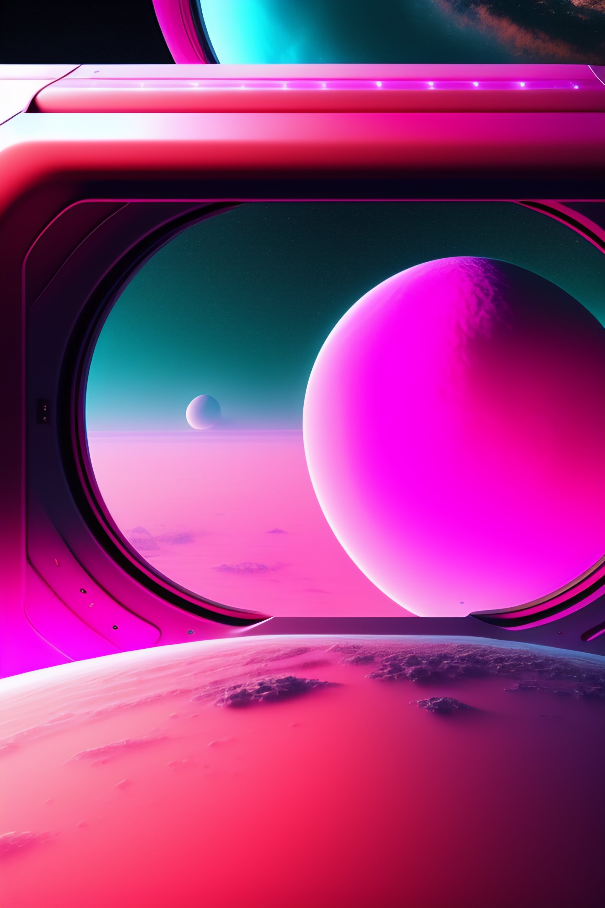 Photo realistic illustration by james clyne of a section of a planet seen from the small rectangular window of a spaceship approaching the planet, three-quarter perspective, the planet is all covered in a stormy gelatinous sea and some tiny parts of the land, highly detailed, image is dirty, dusty and foggy, dark, sad, mysterious, neutral and gray tinted colors with few fluorescent pink details, uhd, hq, 4k