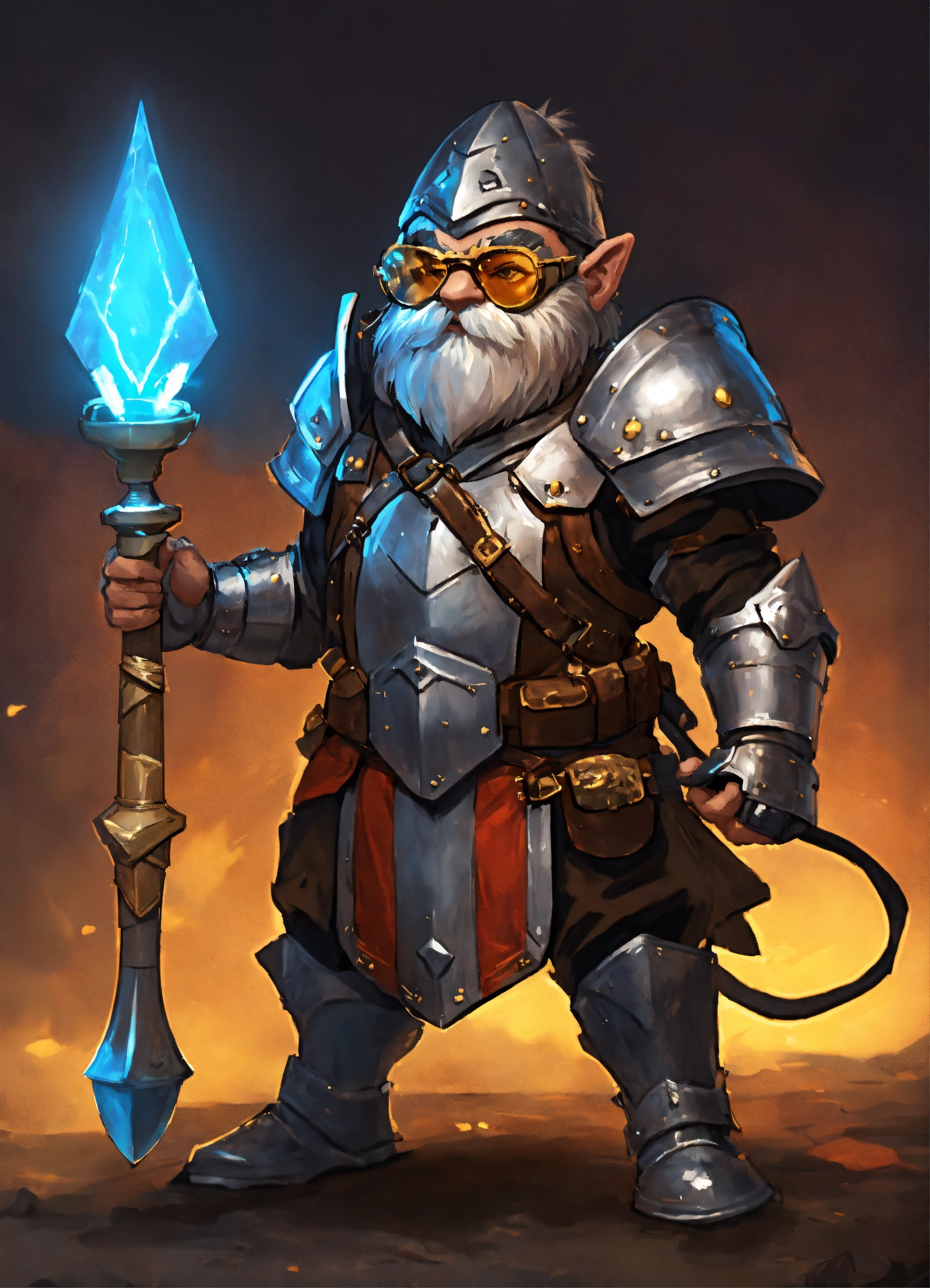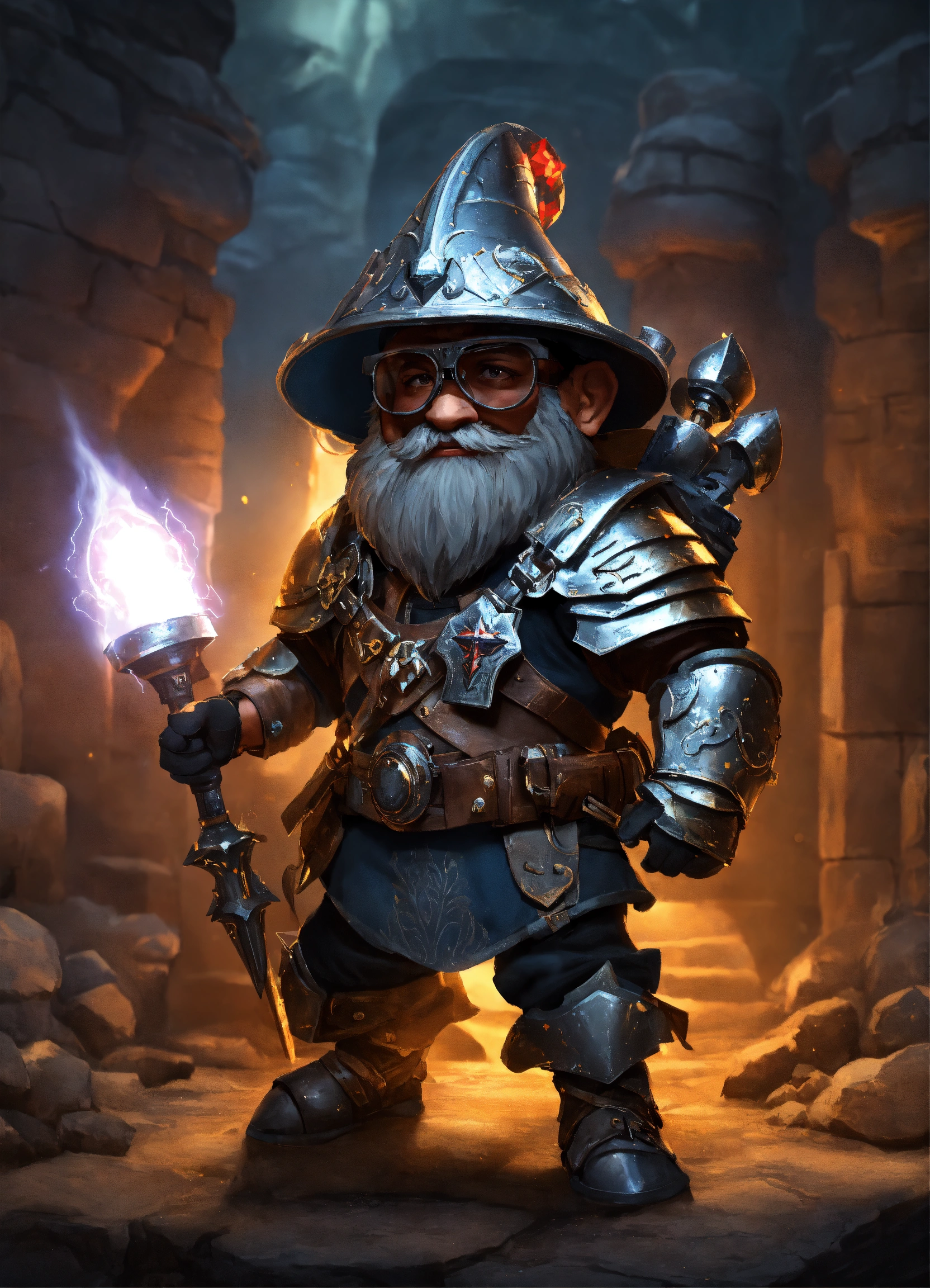 Armorer artificer rock gnome with big head and glasses with black skin, on a heavy dark magical homemade armor, magic pulsing through the armor, wearing black medieval visor on a helmet, combat breastplate, heavy armor like a medieval exoskeleton, empty handed with electric gauntlets, boxer pose, gauntlet with electricity