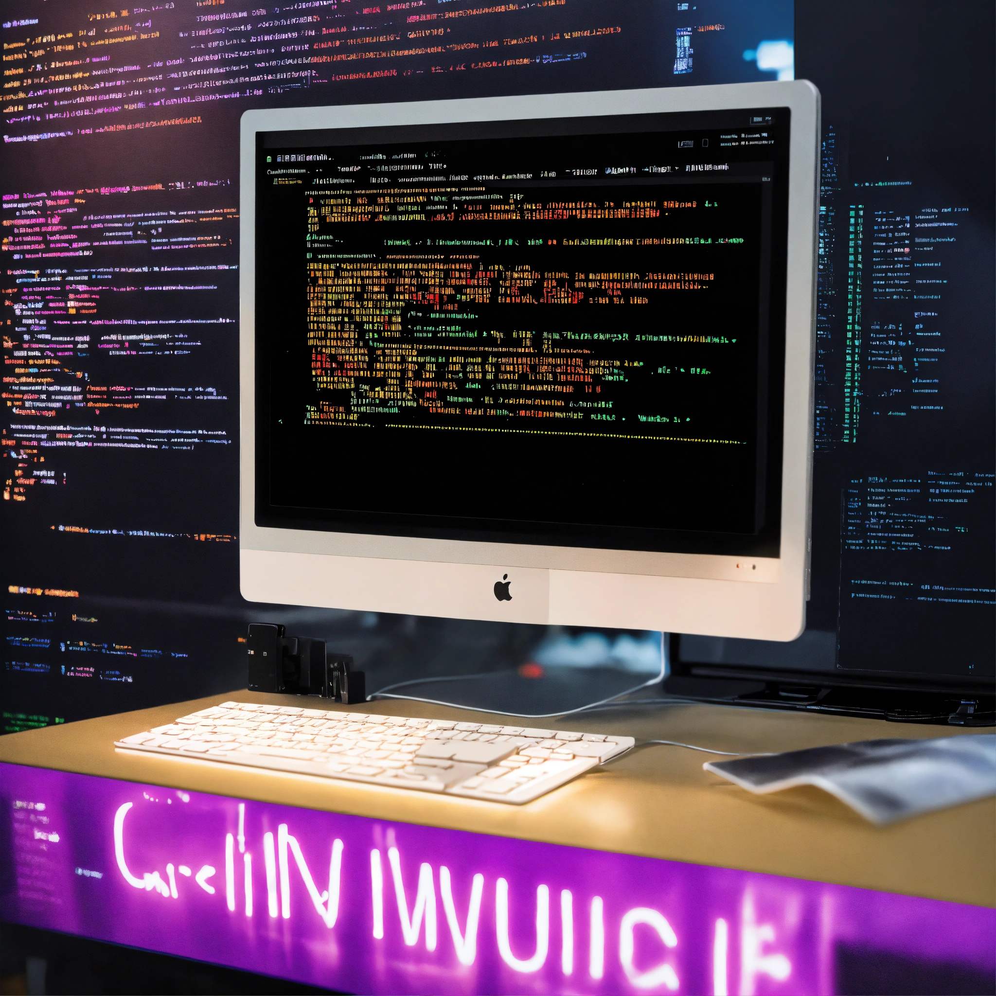 A photo of a computer screen with a coding program open, the program is in dark mode and the text is white, there are a few lines of code in the background