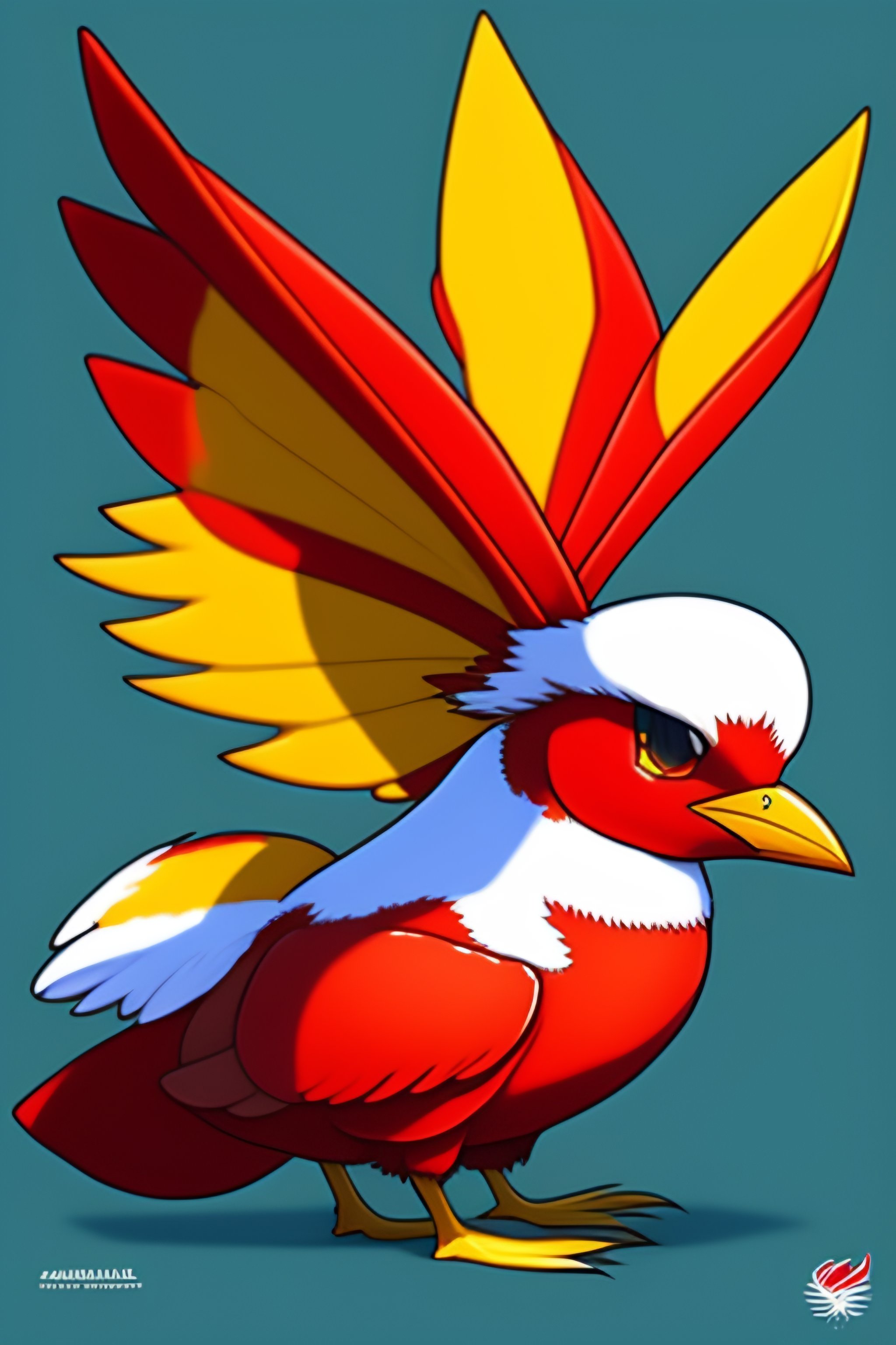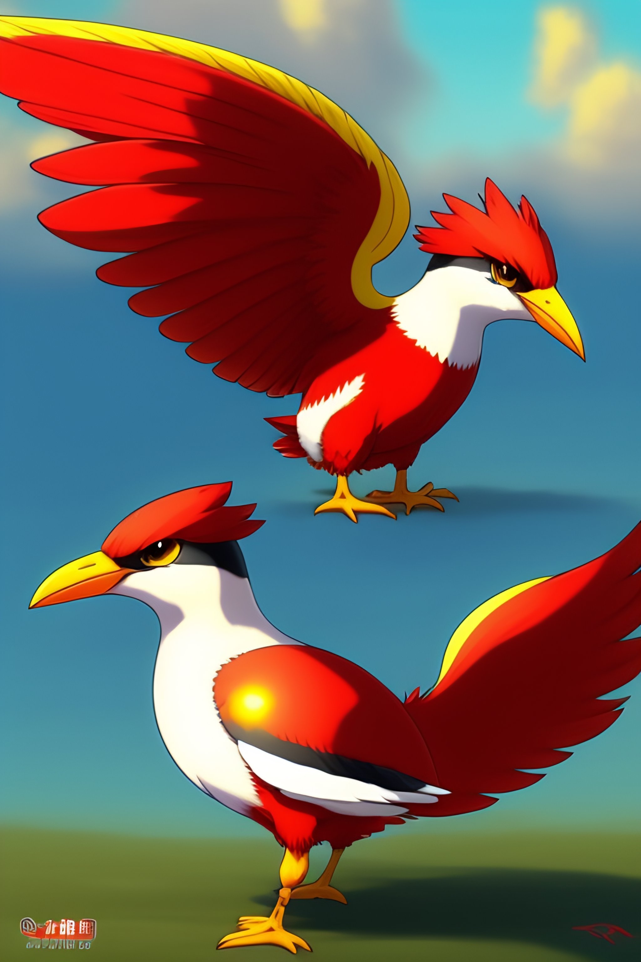 Flying and fire type pokemon based on a tern seagull, controls the sun, third stage pokemon, color scheme yellow red and white, tail feathers look like a sail, wears a seashell on its head, cute, fakemon, drawn by ken sugimori, concept art