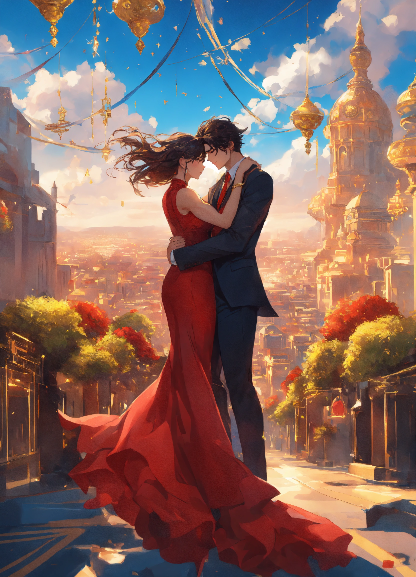 Illustration of beautiful city with crystal towers, vibrant colors, blue sky, fair skin, the young man wears a jet black suit with gold ornaments, has wavy black tousled hair, the woman wears a red dress with gold adornments that shows legs, she has muscles, maximalist, 8k photo, animestyle, by artgerm, trending on artstation, windy, dynamic, landscape, perspective, hugging