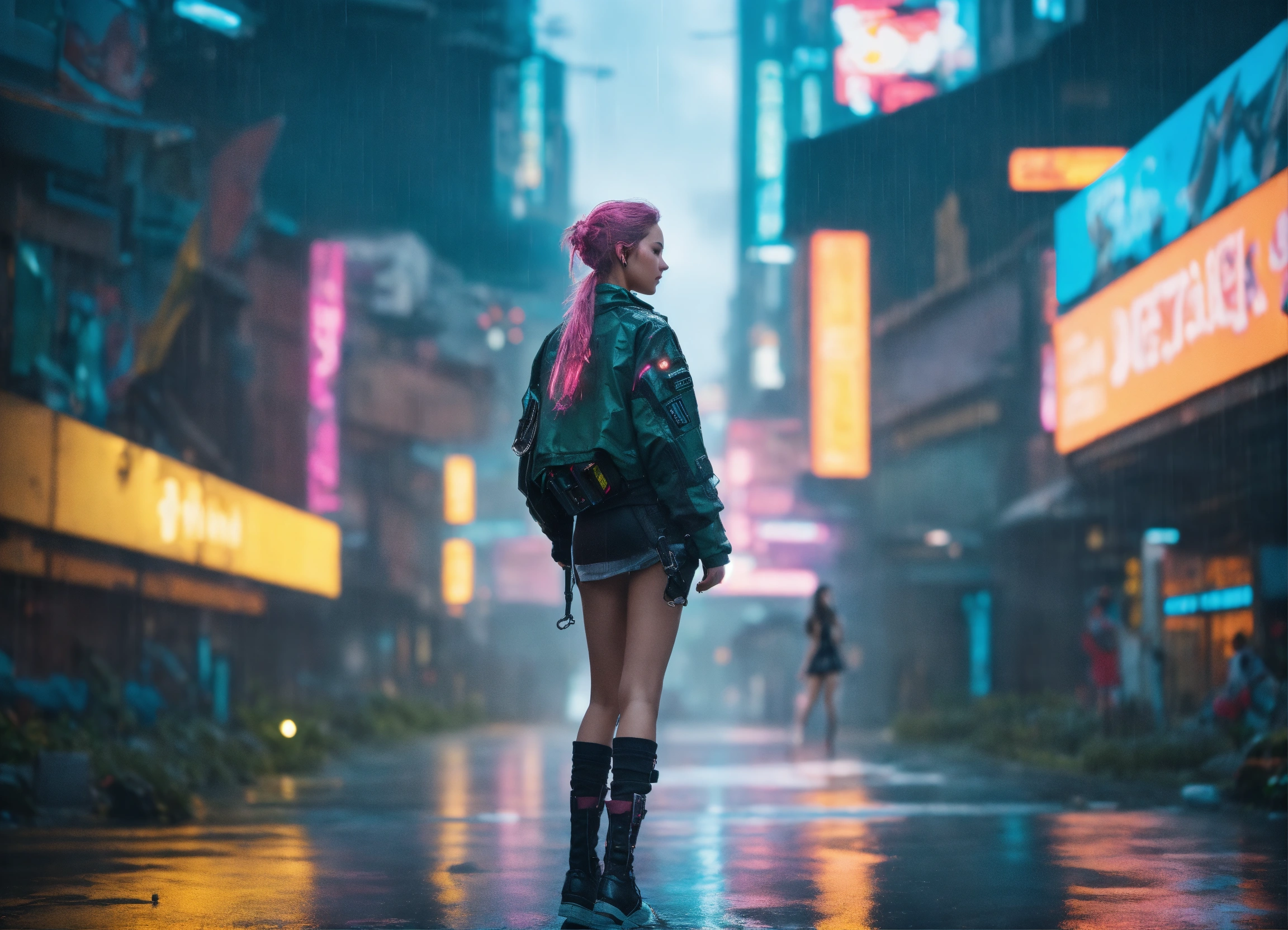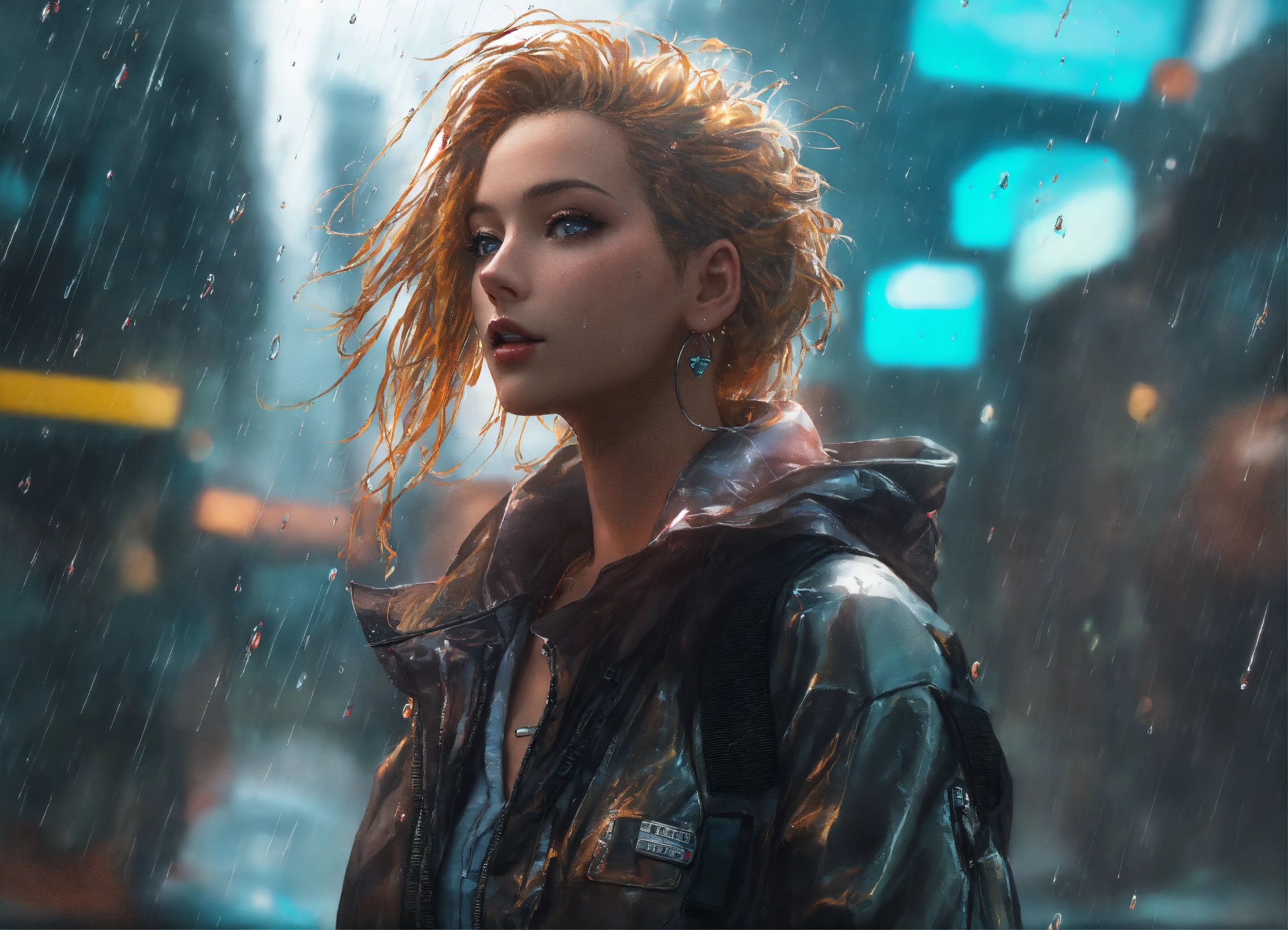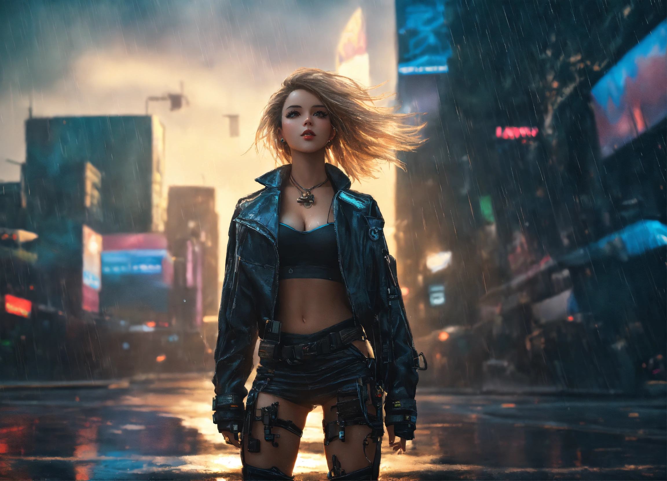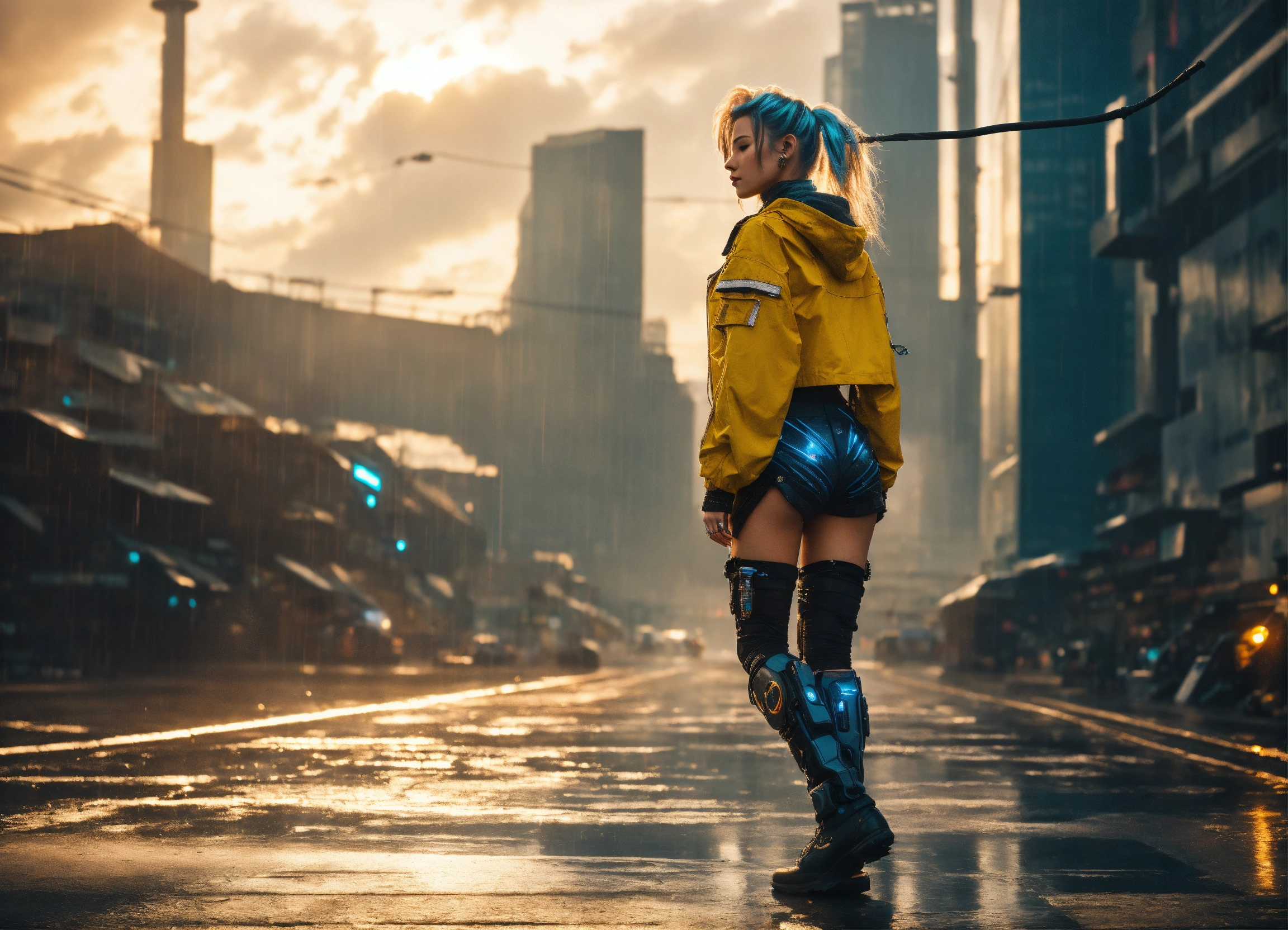 Bottem view full body high detailed photo realistic natural photo cyberpunk dream girl, futuristic, sunny weather day rain whipping hair