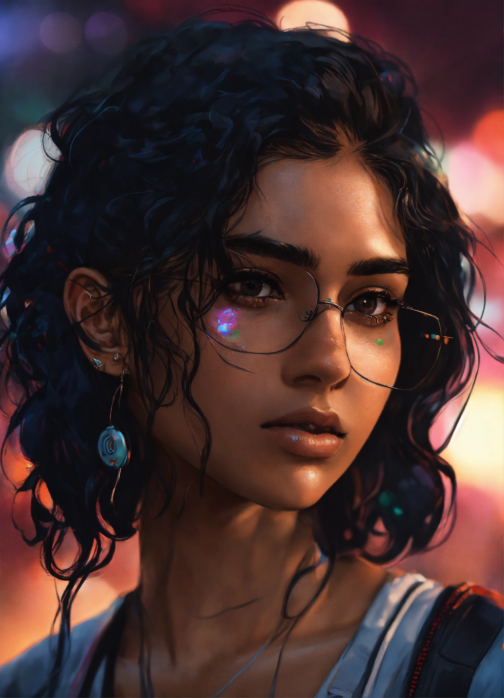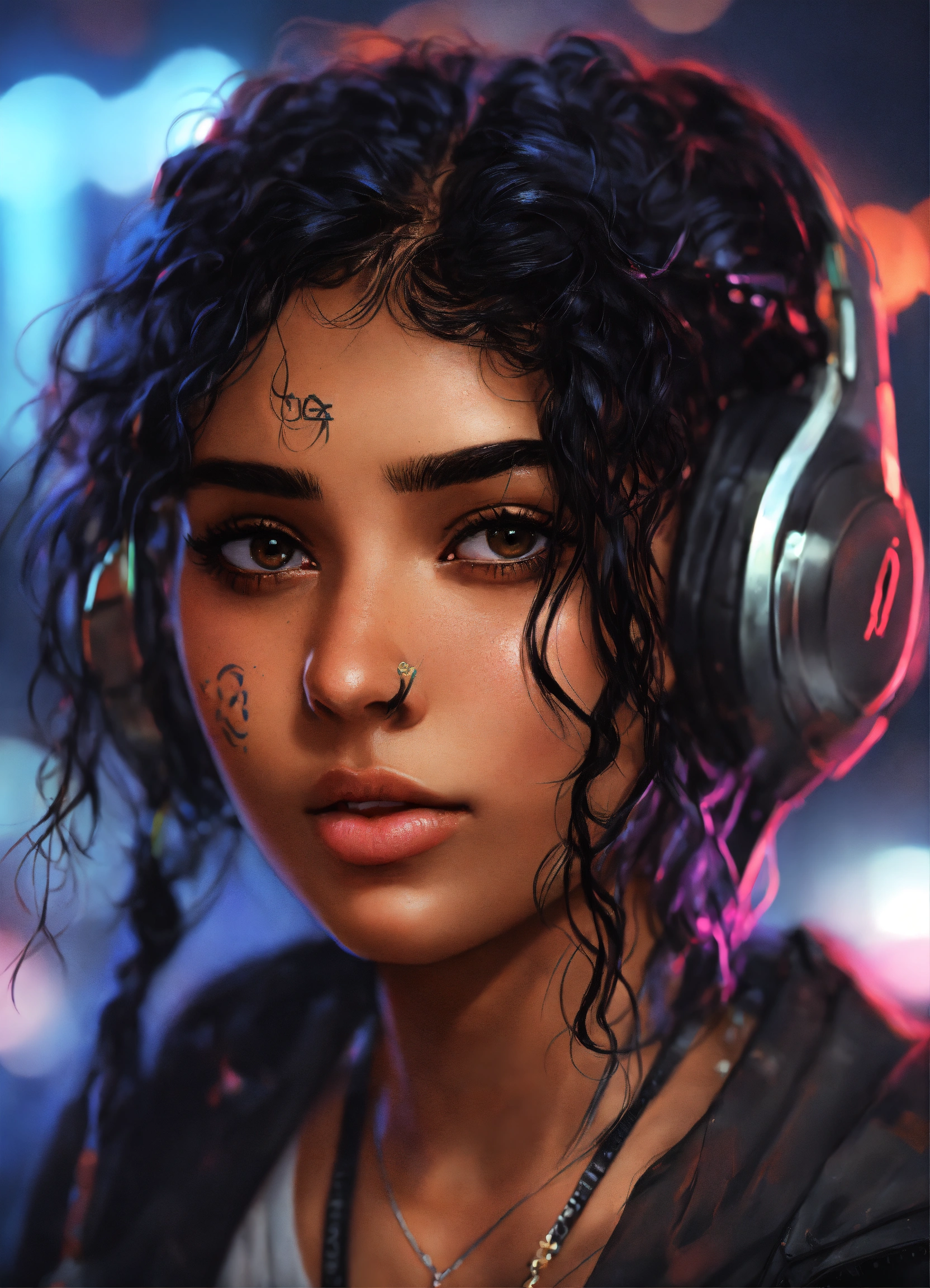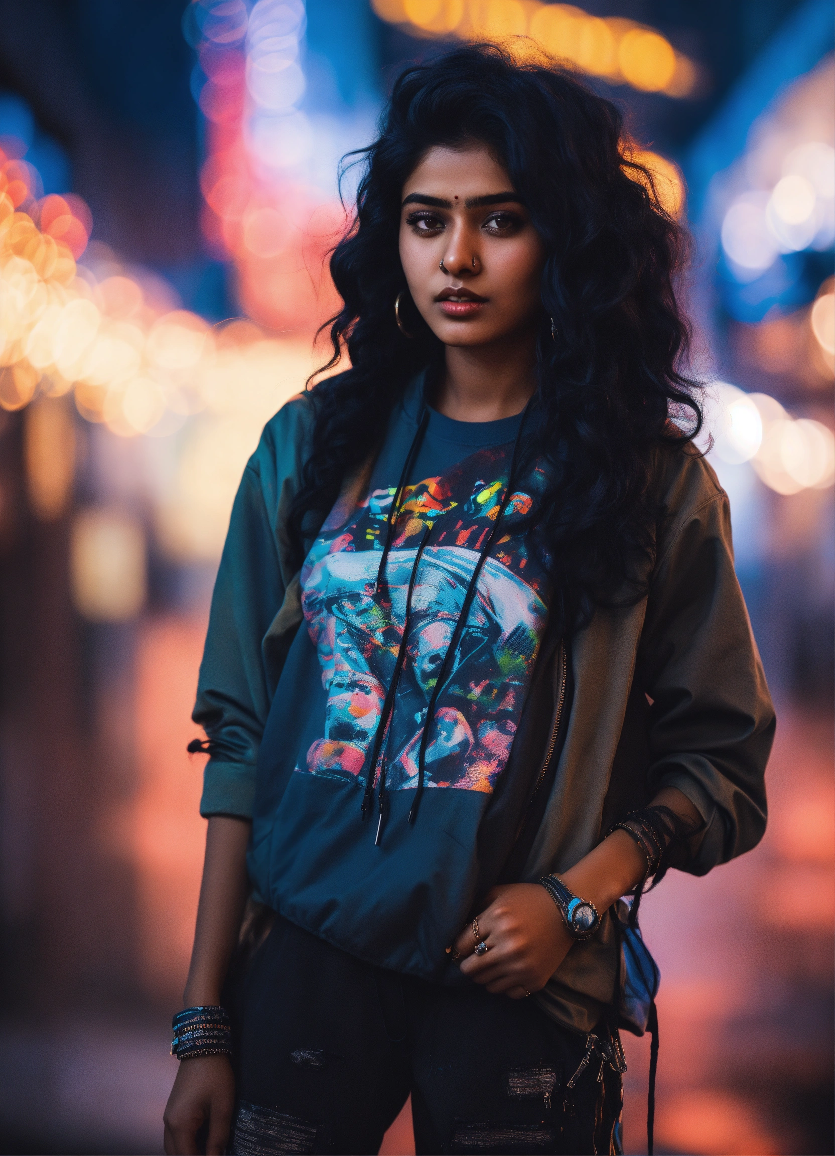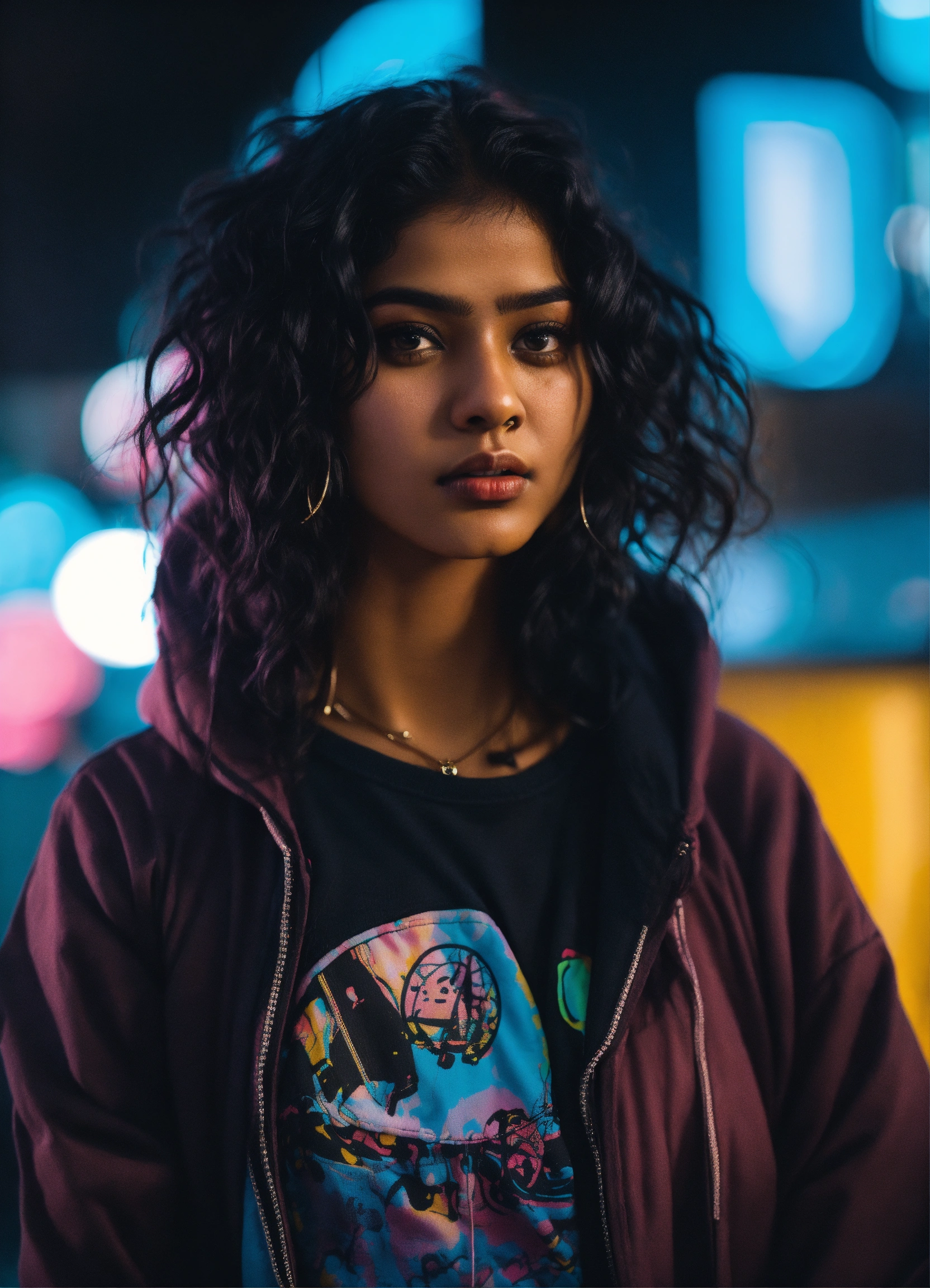 Highly detailed portrait of indian 21 year old woman, wavy black hair, cyberpunk, wearing streetwear, cartoon realism, black, grunge aesthetic!!! bokeh