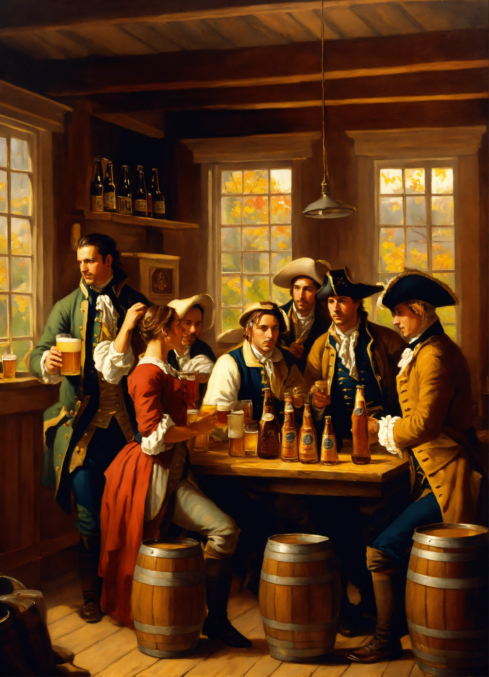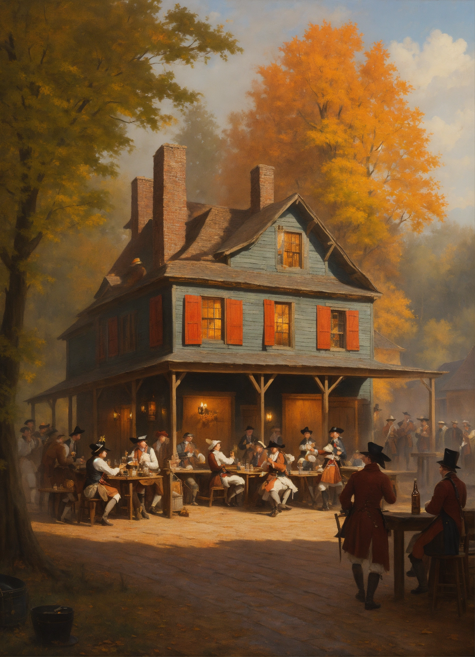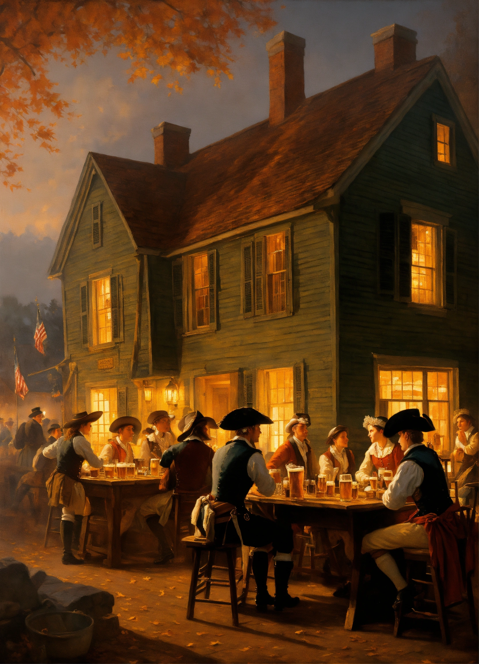 A painting of a colonial tavern with people drinking beer. greg rutkowski, autumn, american revolution, brewery, beer, music, song, dance