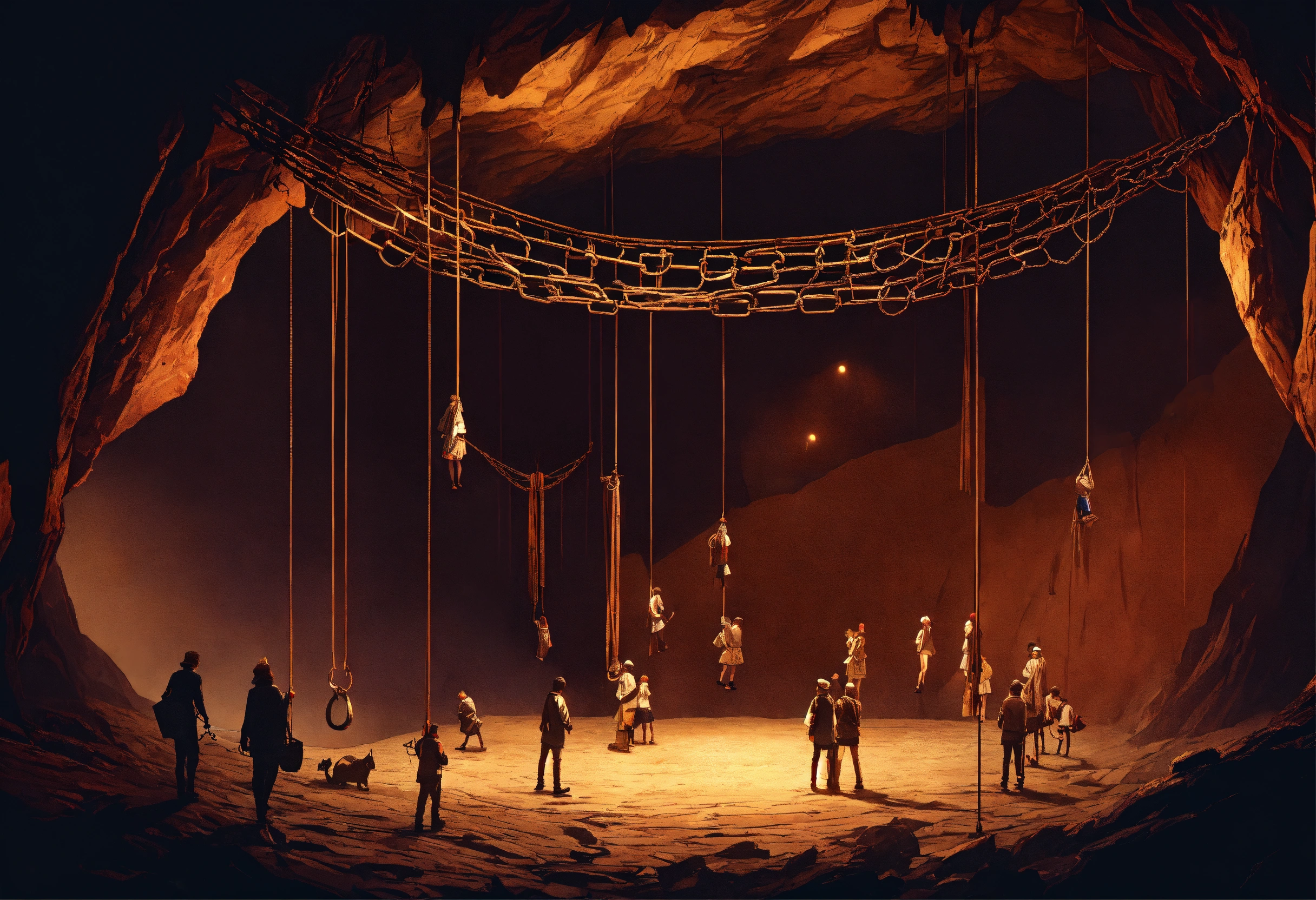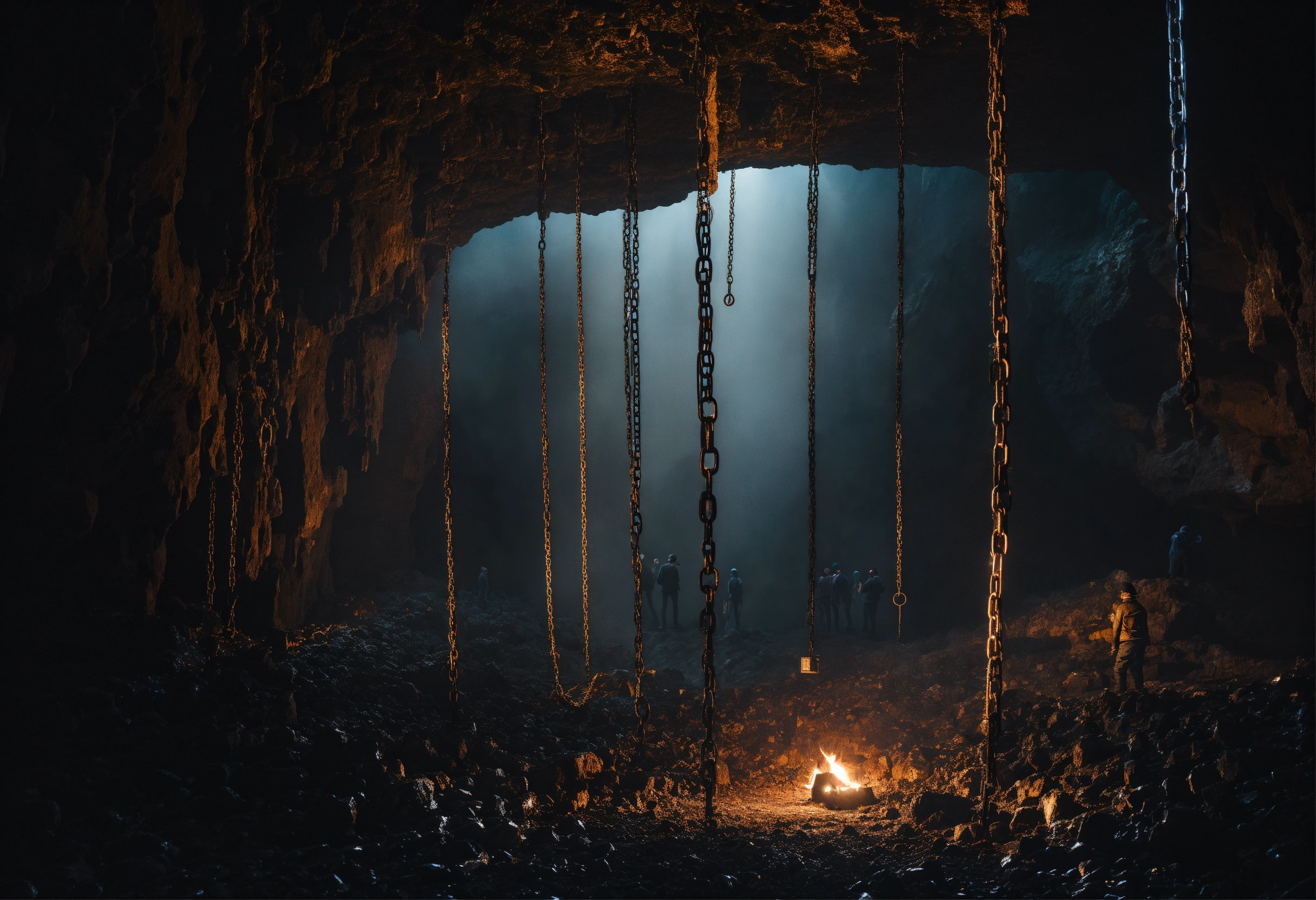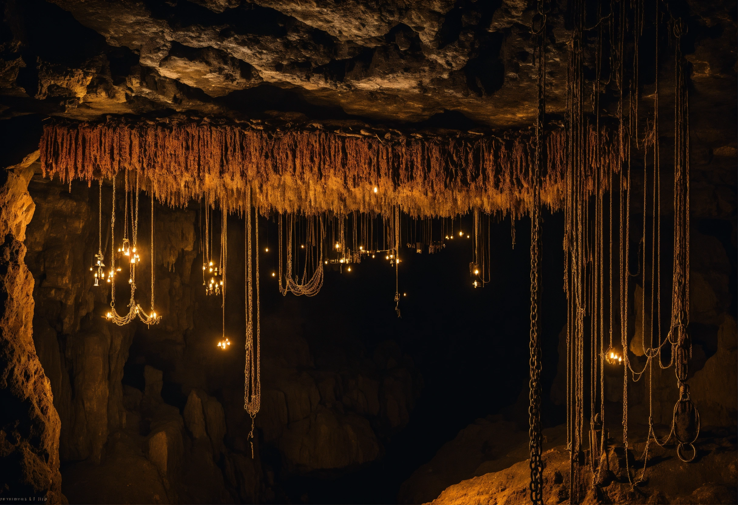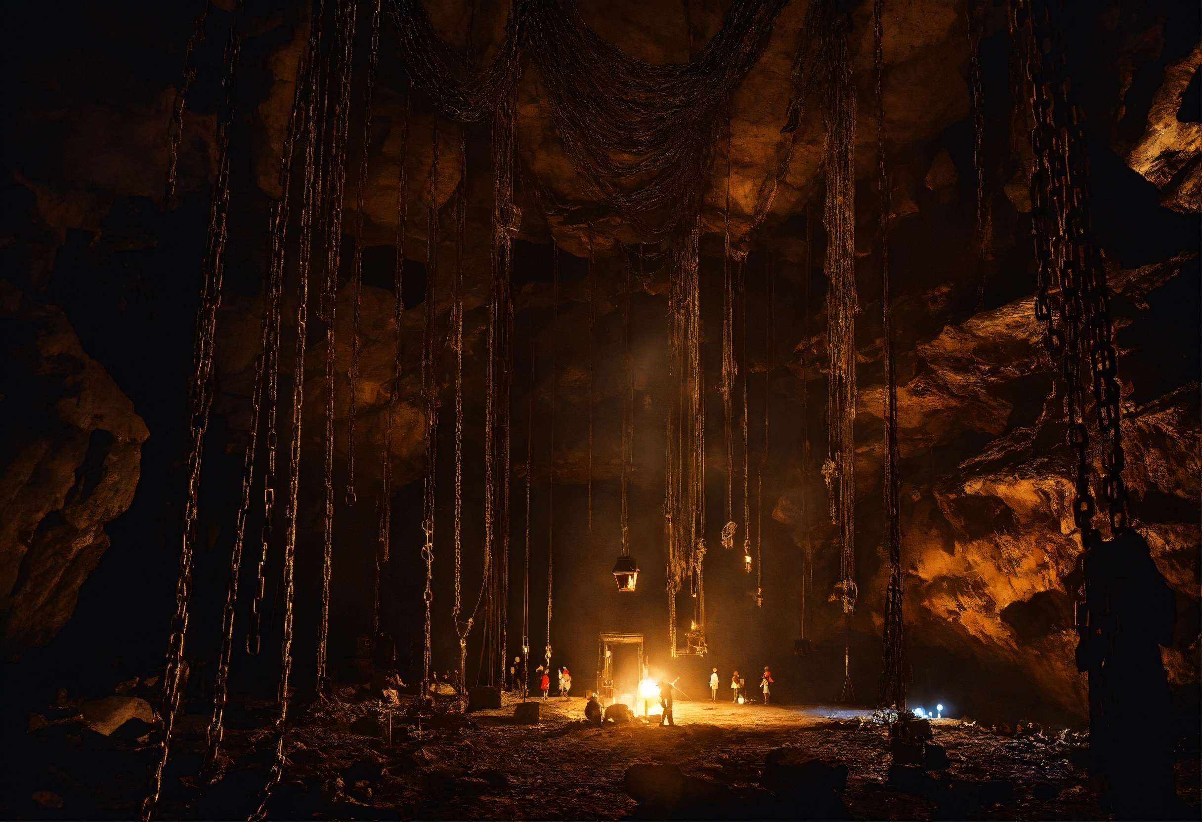 A scary dark cave in which there are many chains with people hanging on top
