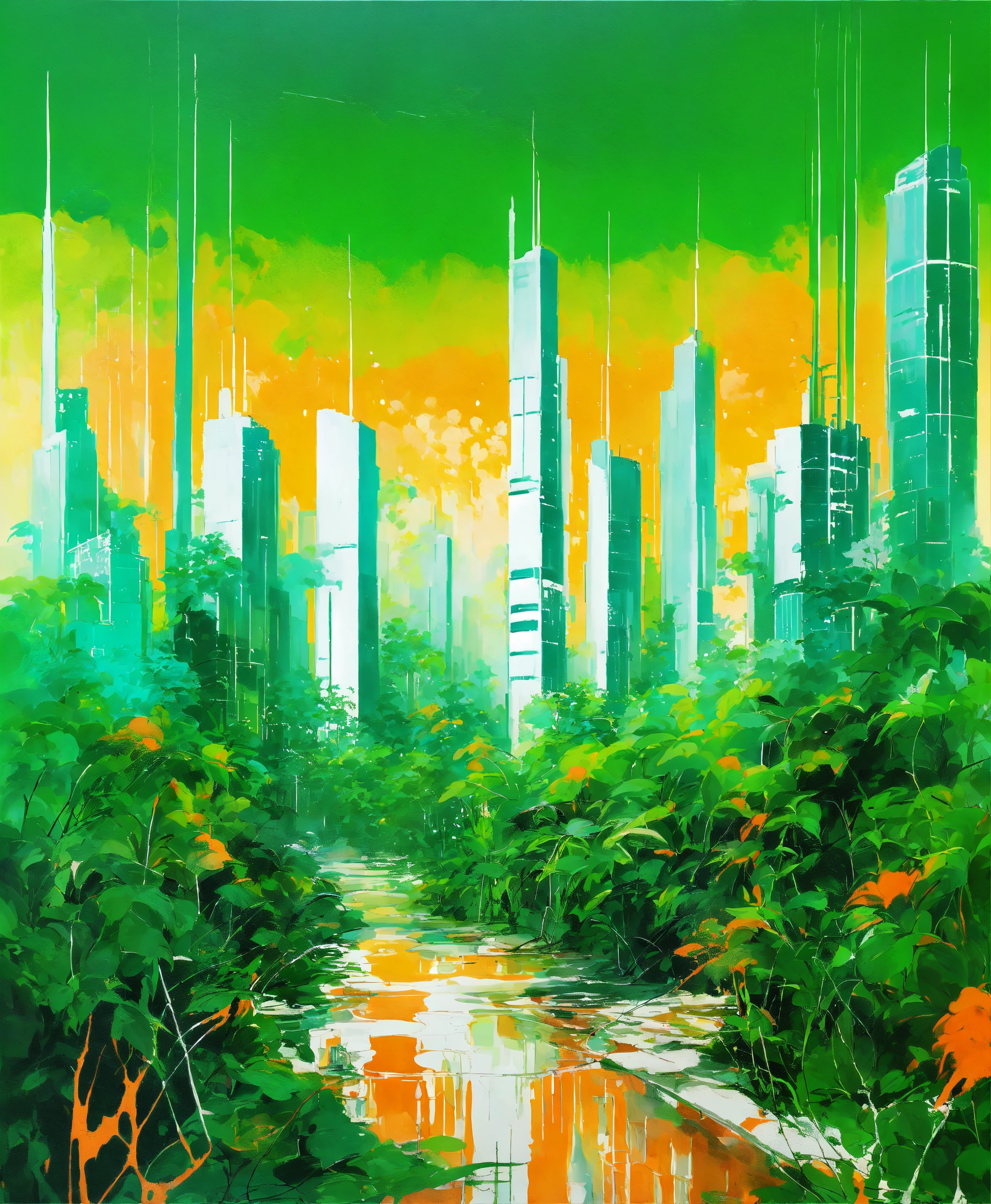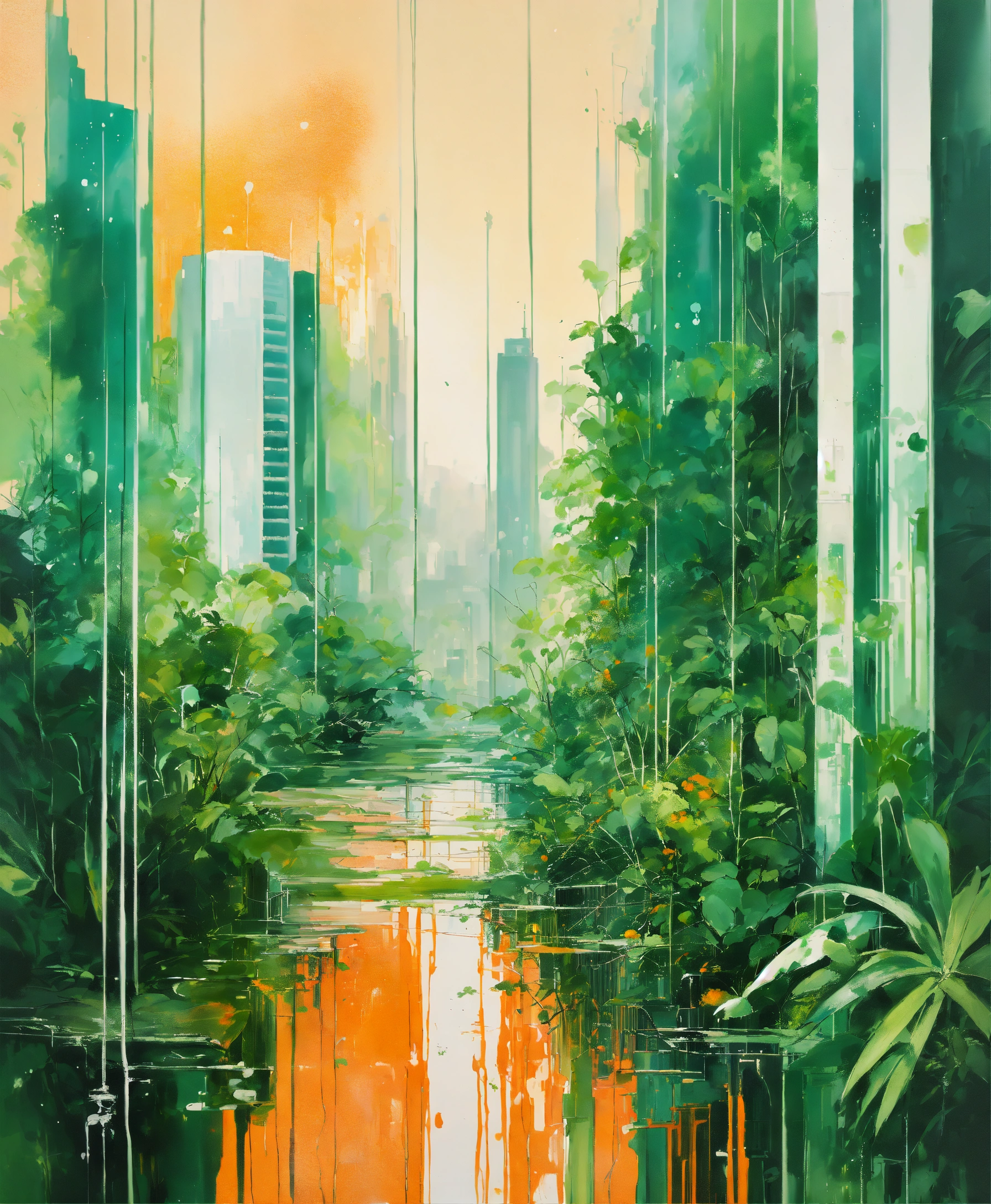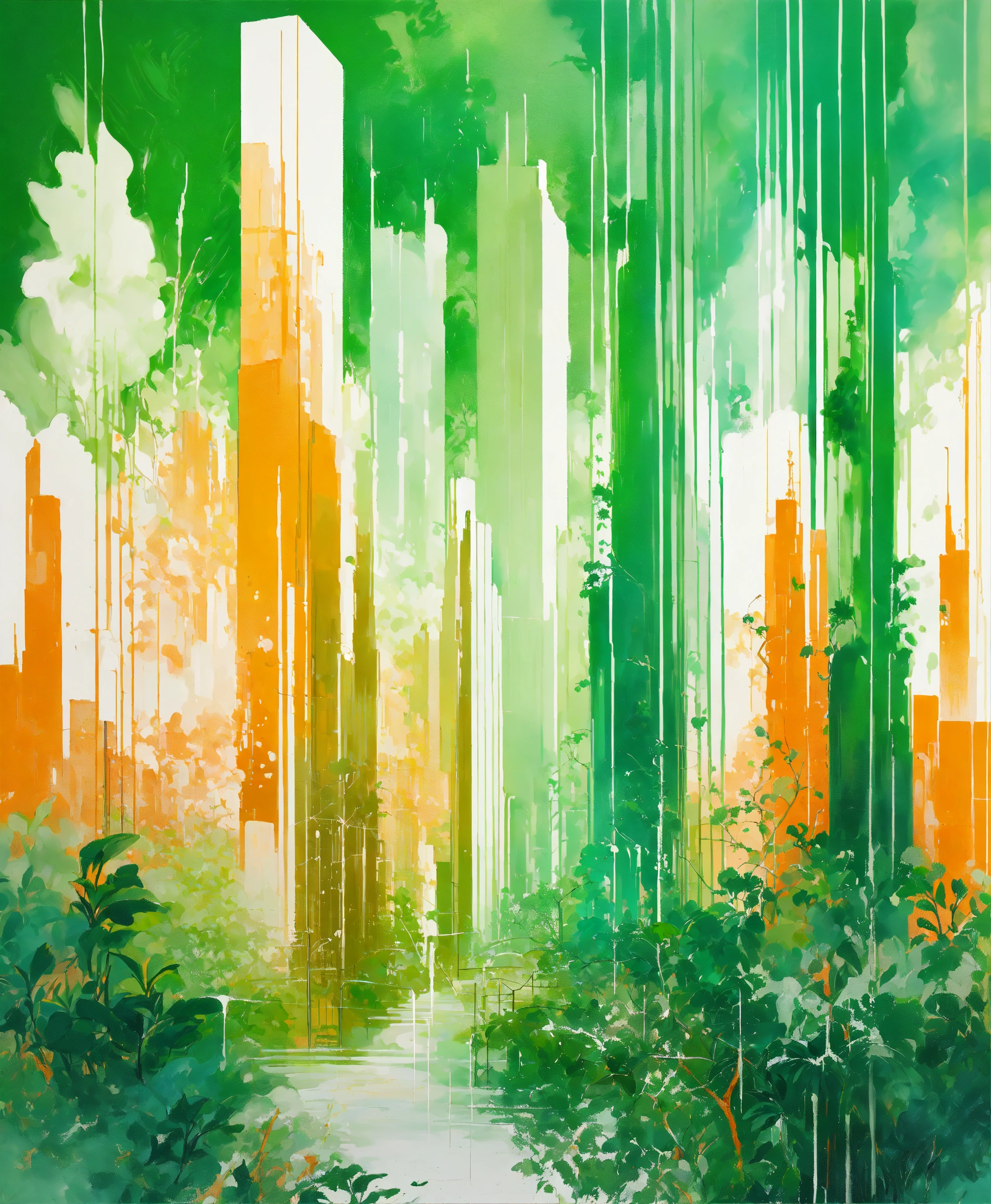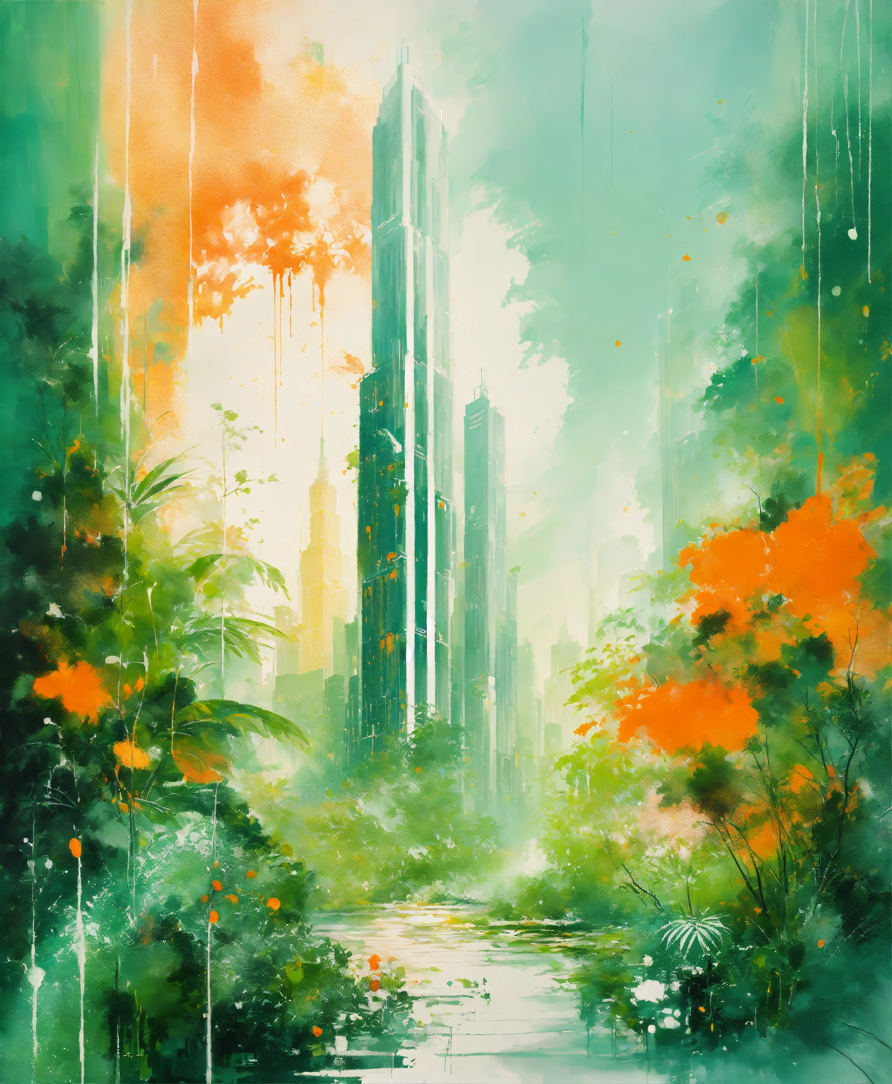 Painting art, (((jungle skyscrapers futuristic towers with lush green plants))) light white and orange pastel minimalist acrylic aqua on a white background, oil paint drips infinite inception diffused splatter twisted lines white orange white highlights tones, wallpaper of painting of a multicolored