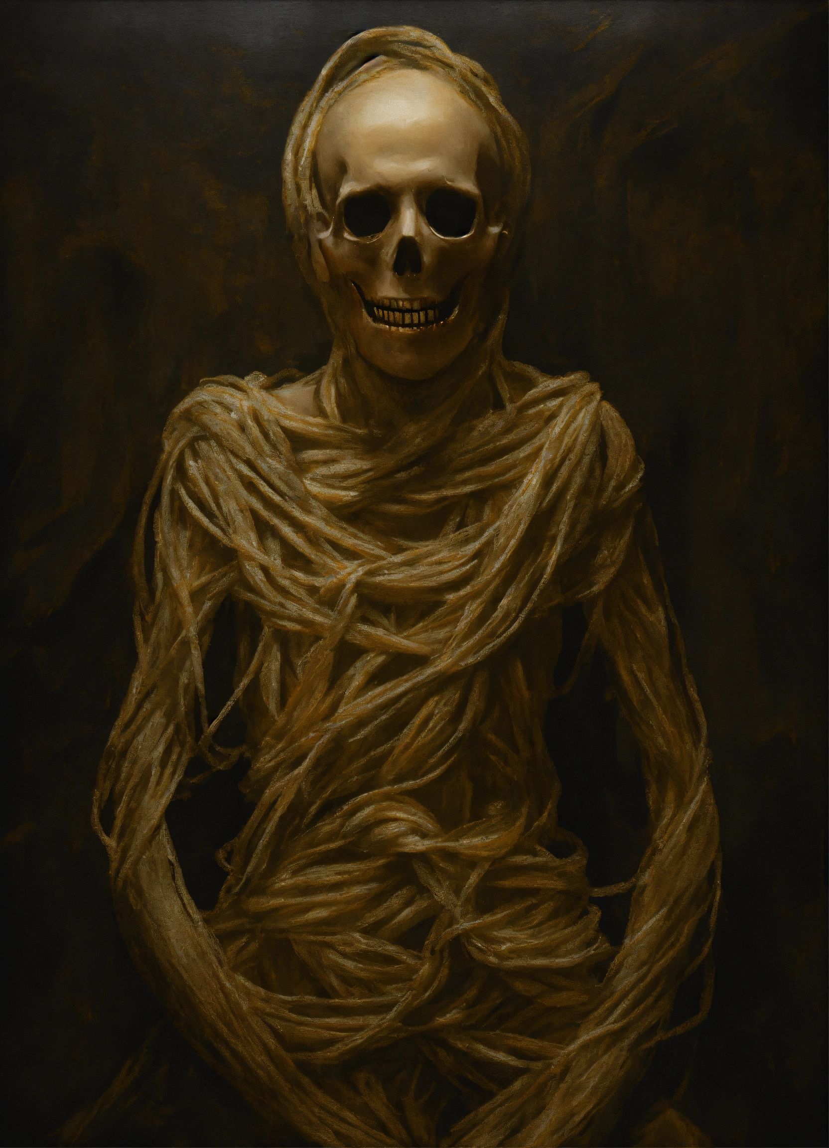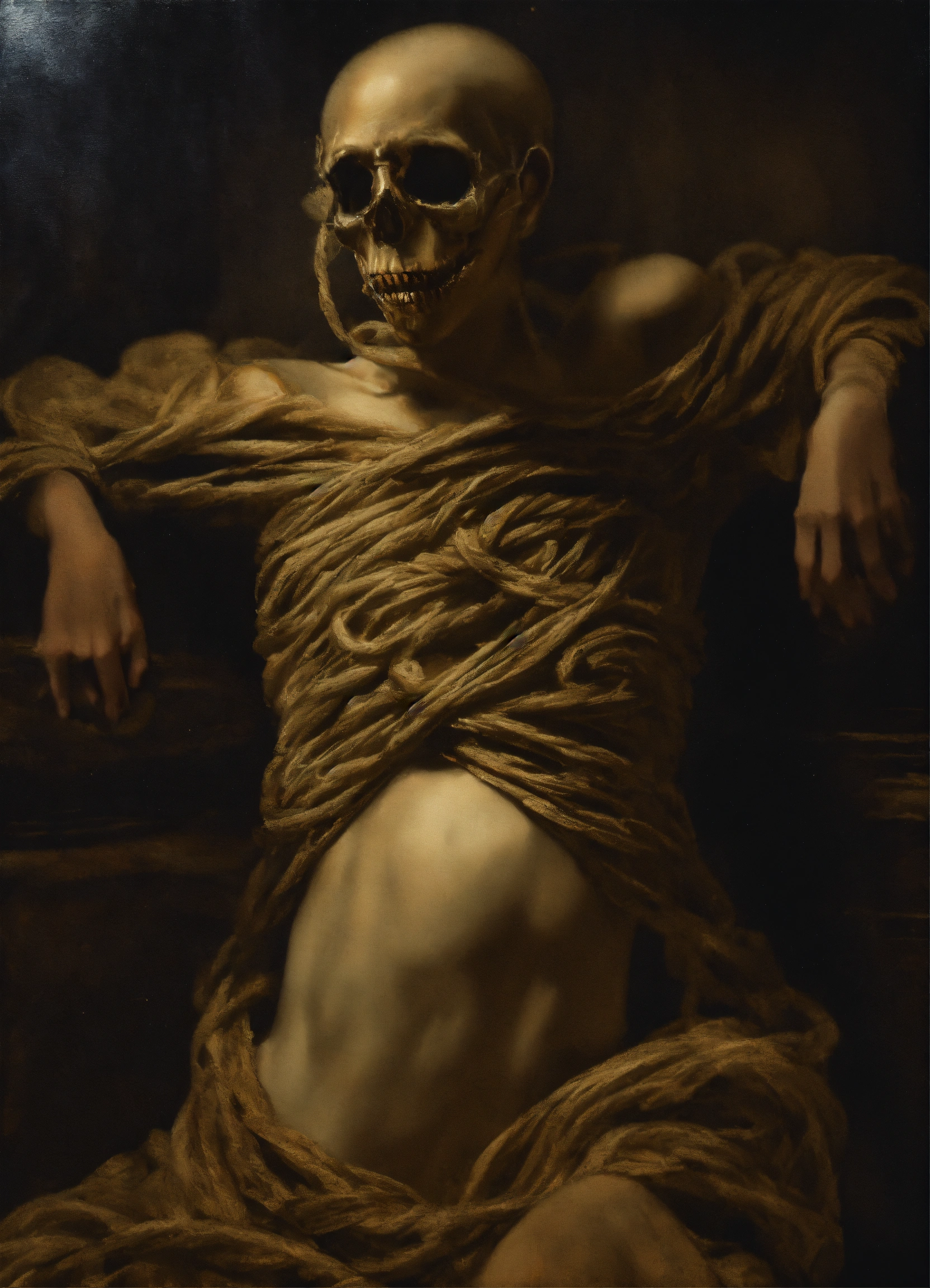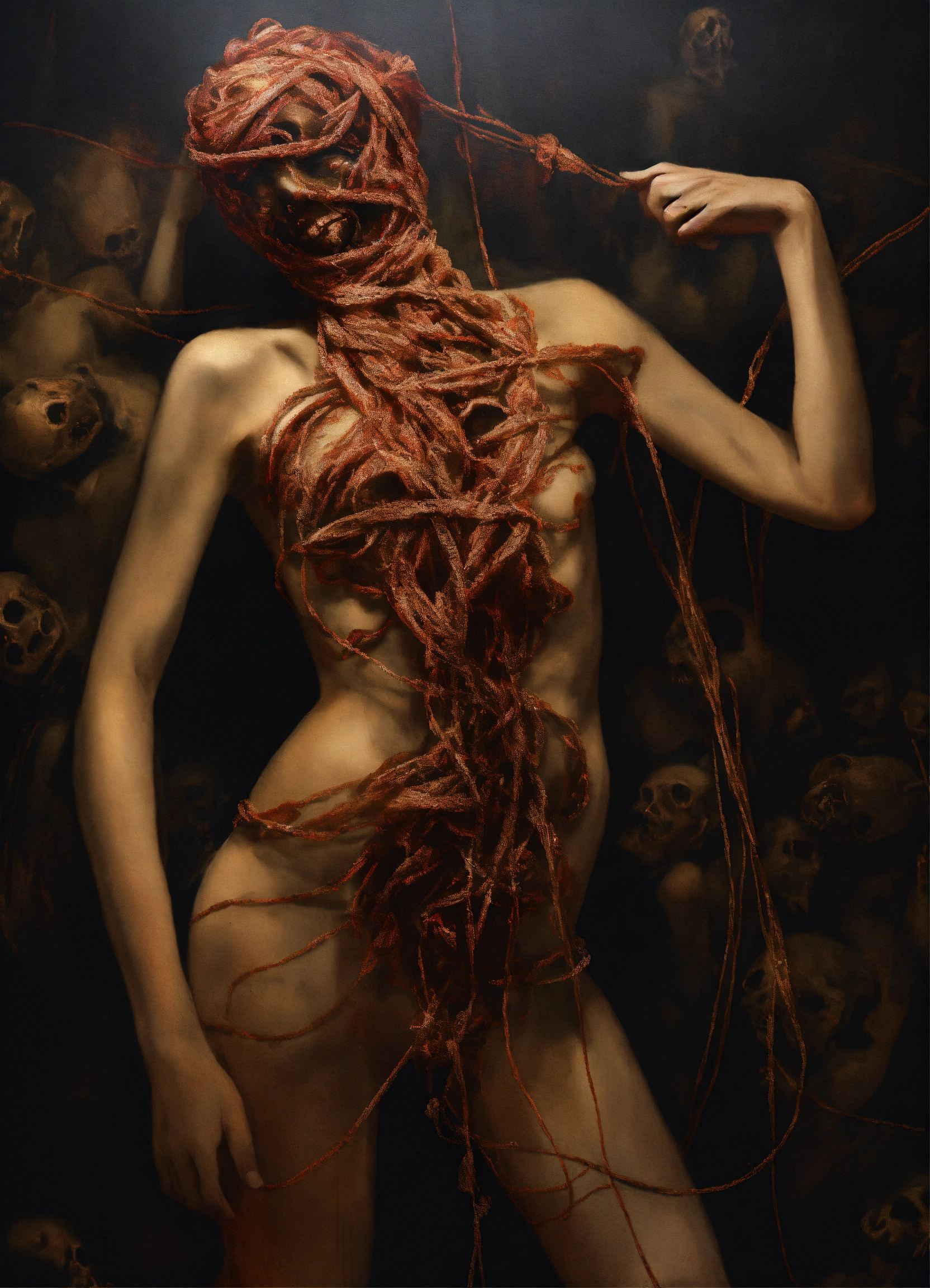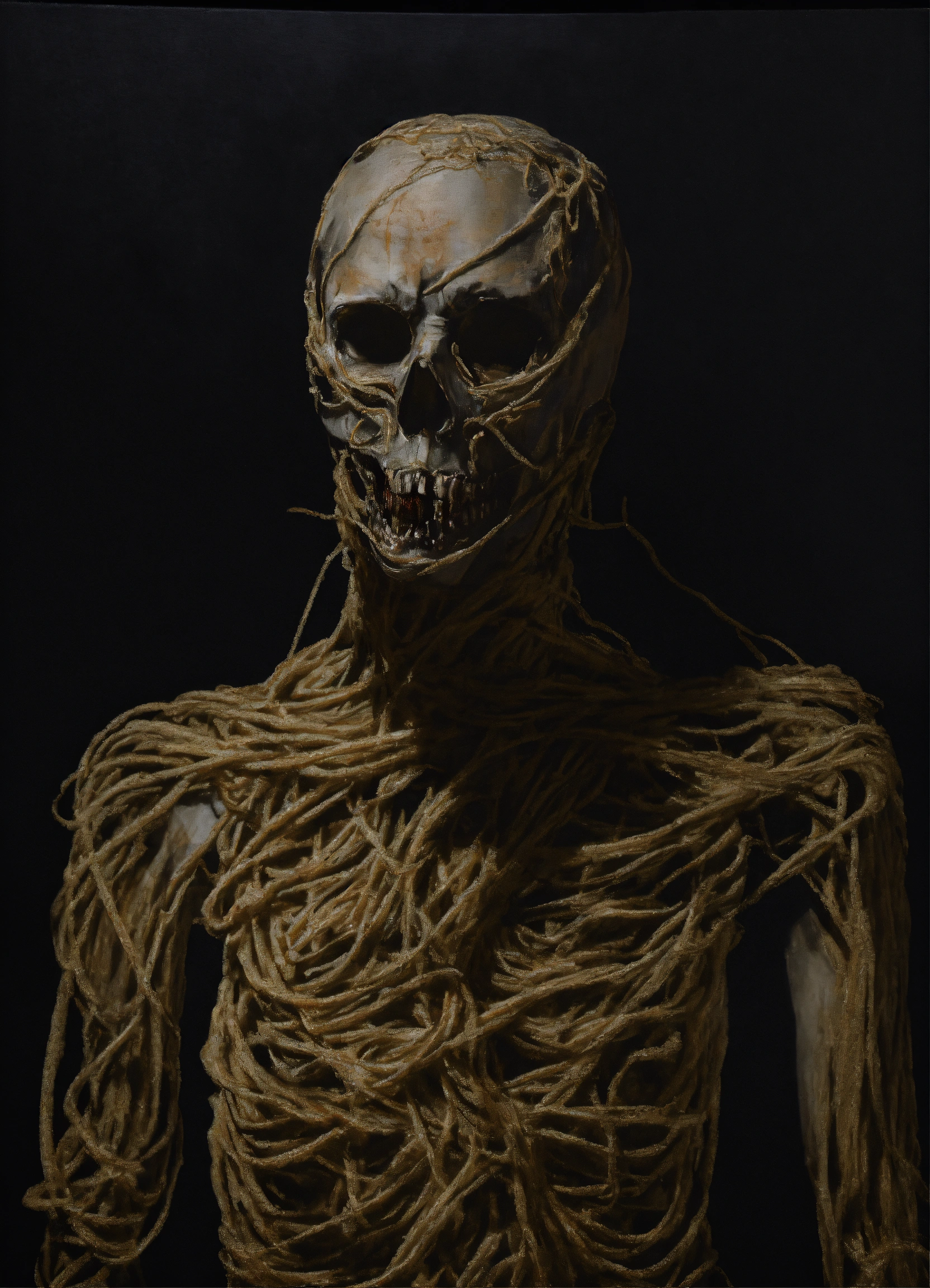 A nightmarishly unsettling, unrealistic picture of a horrifying entity on dark canvas, of knotted torsos.