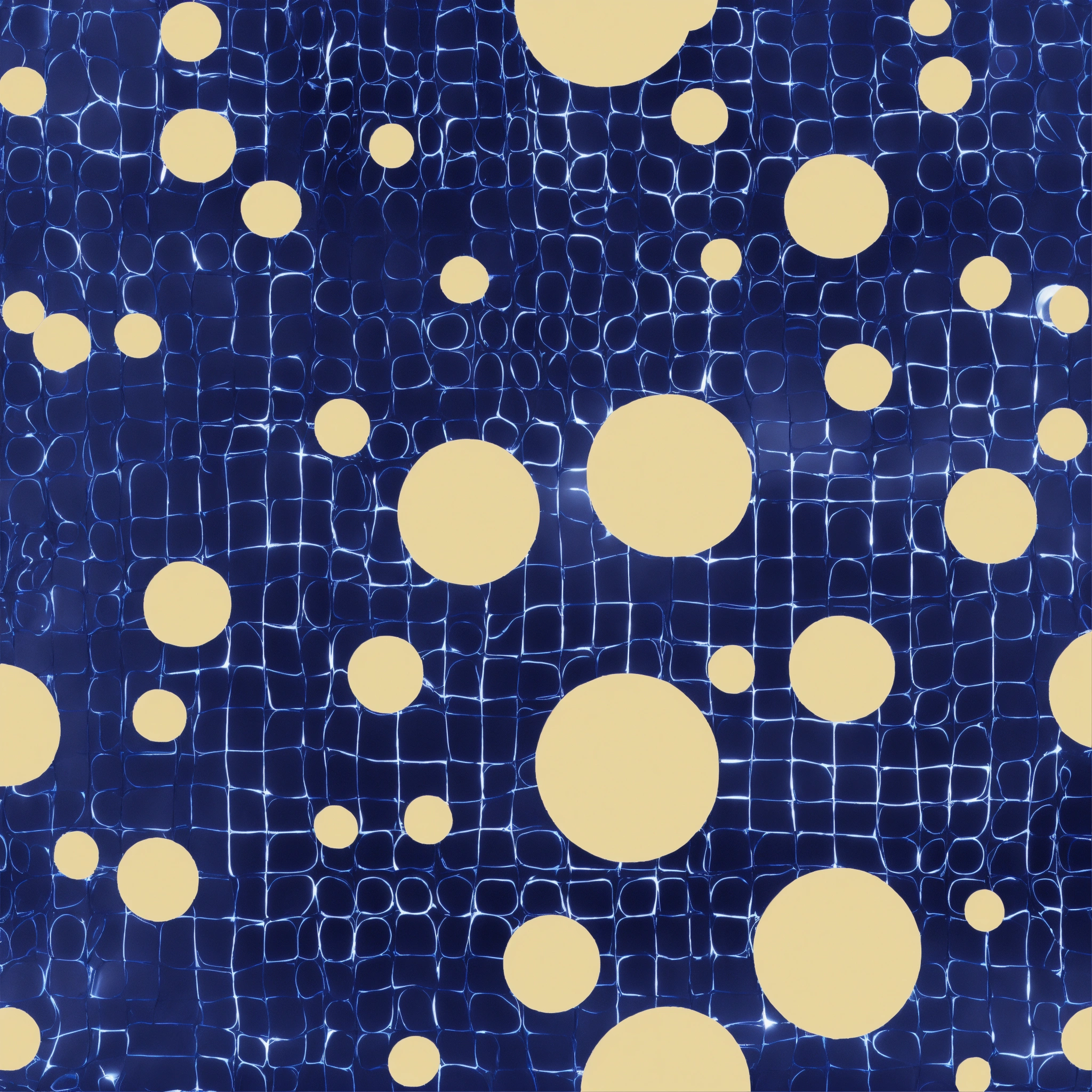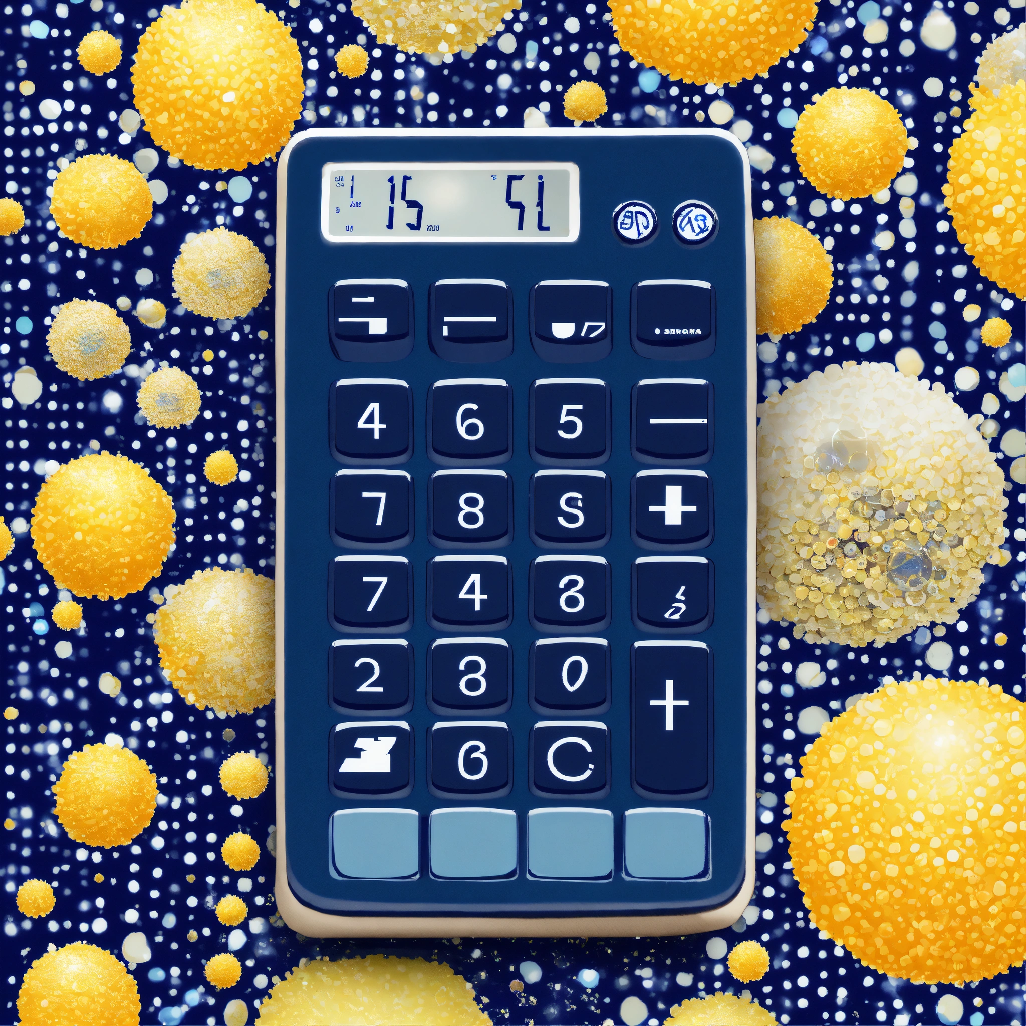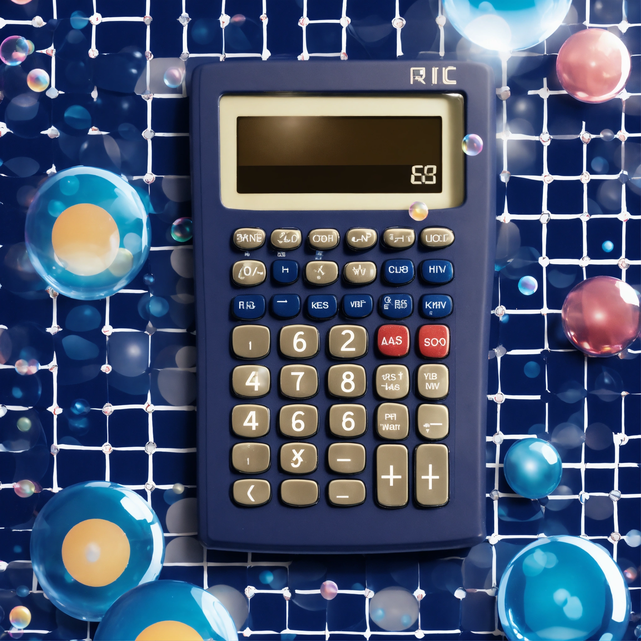 Create an image where an old calculator with keys transforms into soap bubbles on a background that resembles a school uniform fabric. predominant colors are navy blue and white, with a spotlight creating a shimmer on the bubbles.