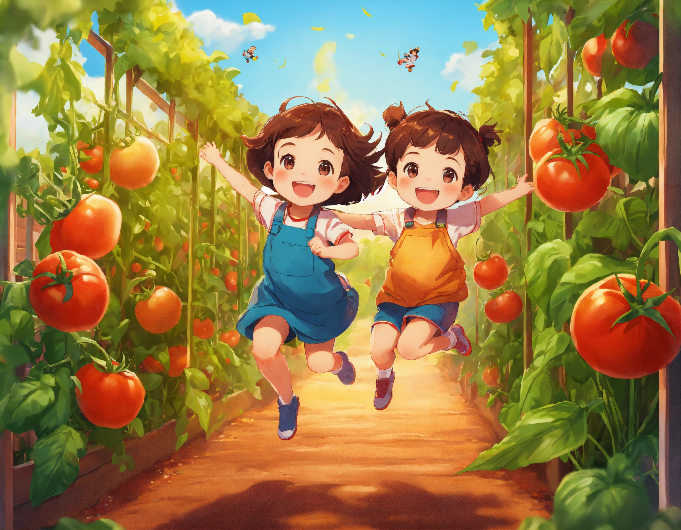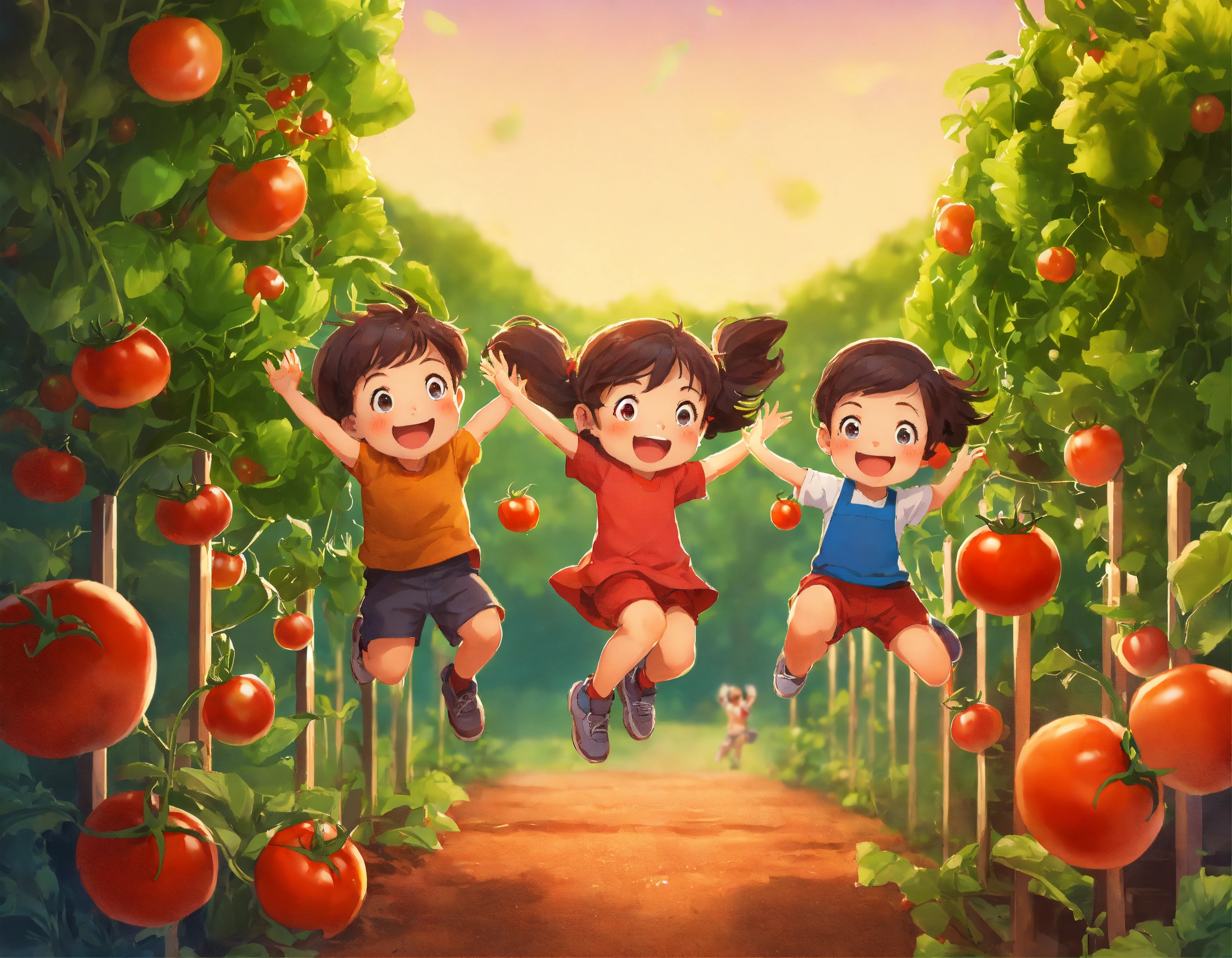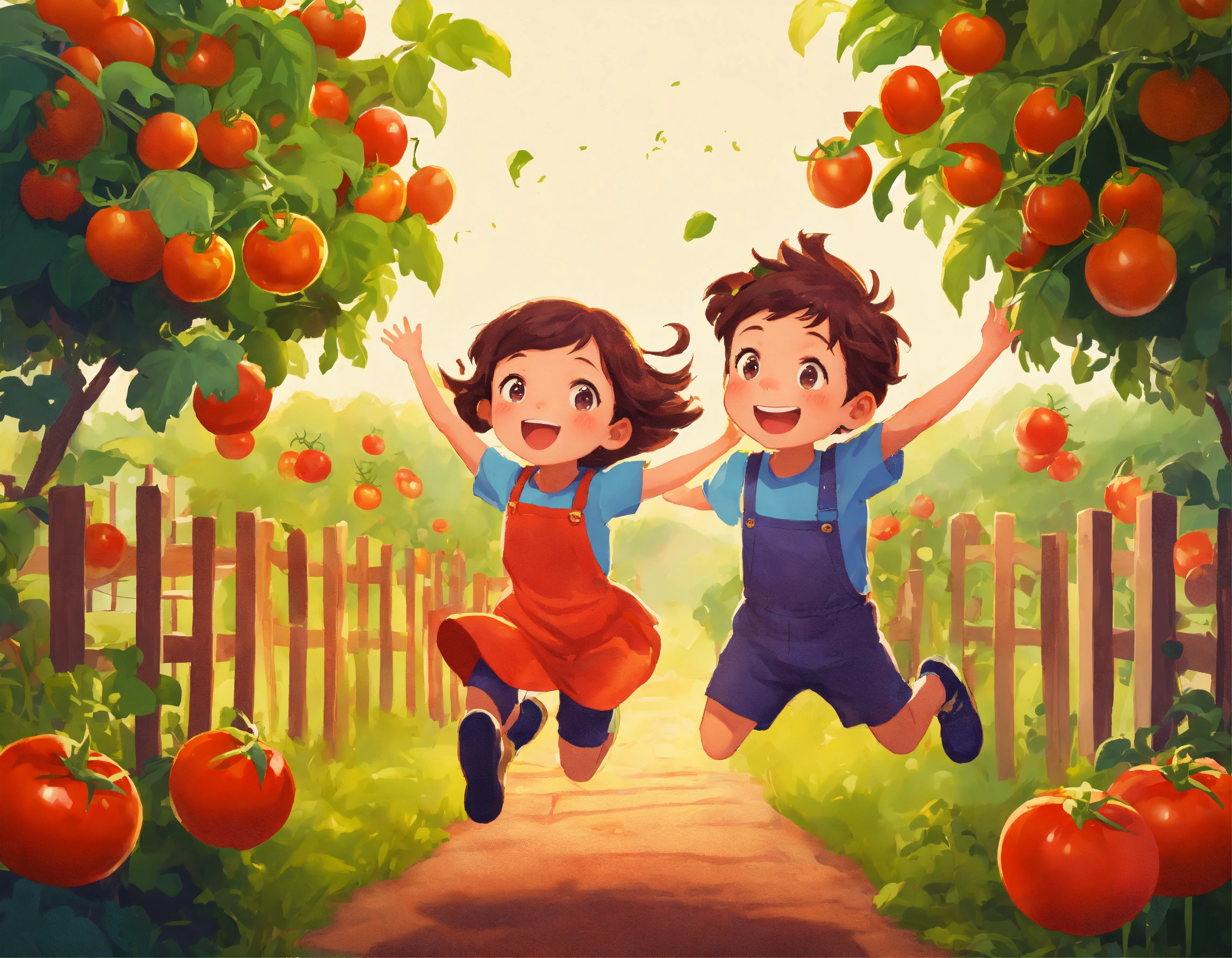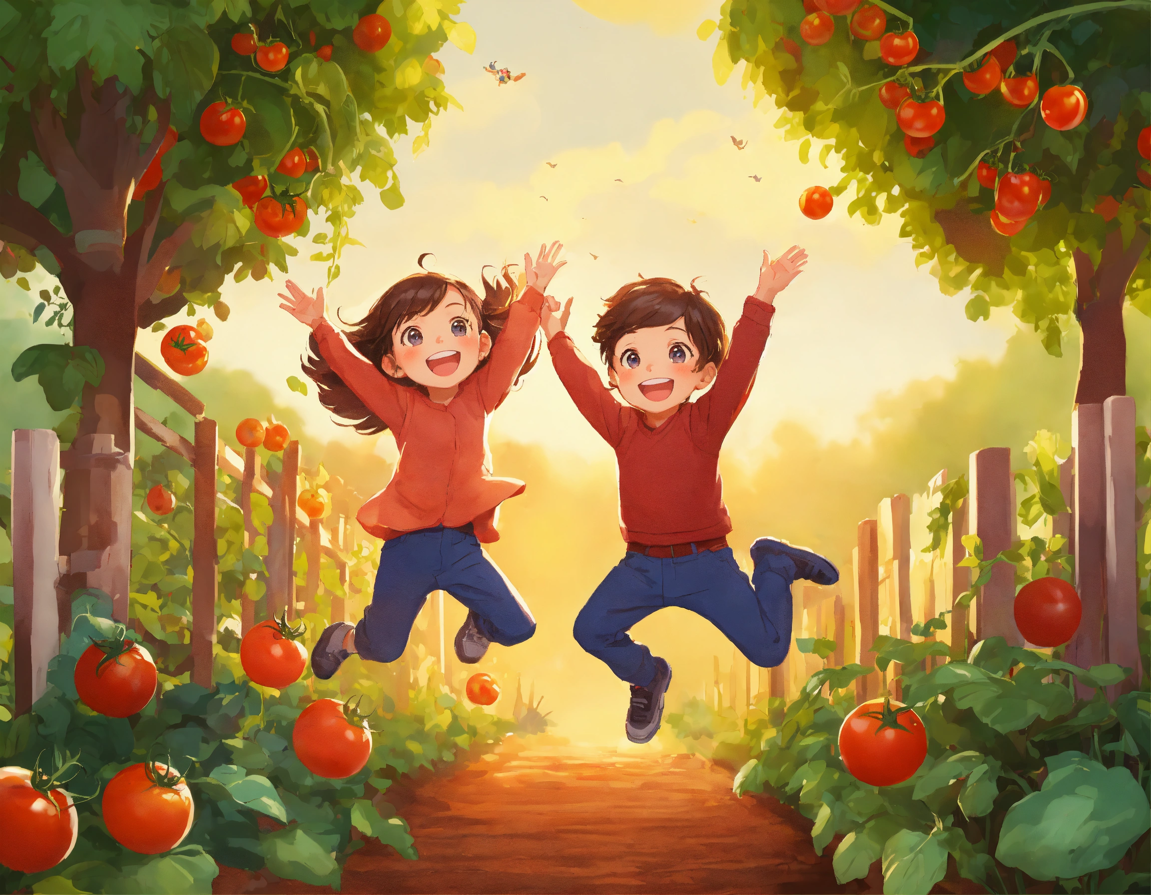 2 children, boy and girl, jumping happily, smiling, both hands up, tomato garden background, story book illustration, 8k