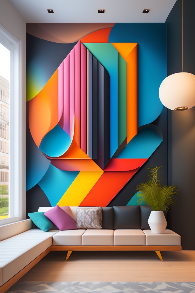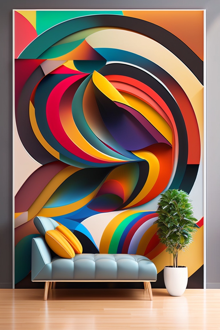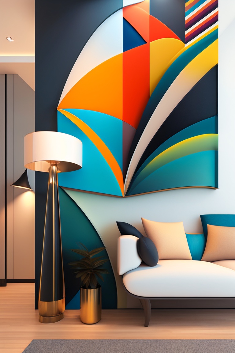 Abstract mural art: create an abstract illustration that can be used as a mural painting in a commercial or residential space. use a combination of colors and geometric shapes to create a visually interesting composition. your illustration should be designed to make a bold and eye-catching statement in the space it is used in. use abstraction to allow for a wide range of creative possibilities, from simple and minimalistic designs to complex and intricate patterns. your artwork should convey a sense of creativity, modernity, and sophistication, making it an ideal choice for businesses or homeowners looking to create a unique and memorable brand image or add a touch of elegance and style to their living space. --v 4