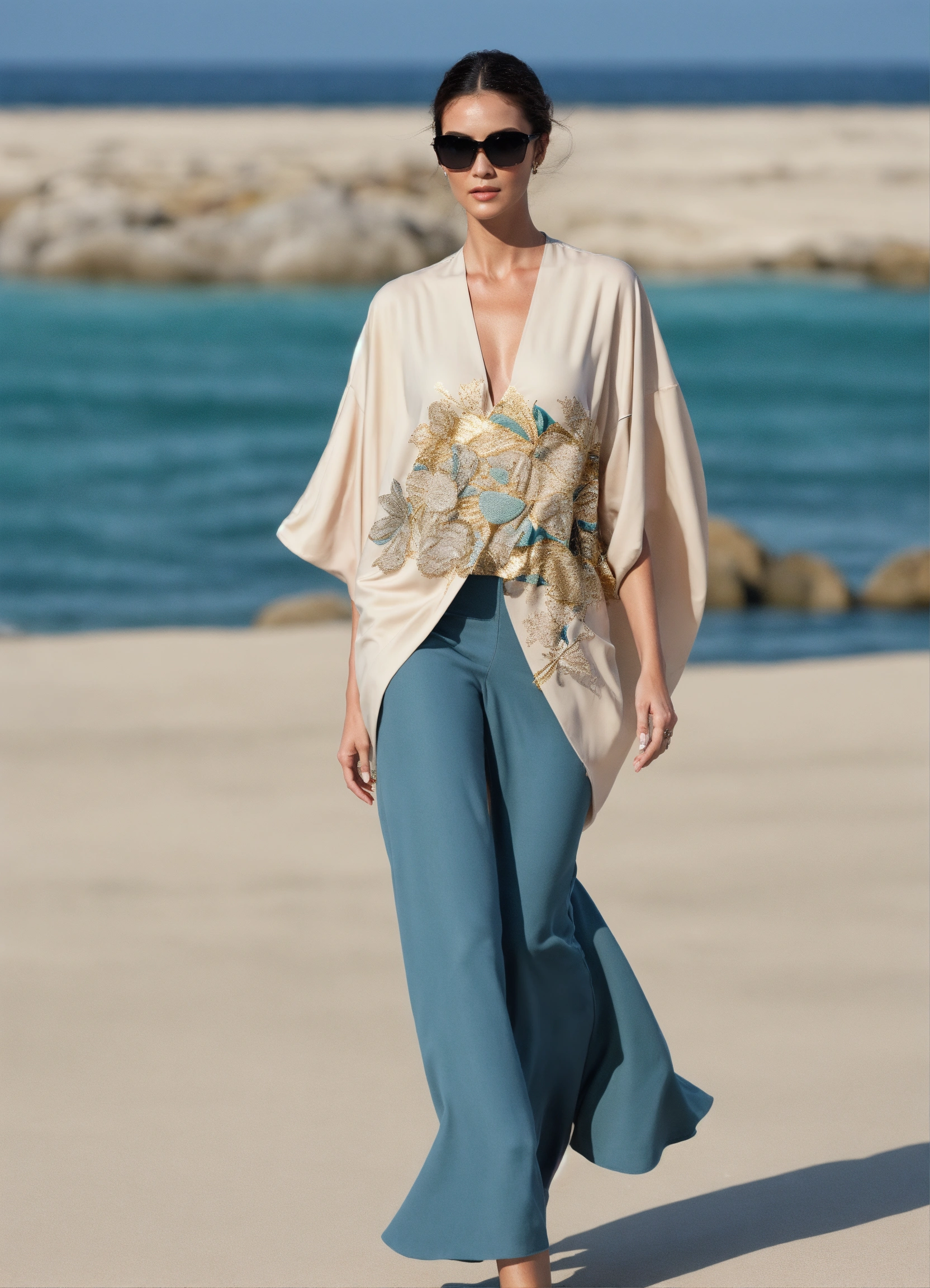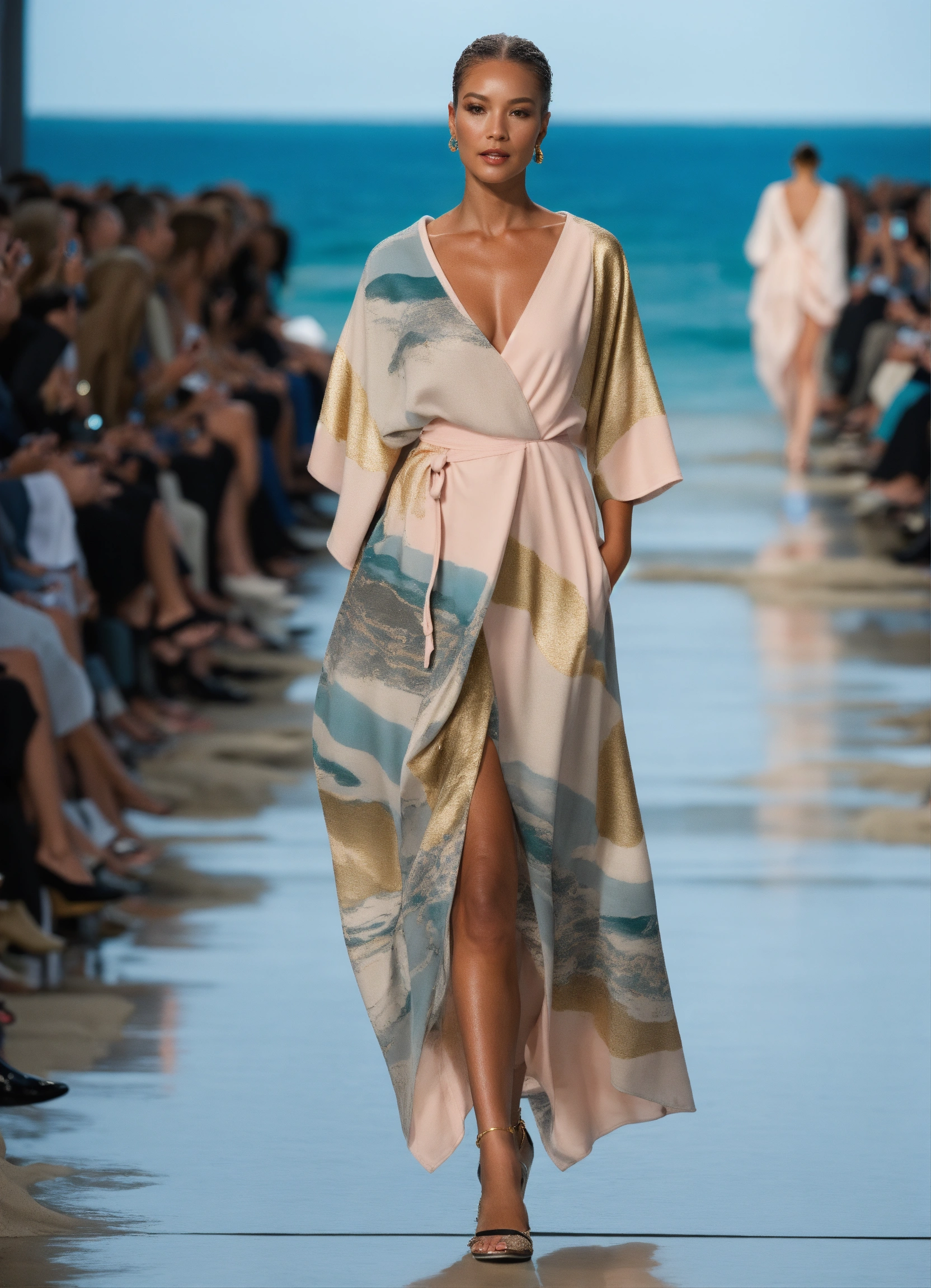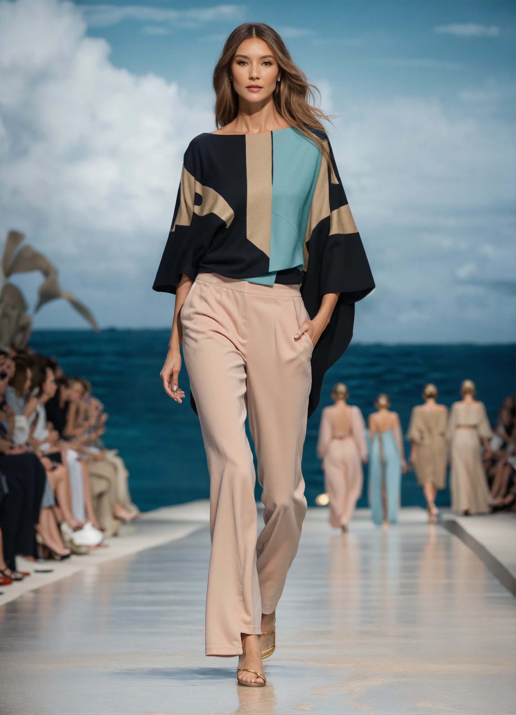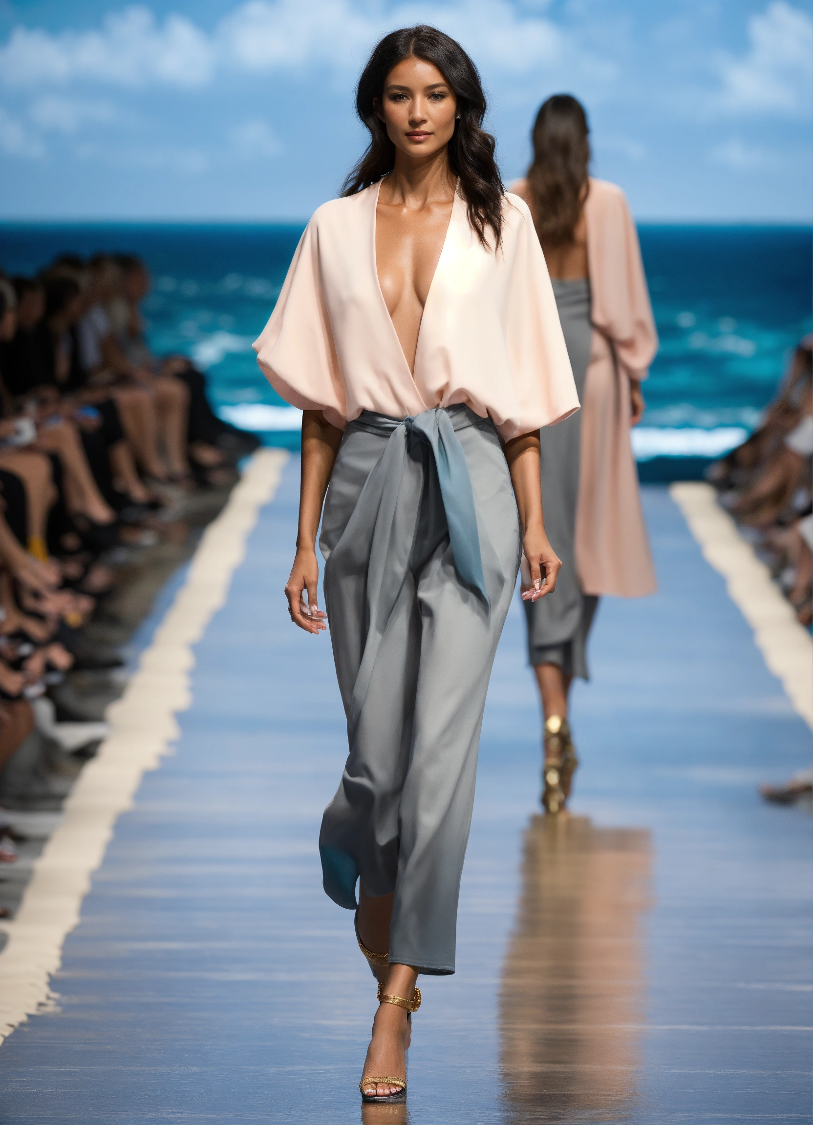 3d realistic photo of female oceanographer walking runway during marine fashion week wearing dolman sleeve donna karan oceanographers fashion in black, white, blush, grey, beige, stone, gold, denim, blue, teal walking a runway on a deep ocean shore
