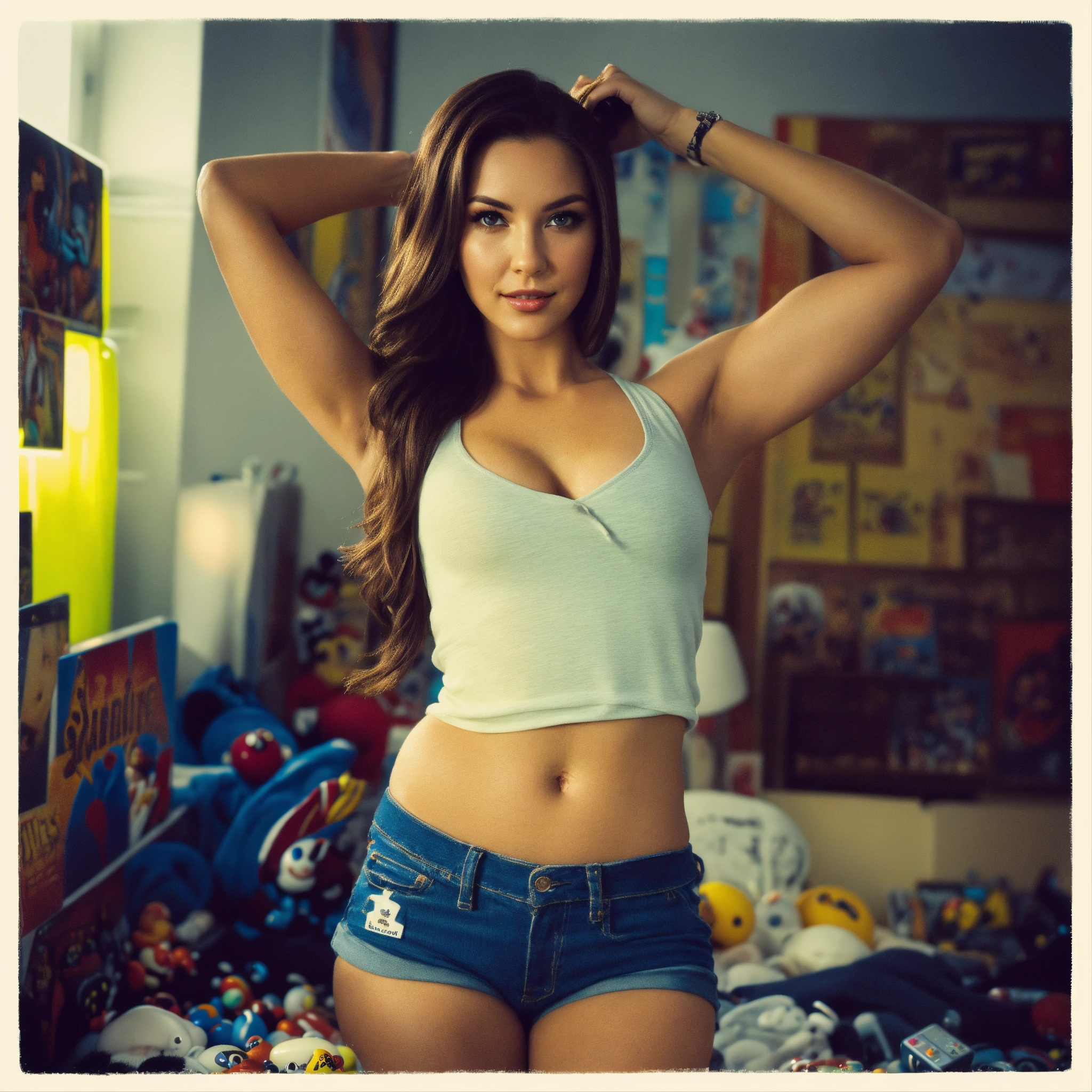 Photo, real, pretty 23-year-old brunette woman, young boy's room, video games, nerdy toys, action figures, posters, wide hips, solo, bombshell, eye contact, looking at viewer, smirk, raised eyebrow, competitive, challenging, narrow waist, exposed, glamour shot, low angle shot, low angle pov, looking down at viewer, looking down at camera