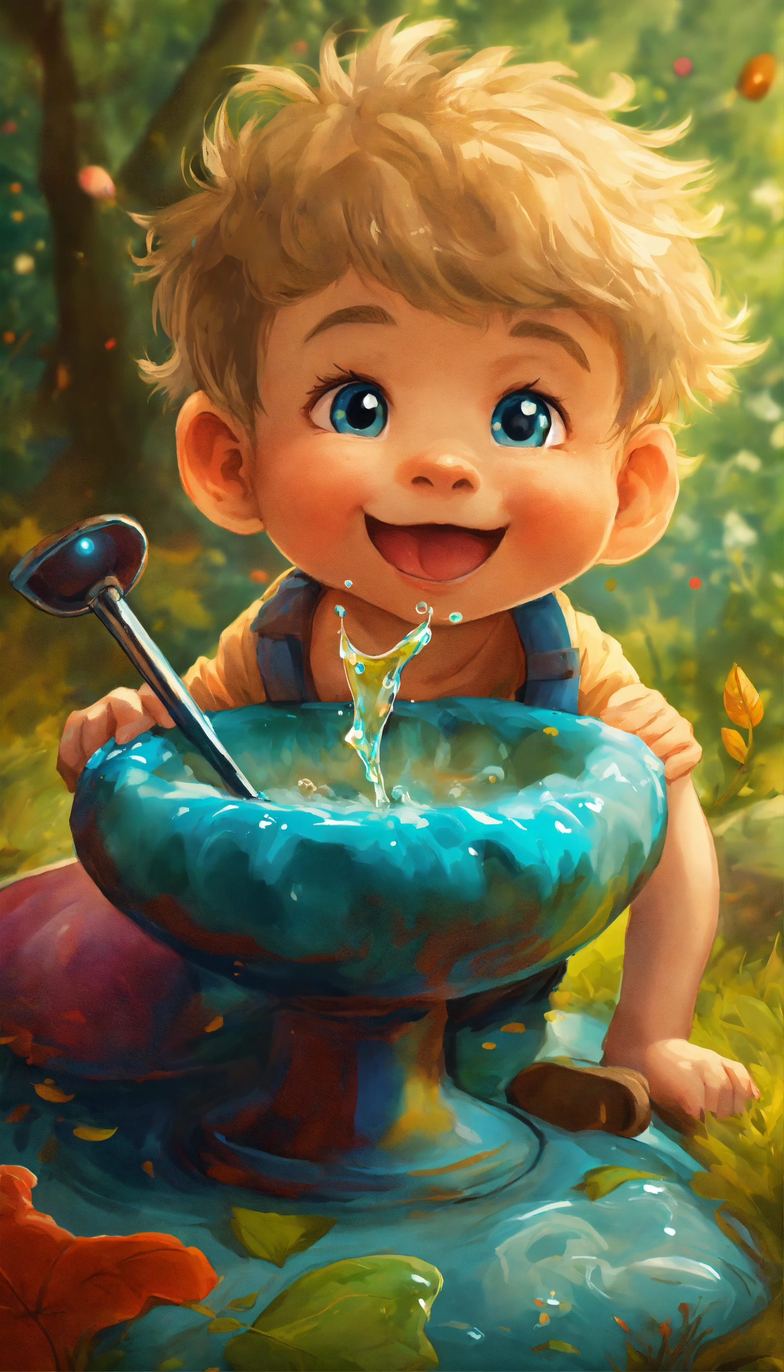 Cierre del grifo genera una imagen que ilustre a un niño cerrando el grifo mientras se cepilla los dientes, 8k, estilo cuento para niños, colores vibrantes
