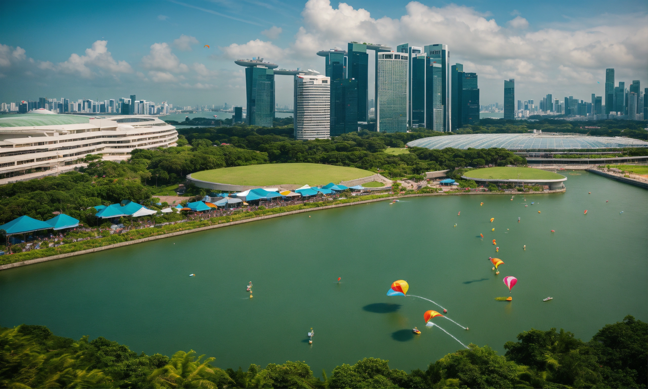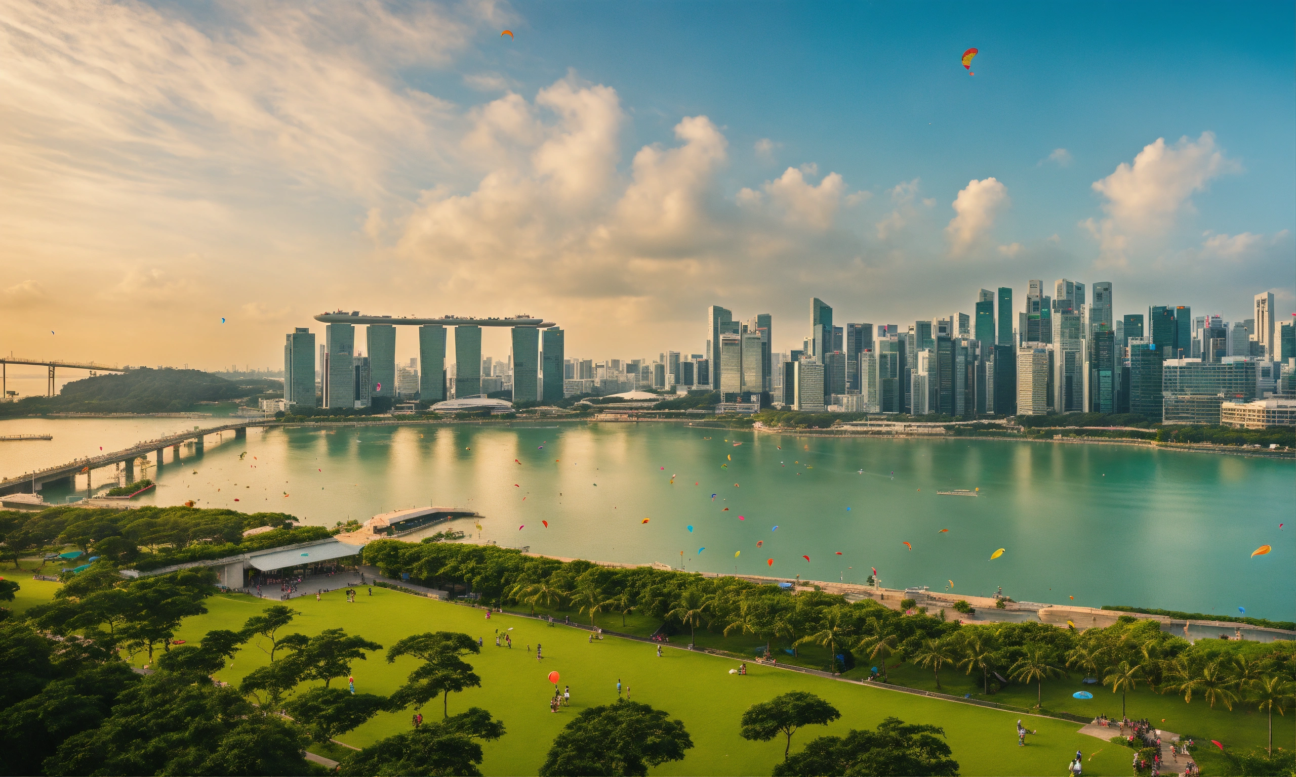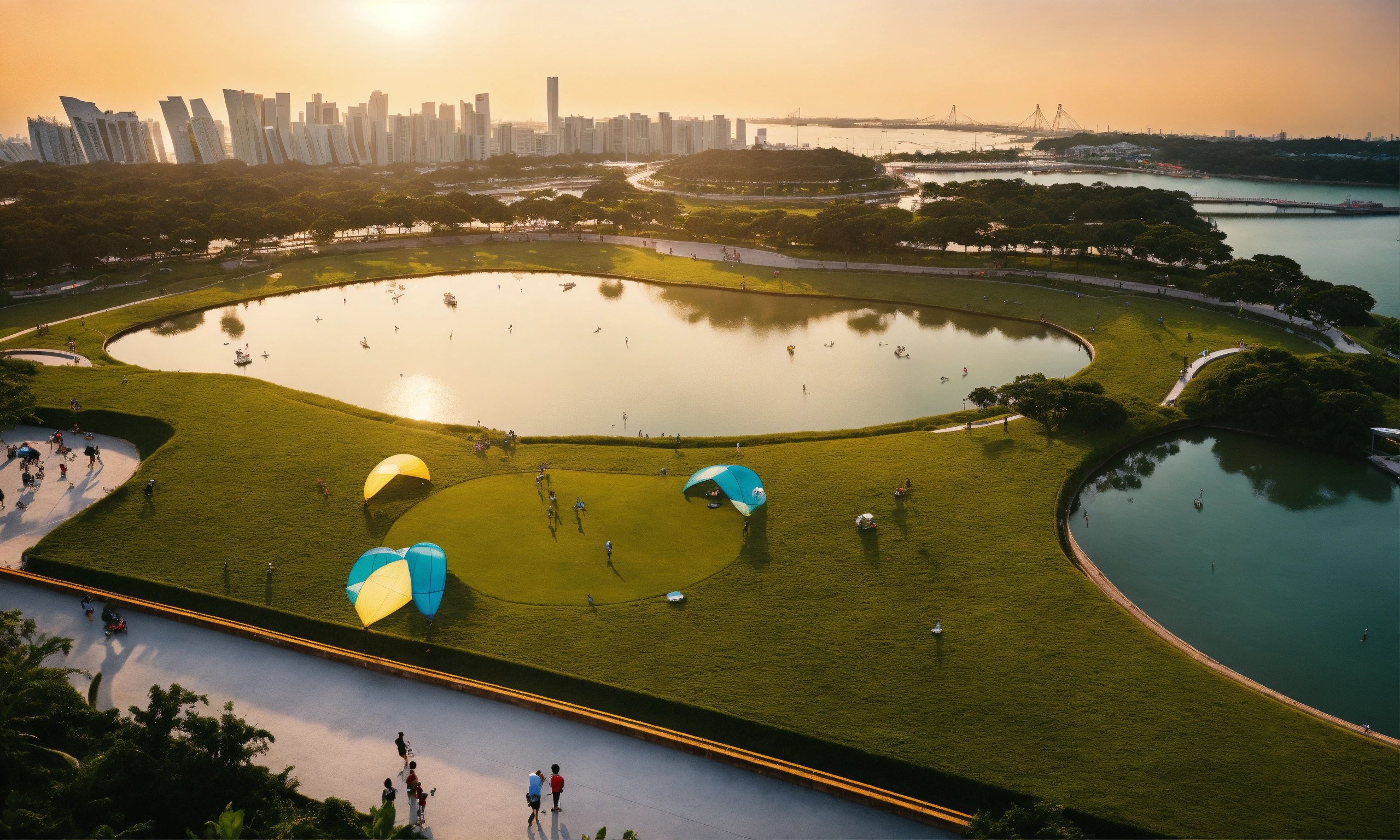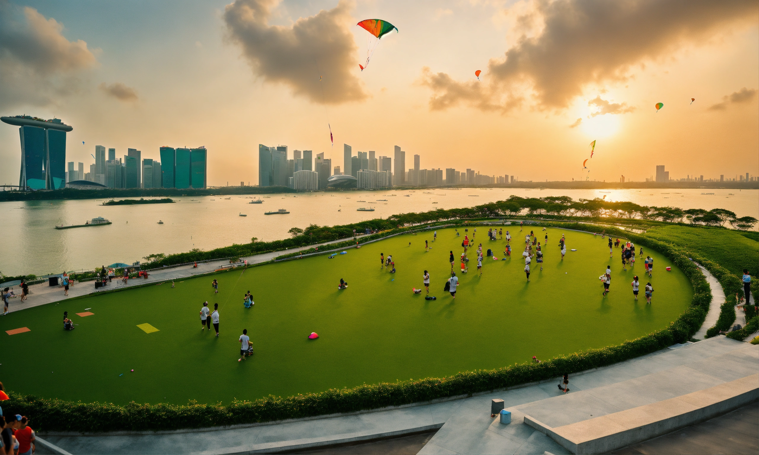 Ultra-realistic photo, cinematic quality, afternoon setting, aerial view capturing the activity on the vast green rooftop singapore's marina barrage the barrage is packed with people with families flying kites, joggers taking in the view, and tourists snapping photos; modern urban attire, expressions of awe and relaxation. under the bright afternoon sun, the barrage gleams, showcasing its marvel of modern engineering. in the backdrop, the lush east coast park and shimmering waters of the bay contrast beautifully with the green rooftop. themes modern nostalgia, juxtaposition of nature, sustainable infrastructure, and recreation, reflections on the water's surface, 70mm camera to capture vast expanse, portra 400 film for rich contrasts and colors, slight film grain for added texture