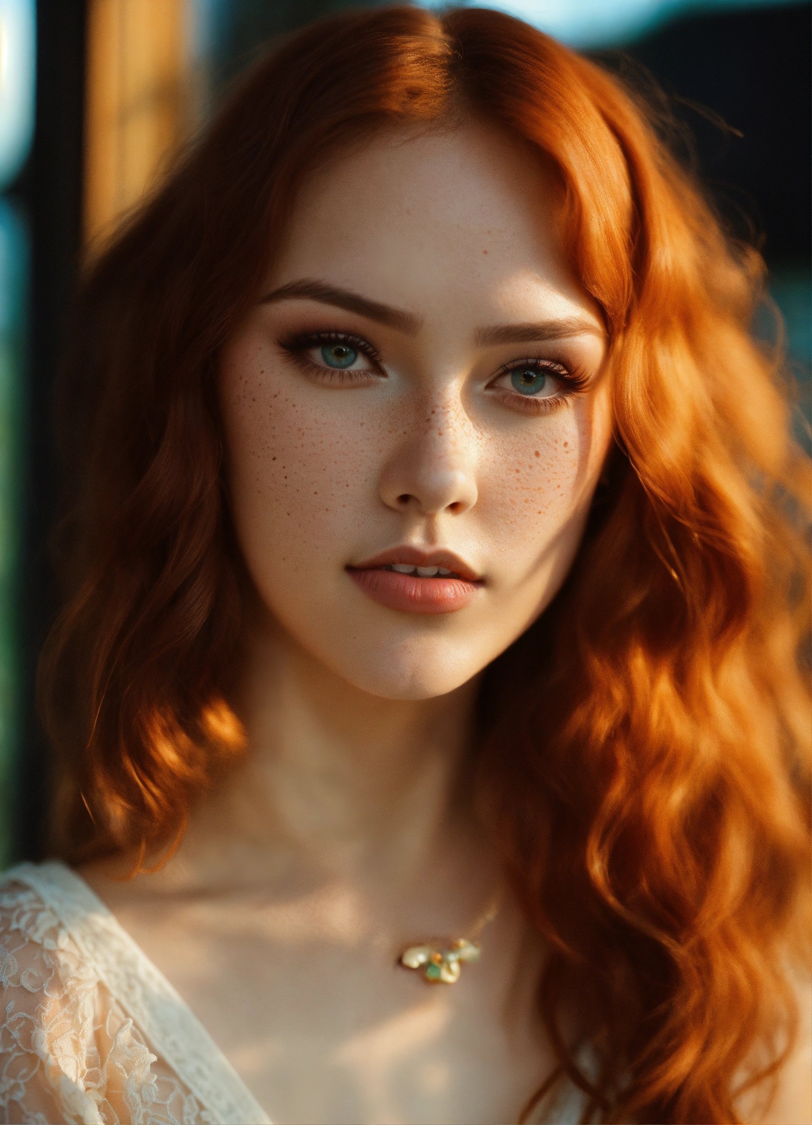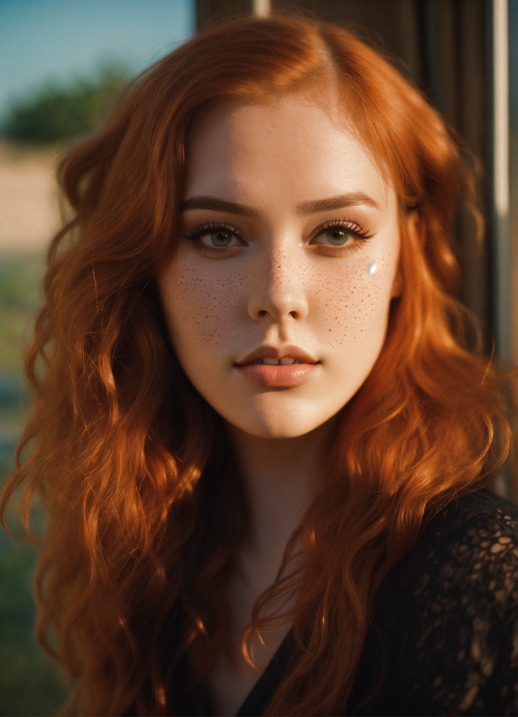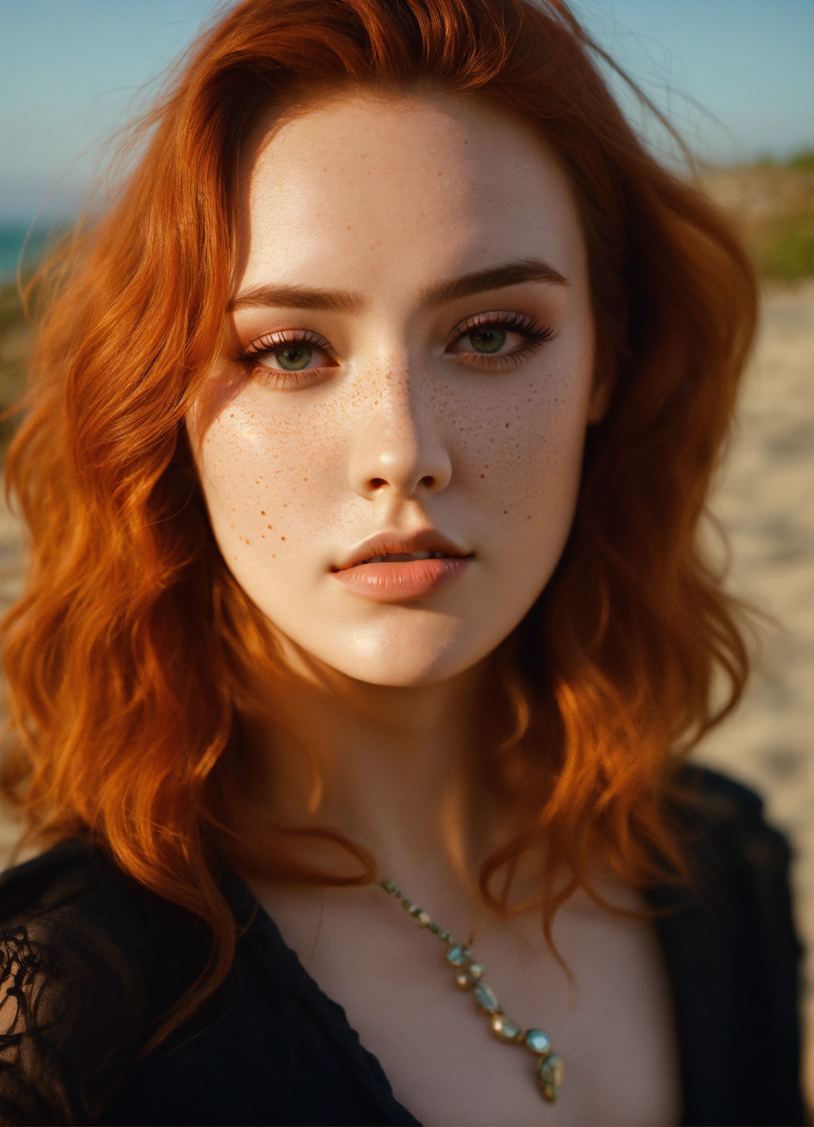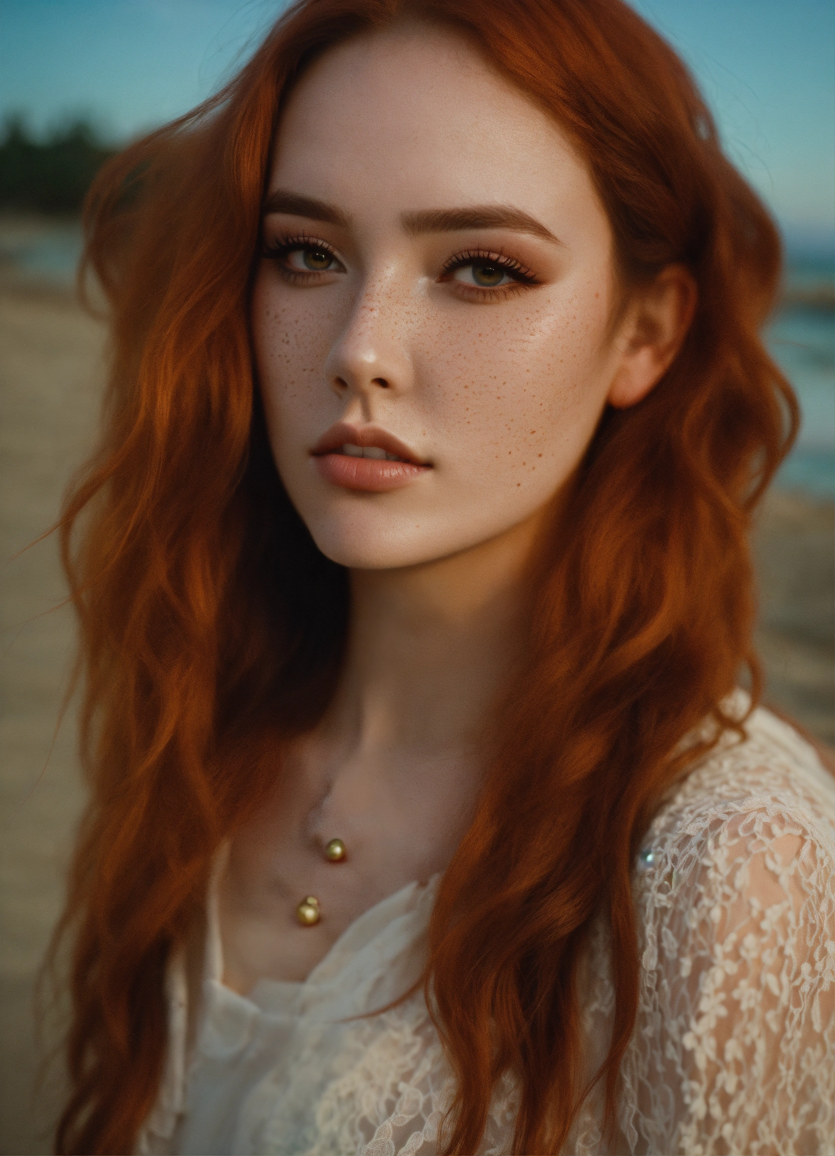 Kodachrome model=<-amber(maika-monroe heard><wearing-formal-makeup><brunette-effy-stonem><wearing-formal-makeup> wavy redhair, head and shoulders portrait, pastel-goth, beach sunrise, bay windows, morning sunrays, 70mm film, kodachrome, high-depth cinematic symmetry central point of composition soft realistic skin, freckles 70mm-film pastel-goth aesthetic, cottagecore socialite oval-shaped face clear complexion red wavy hair almond-shaped eyes bright-amber-eyes long dark eyelashes straight slender nose round slightly pointed chin graceful feminine chin high cheekbones very plump lips