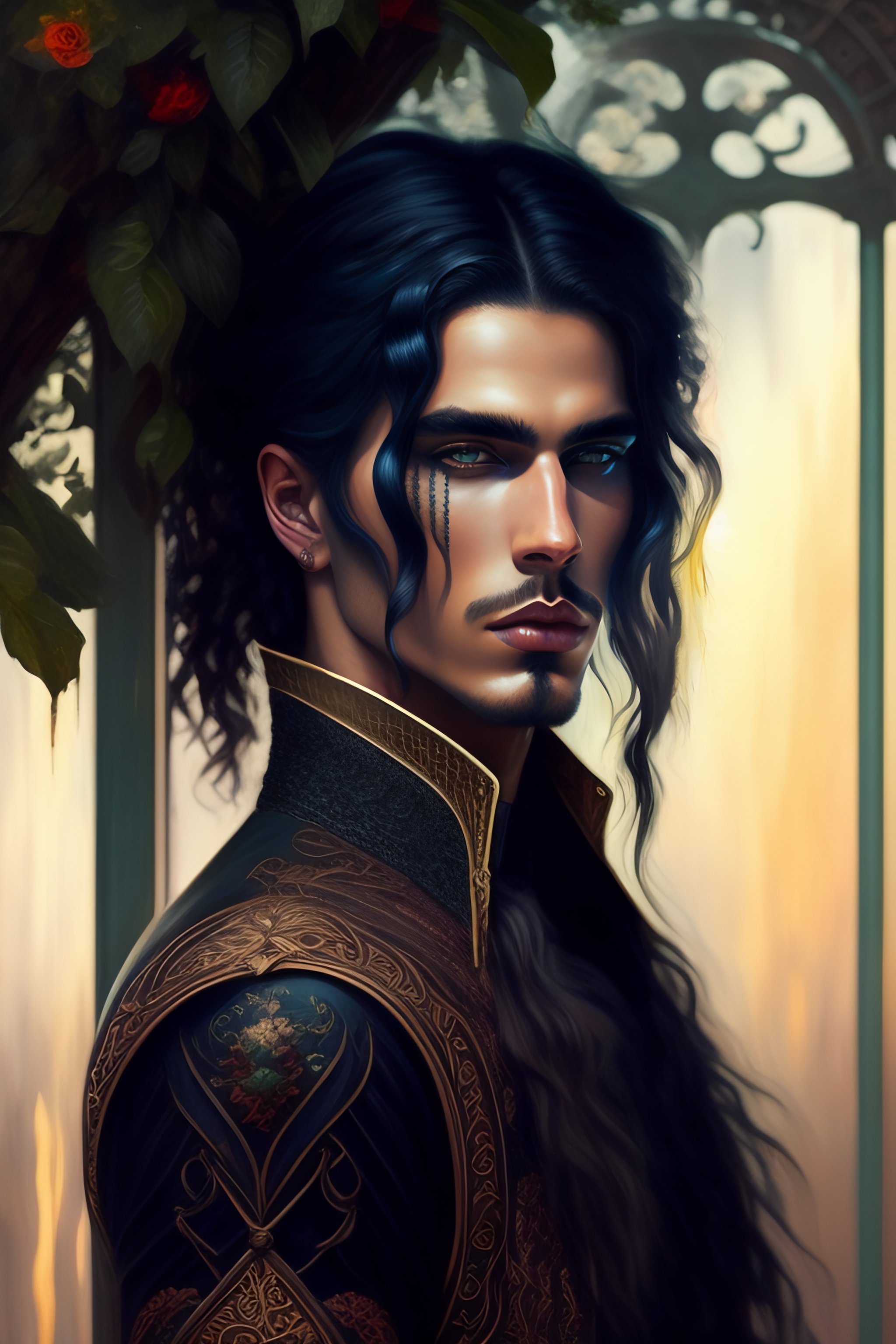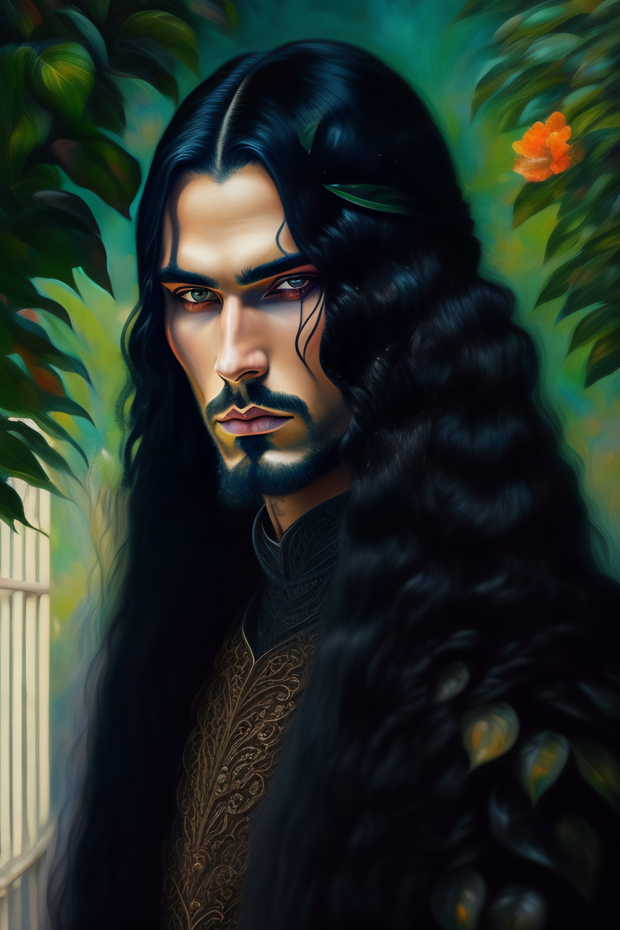 Painting of a man man man greenhouse warrior, intricate, wood, long black hair, beautiful gothic makeup, delicate, surreal, beautiful, fantasy, painting character, thick impasto