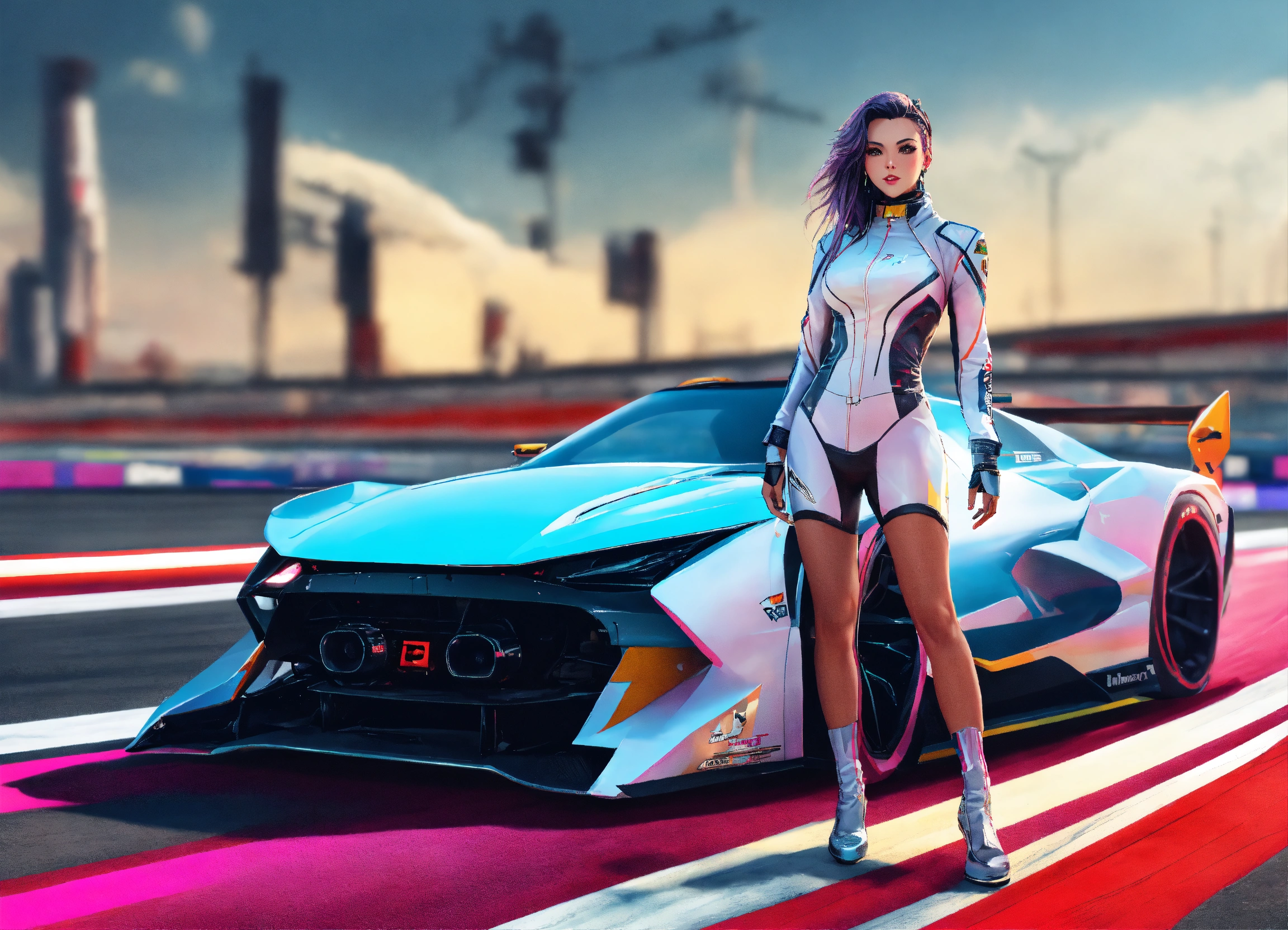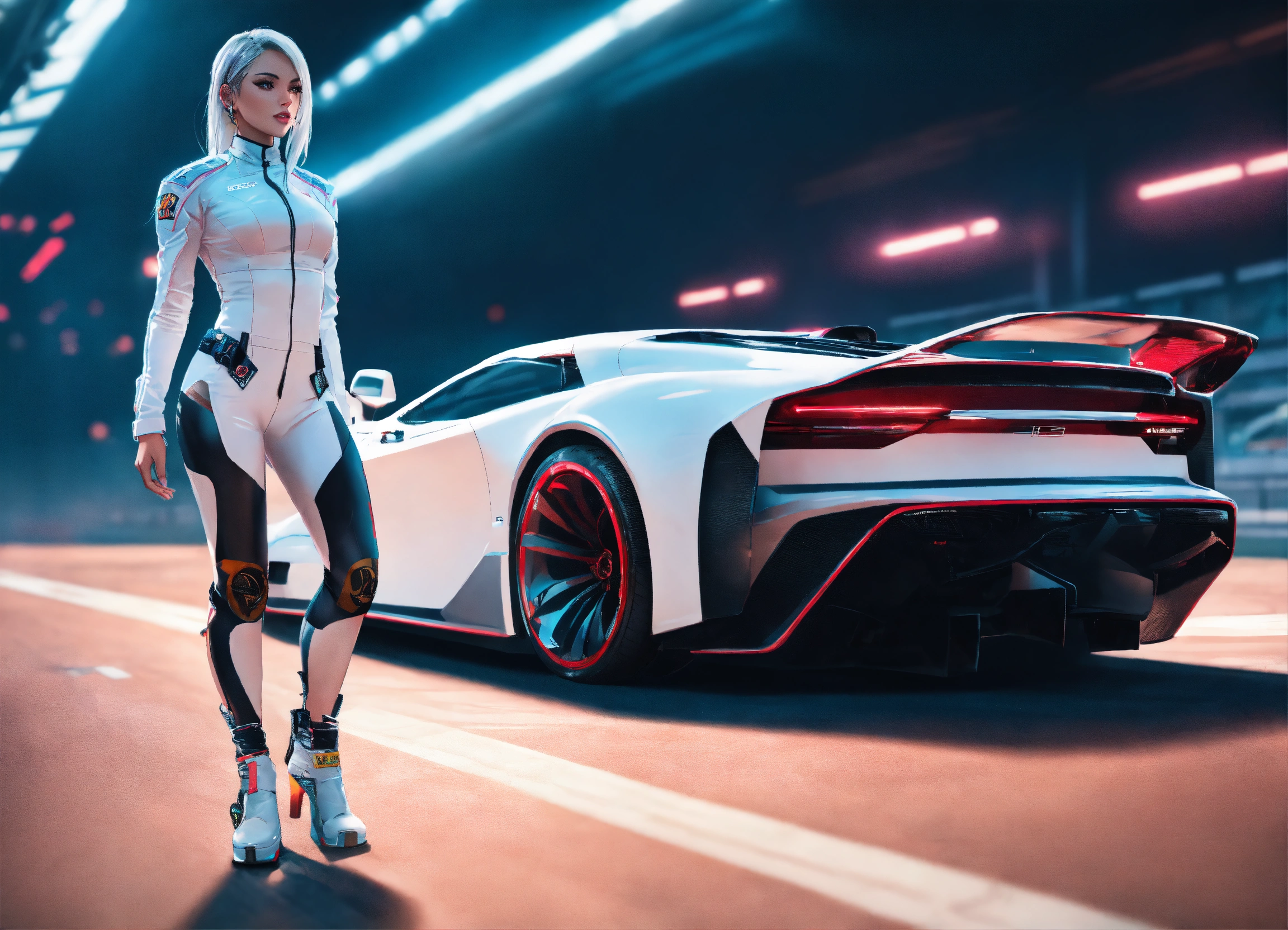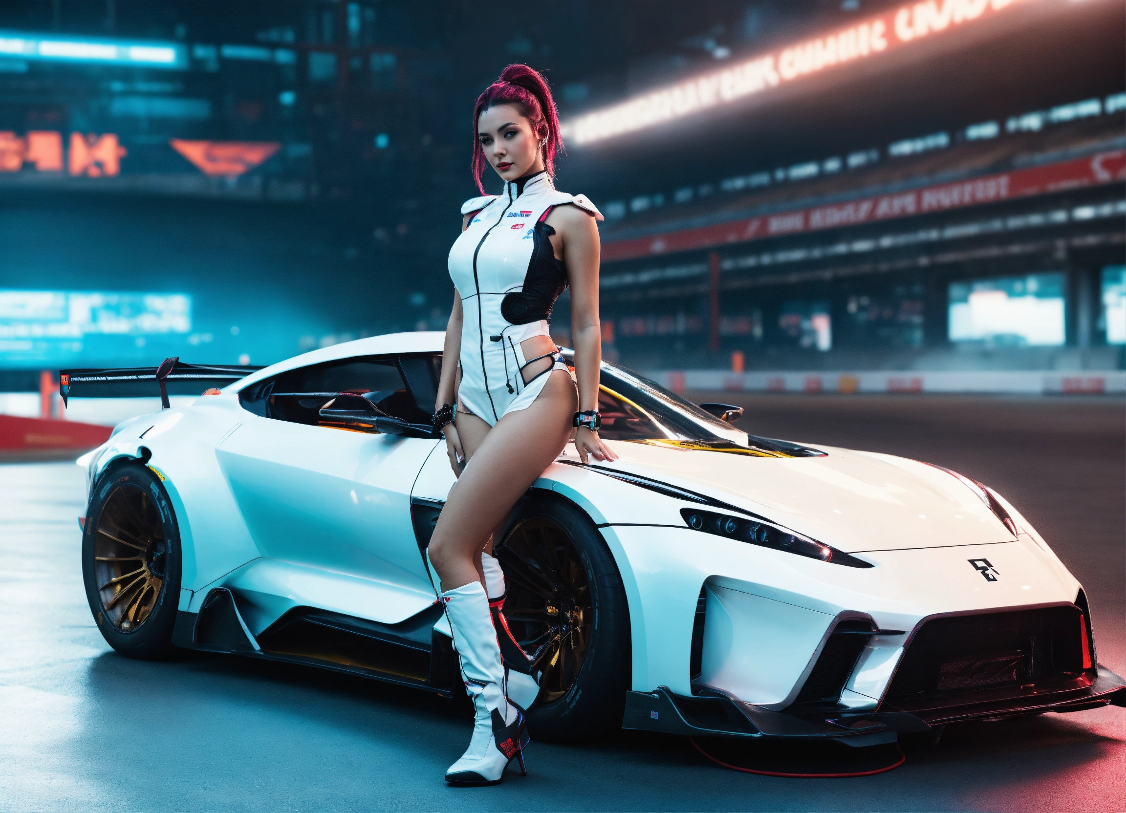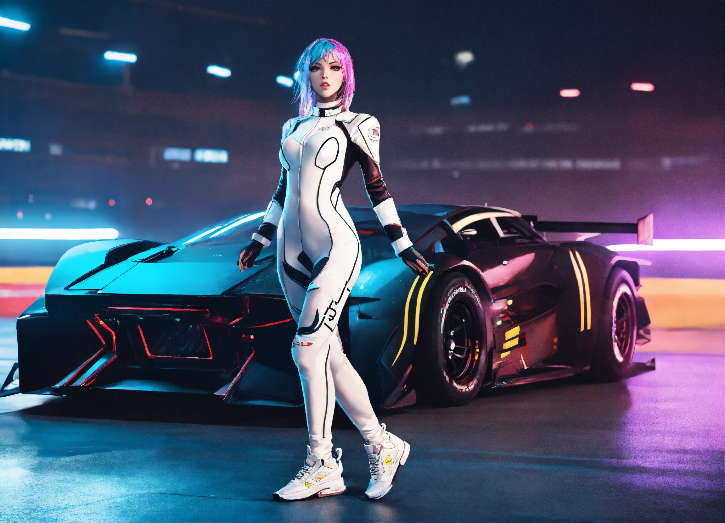 Full body photo, cyberpunk dream girl, futuristic race car in the background, at the racetrack, white