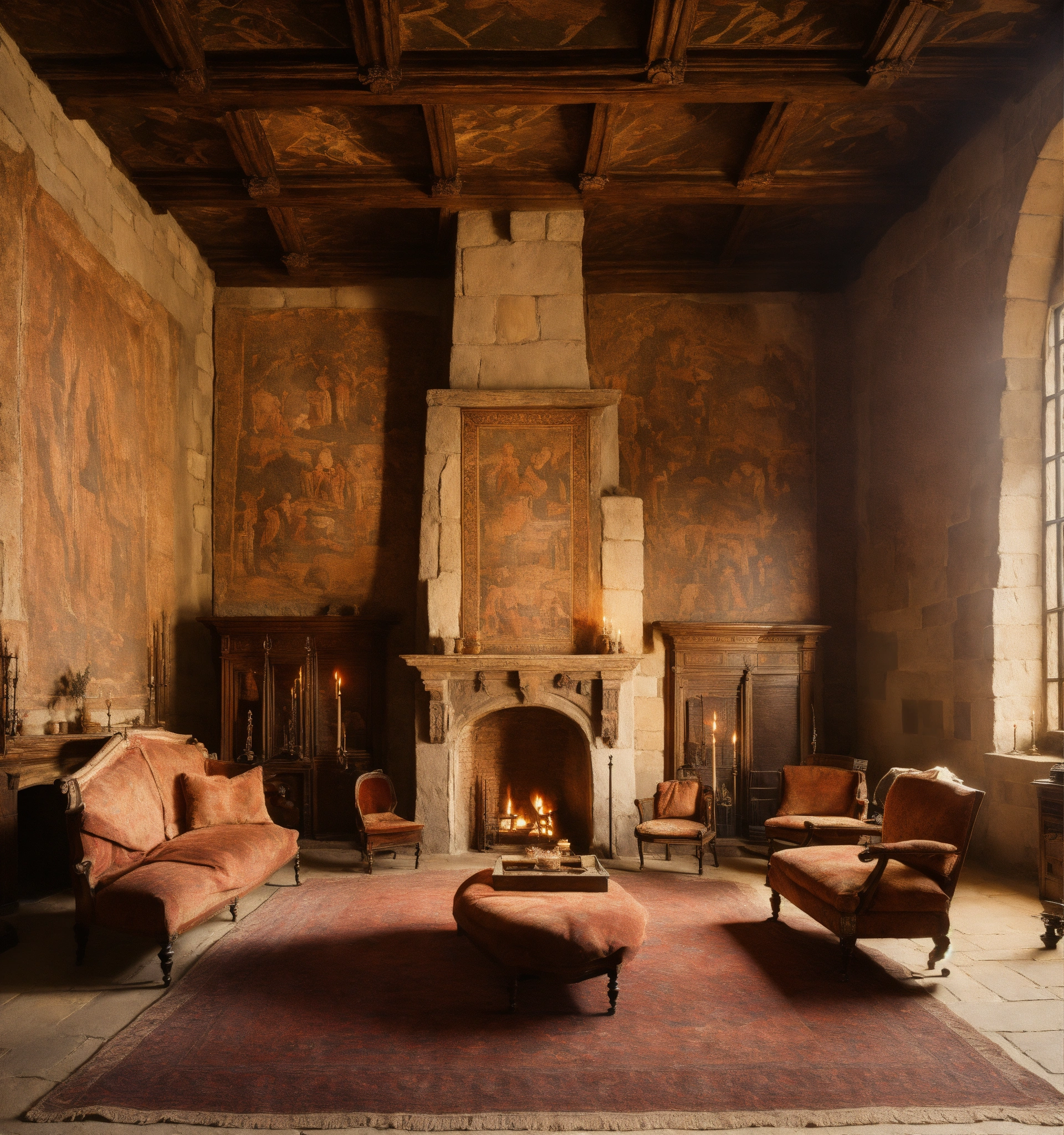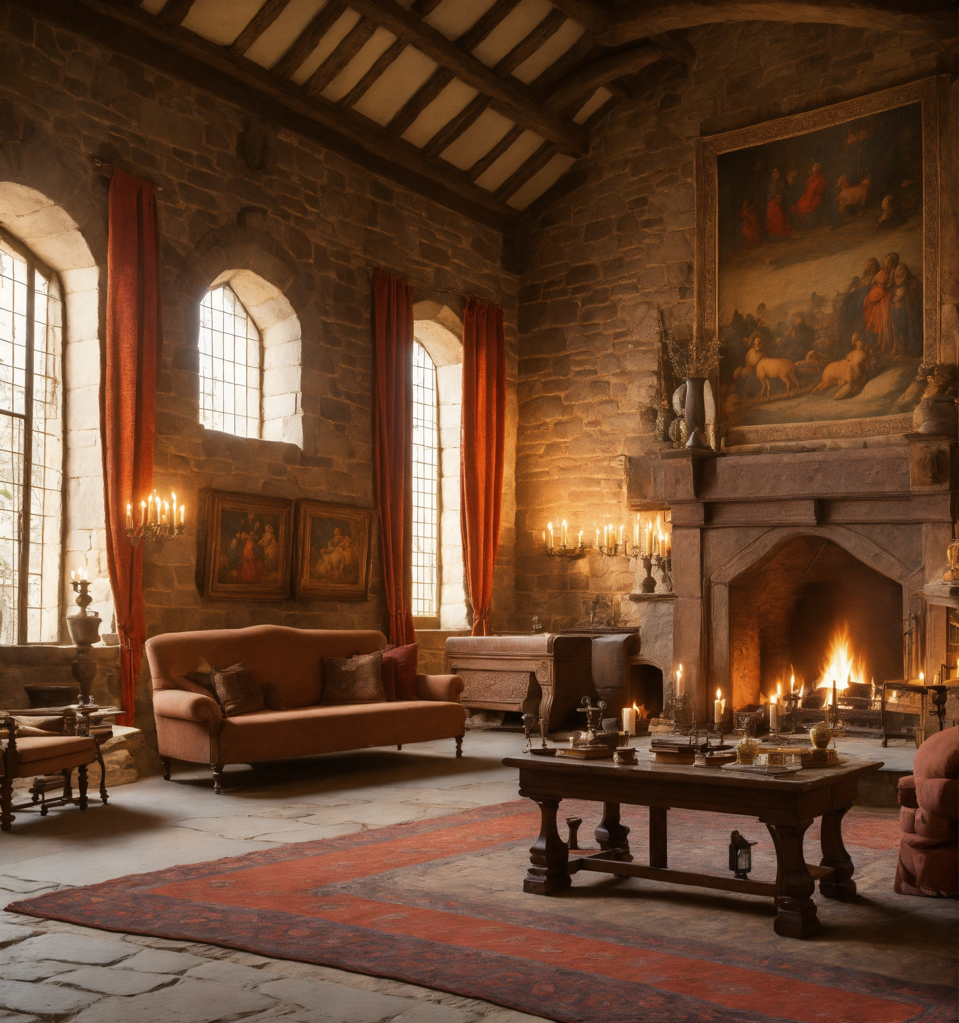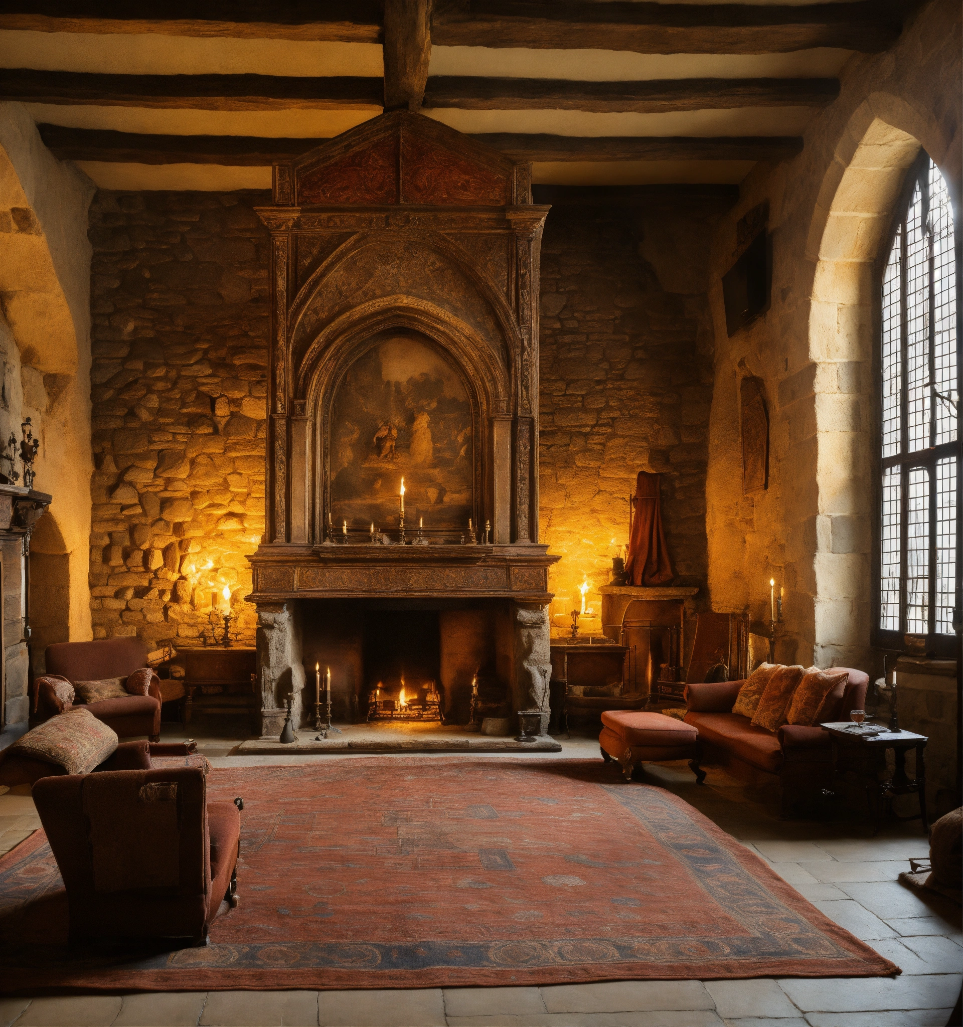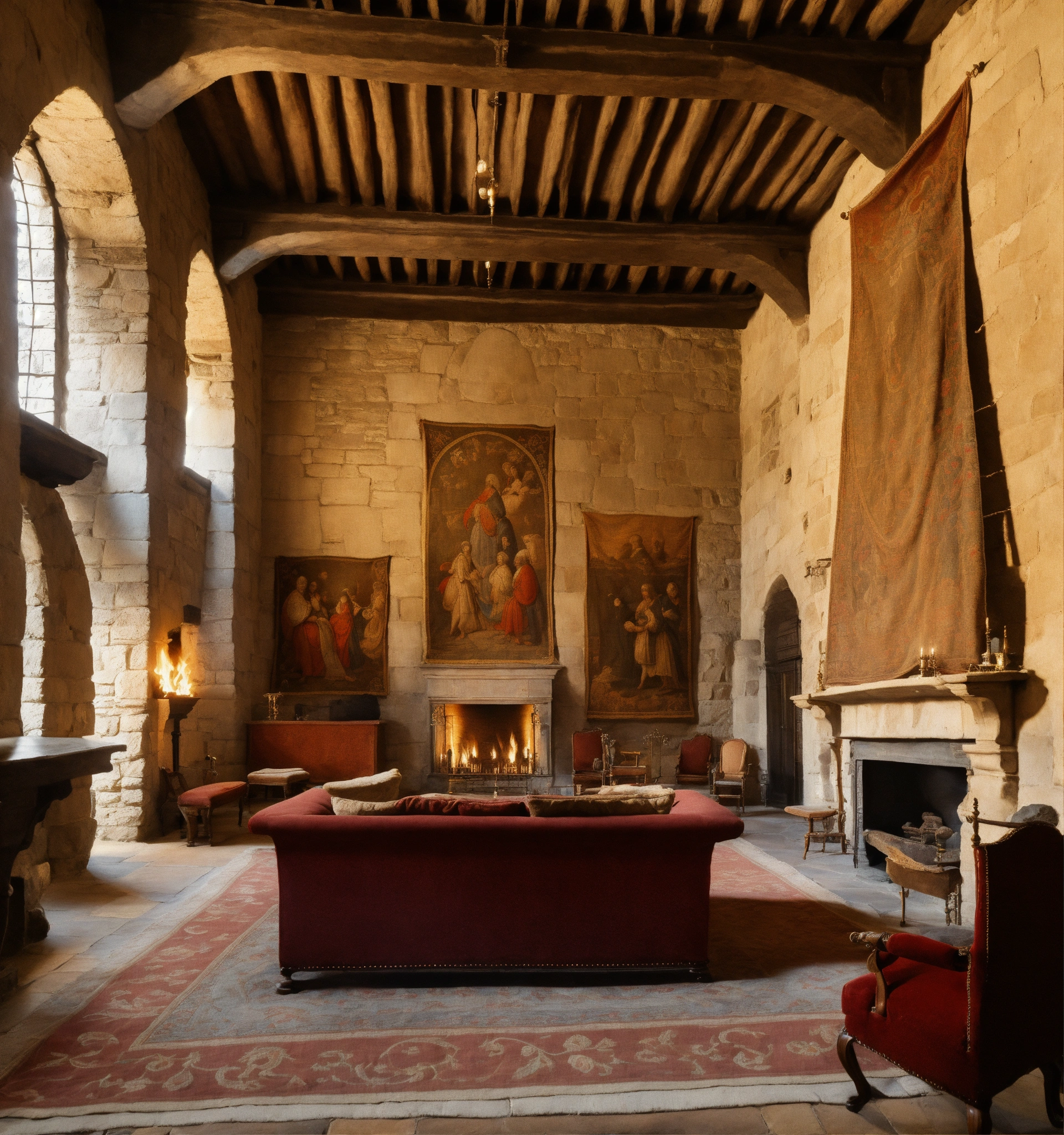 A large medieval castle room, stone walls, with period furniture and large fireplace and a large tapestry on the wall, leonardo da vinci style, 8k