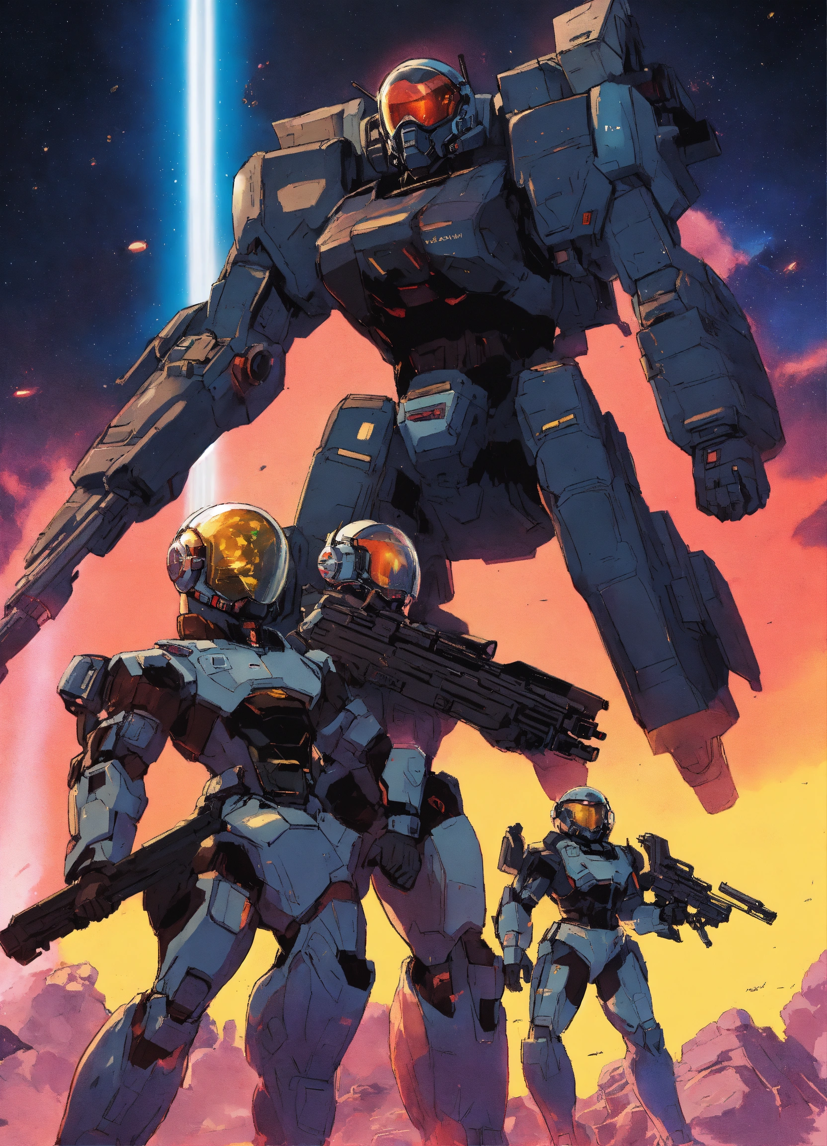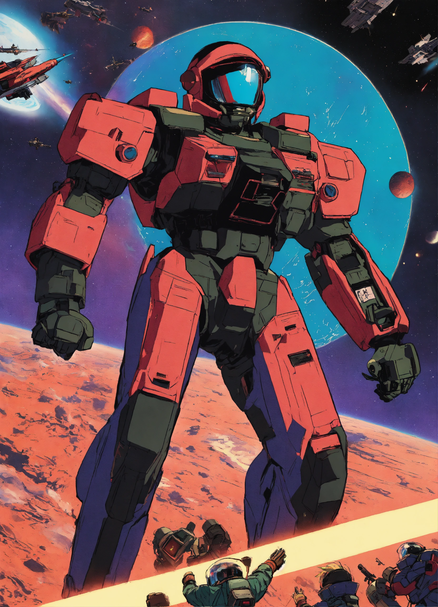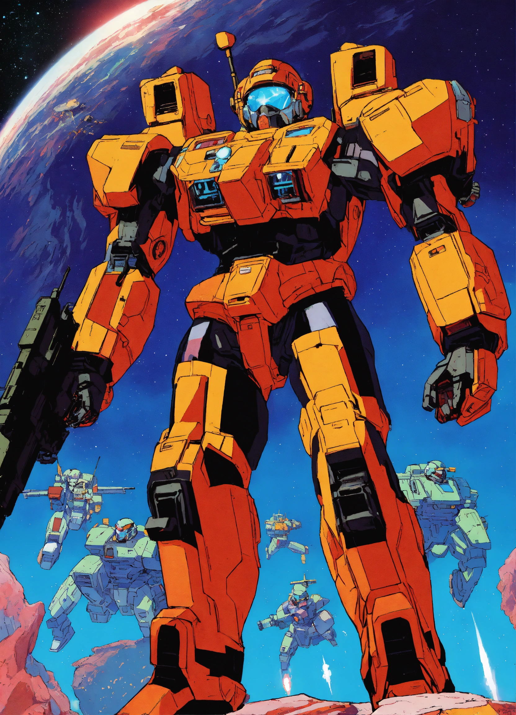 80s anime black character mecha pilots fighting in space drama war comic cover