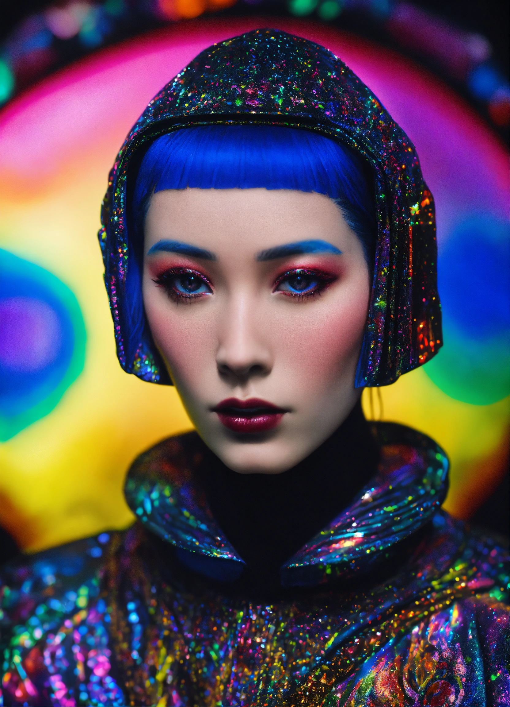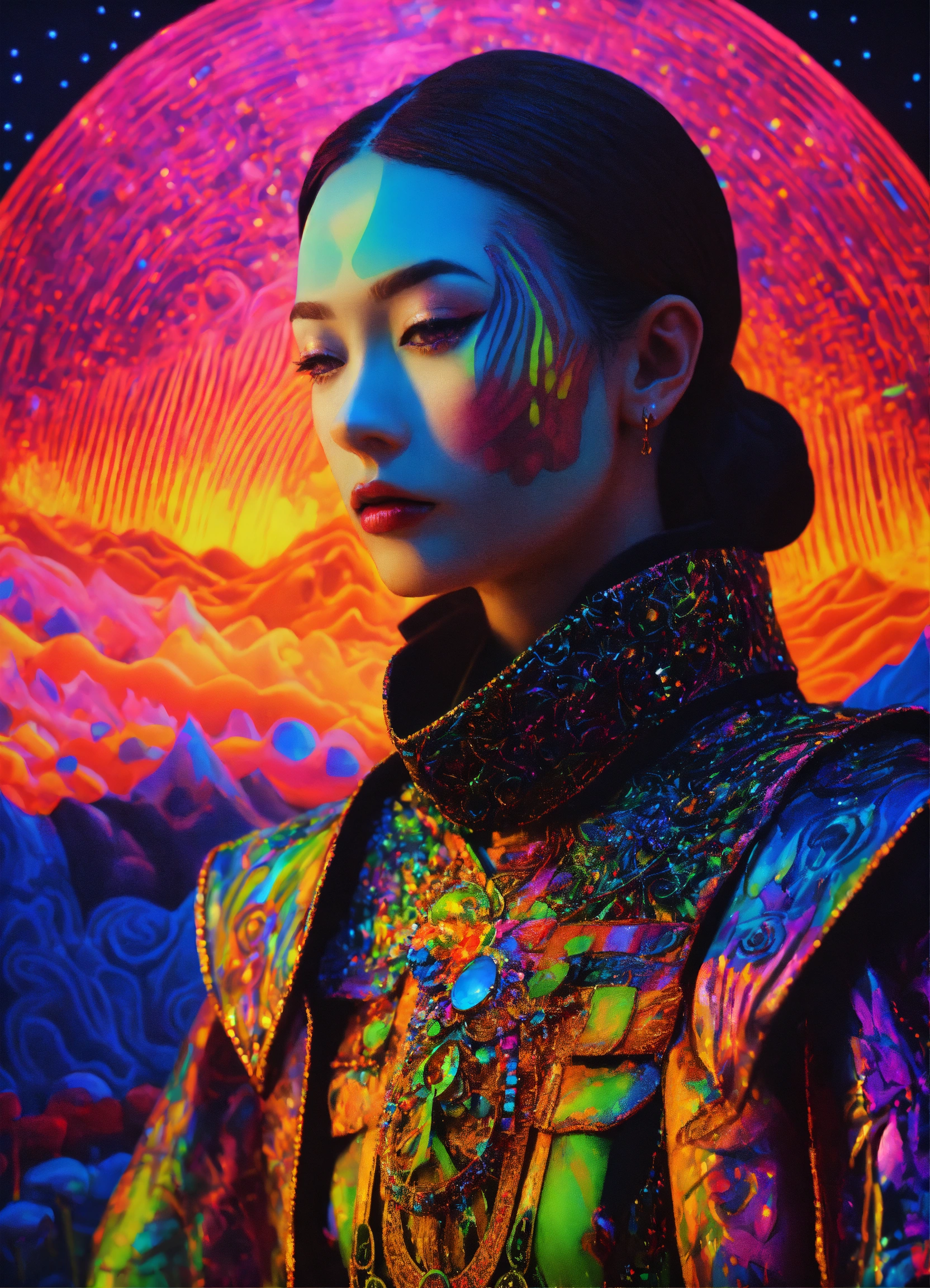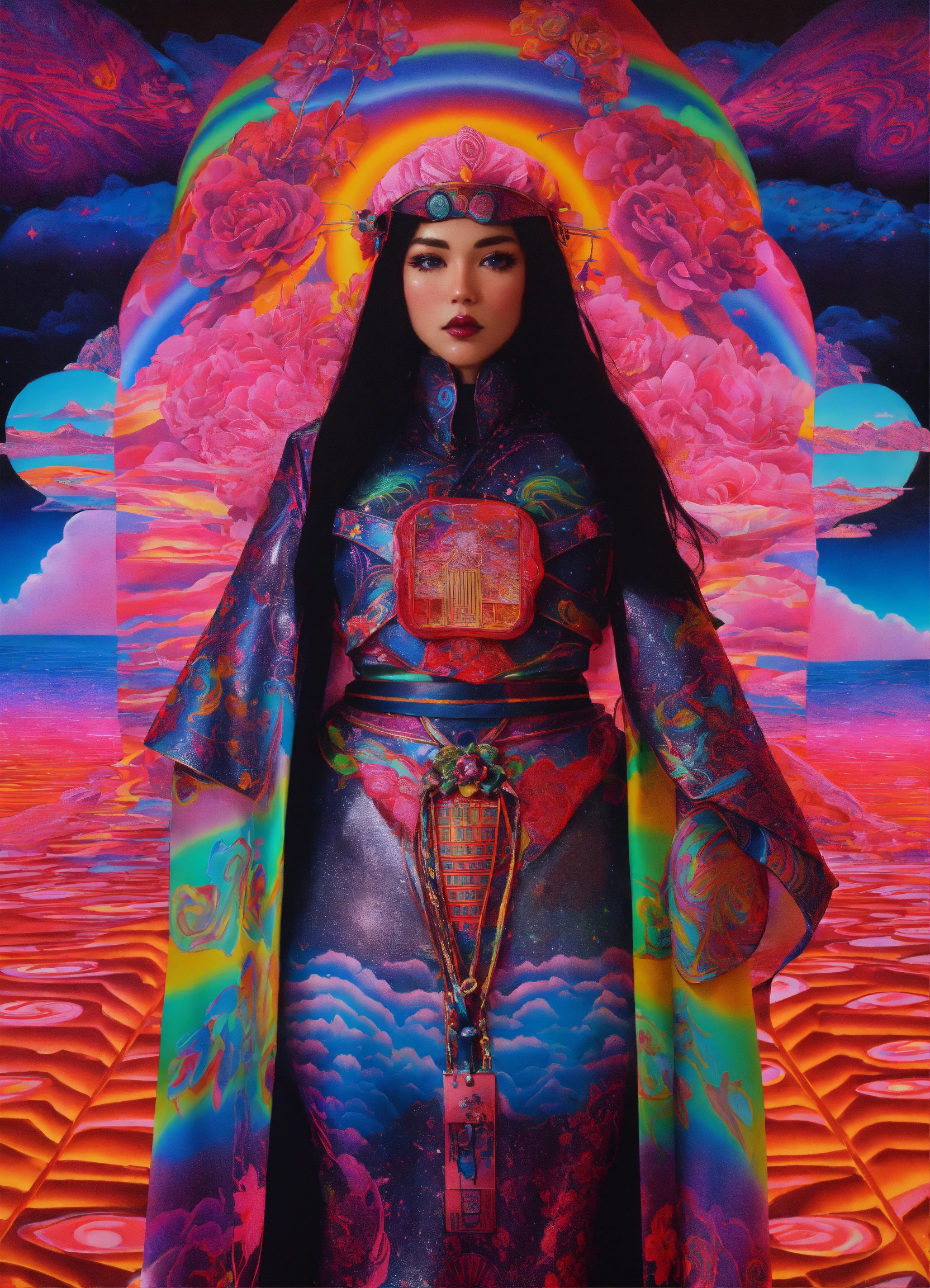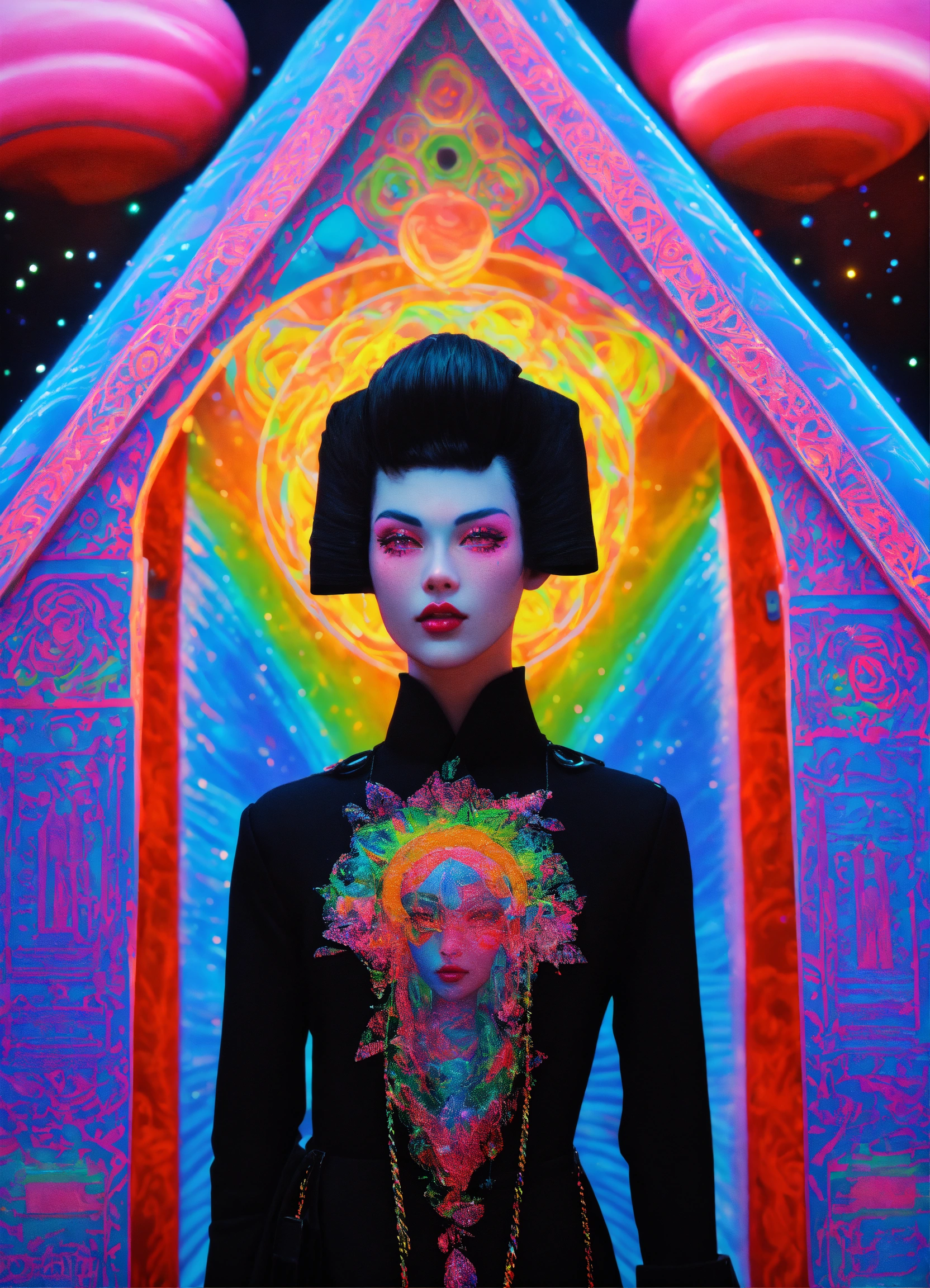Photorealistic 3d portrait of gorgeous goth emo samurai family kawaii punk rock anime folk haute couture costume, of cosmic alex grey painting in a dmt black light glitter neon black rainbow glitter holographic paris fashion night 70mm film, art by salvador dali and holy mountain the movie.